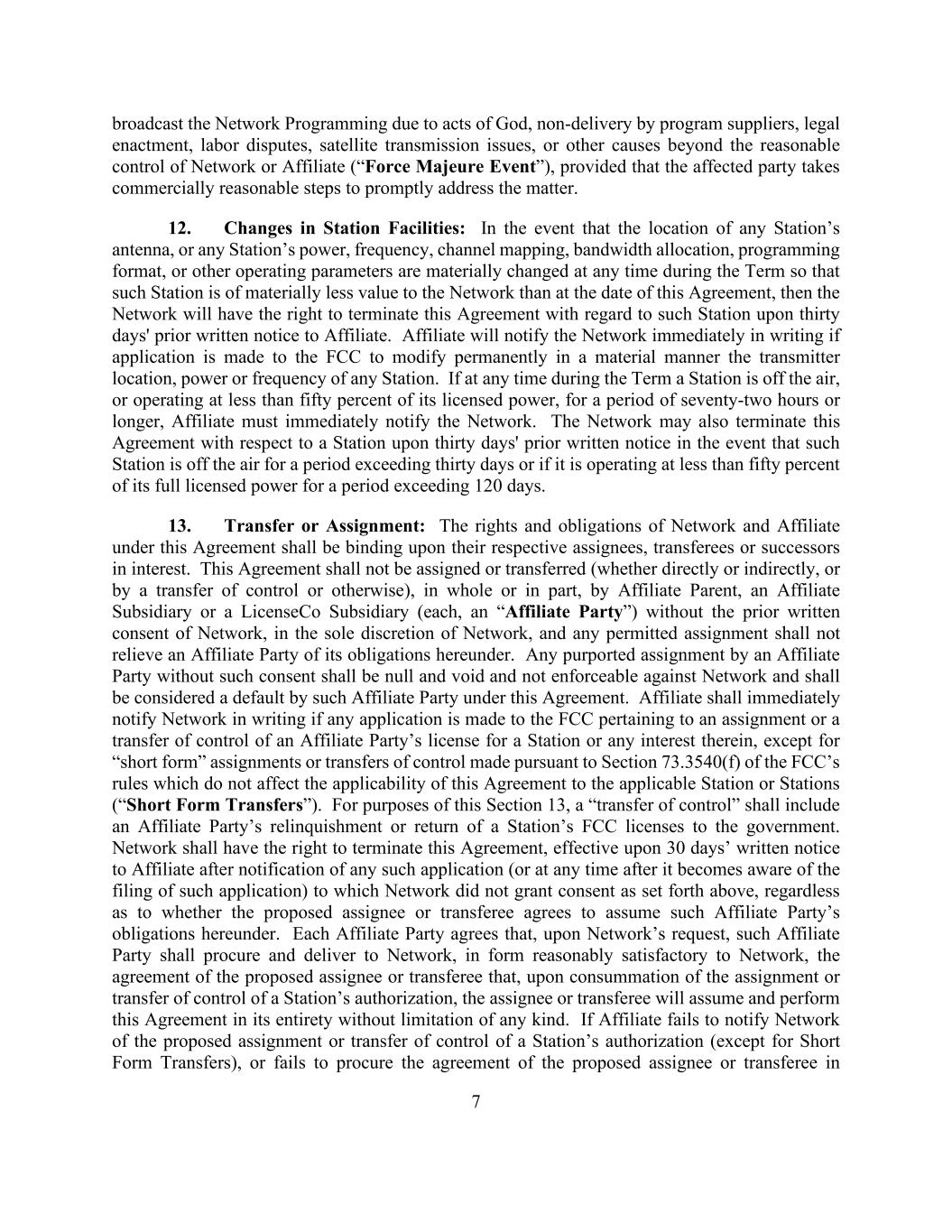 6 enactment, labor disputes, satellite transmission issues, or other causes beyond the reasonable control of Network or Affiliate (“Force Majeure Event”), provided that the affected party takes commercially reasonable steps to promptly address the matter. 12. Changes in Station Facilities: In the event that the location of any Station’s antenna, or any Station’s power, frequency, channel mapping, bandwidth allocation, programming format, or other operating parameters are materially changed at any time during the Term so that such Station is of materially less value to the Network than at the date of this Agreement, then the Network will have the right to terminate this Agreement with regard to such Station upon thirty days' prior written notice to Affiliate. Affiliate will notify the Network immediately in writing if application is made to the FCC to modify permanently in a material manner the transmitter location, power or frequency of any Station. If at any time during the Term a Station is off the air, or operating at less than fifty percent of its licensed power, for a period of seventy-two hours or longer, Affiliate must immediately notify the Network. The Network may also terminate this Agreement with respect to a Station upon thirty days' prior written notice in the event that such Station is off the air for a period exceeding thirty days or if it is operating at less than fifty percent of its full licensed power for a period exceeding 120 days. 13. Transfer or Assignment: The rights and obligations of Network and Affiliate under this Agreement shall be binding upon their respective assignees, transferees or successors in interest. This Agreement shall not be assigned or transferred (whether directly or indirectly, or by a transfer of control or otherwise), in whole or in part, by Affiliate Parent, an Affiliate Subsidiary or a LicenseCo Subsidiary (each, an “Affiliate Party”) without the prior written consent of Network, in the sole discretion of Network, and any permitted assignment shall not relieve an Affiliate Party of its obligations hereunder. Any purported assignment by an Affiliate Party without such consent shall be null and void and not enforceable against Network and shall be considered a default by such Affiliate Party under this Agreement. Affiliate shall immediately notify Network in writing if any application is made to the FCC pertaining to an assignment or a transfer of control of an Affiliate Party’s license for a Station or any interest therein, except for “short form” assignments or transfers of control made pursuant to Section 73.3540(f) of the FCC’s rules which do not affect the applicability of this Agreement to the applicable Station or Stations (“Short Form Transfers”). For purposes of this Section 13, a “transfer of control” shall include an Affiliate Party’s relinquishment or return of a Station’s FCC licenses to the government. Network shall have the right to terminate this Agreement, effective upon 30 days’ written notice to Affiliate after notification of any such application (or at any time after it becomes aware of the filing of such application) to which Network did not grant consent as set forth above, regardless as to whether the proposed assignee or transferee agrees to assume such Affiliate Party’s obligations hereunder. Each Affiliate Party agrees that, upon Network’s request, such Affiliate Party shall procure and deliver to Network, in form reasonably satisfactory to Network, the agreement of the proposed assignee or transferee that, upon consummation of the assignment or transfer of control of a Station’s authorization, the assignee or transferee will assume and perform this Agreement in its entirety without limitation of any kind. If Affiliate fails to notify Network of the proposed assignment or transfer of control of a Station’s authorization (except for Short Form Transfers), or fails to procure the agreement of the proposed assignee or transferee in accordance with this Section 13, then such failure shall be deemed a material breach of this Agreement. Without limitation to any other provision of this Agreement or to any of Network’s