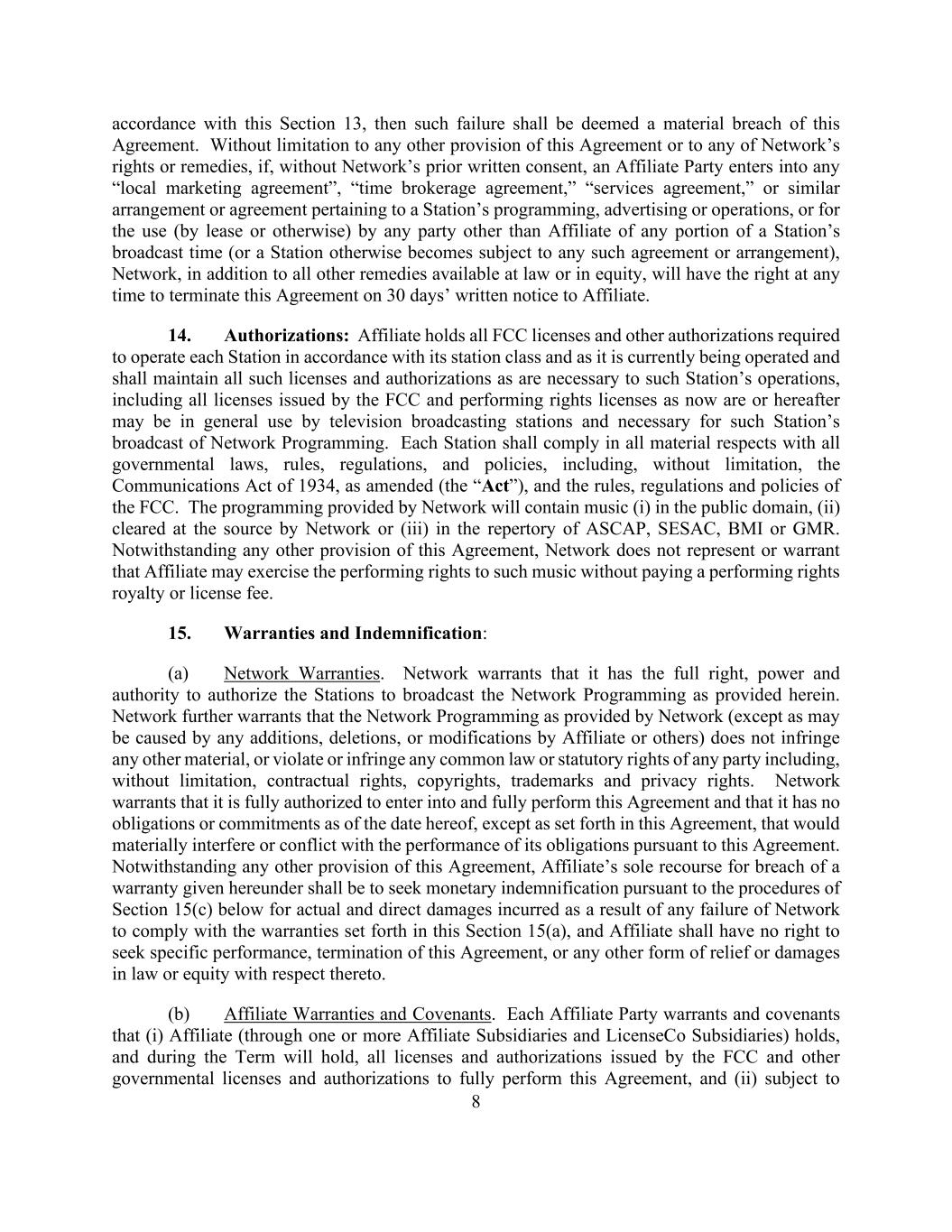 8 accordance with this Section 13, then such failure shall be deemed a material breach of this Agreement. Without limitation to any other provision of this Agreement or to any of Network’s rights or remedies, if, without Network’s prior written consent, an Affiliate Party enters into any “local marketing agreement”, “time brokerage agreement,” “services agreement,” or similar arrangement or agreement pertaining to a Station’s programming, advertising or operations, or for the use (by lease or otherwise) by any party other than Affiliate of any portion of a Station’s broadcast time (or a Station otherwise becomes subject to any such agreement or arrangement), Network, in addition to all other remedies available at law or in equity, will have the right at any time to terminate this Agreement on 30 days’ written notice to Affiliate. 14. Authorizations: Affiliate holds all FCC licenses and other authorizations required to operate each Station in accordance with its station class and as it is currently being operated and shall maintain all such licenses and authorizations as are necessary to such Station’s operations, including all licenses issued by the FCC and performing rights licenses as now are or hereafter may be in general use by television broadcasting stations and necessary for such Station’s broadcast of Network Programming. Each Station shall comply in all material respects with all governmental laws, rules, regulations, and policies, including, without limitation, the Communications Act of 1934, as amended (the “Act”), and the rules, regulations and policies of the FCC. The programming provided by Network will contain music (i) in the public domain, (ii) cleared at the source by Network or (iii) in the repertory of ASCAP, SESAC, BMI or GMR. Notwithstanding any other provision of this Agreement, Network does not represent or warrant that Affiliate may exercise the performing rights to such music without paying a performing rights royalty or license fee. 15. Warranties and Indemnification: (a) Network Warranties. Network warrants that it has the full right, power and authority to authorize the Stations to broadcast the Network Programming as provided herein. Network further warrants that the Network Programming as provided by Network (except as may be caused by any additions, deletions, or modifications by Affiliate or others) does not infringe any other material, or violate or infringe any common law or statutory rights of any party including, without limitation, contractual rights, copyrights, trademarks and privacy rights. Network warrants that it is fully authorized to enter into and fully perform this Agreement and that it has no obligations or commitments as of the date hereof, except as set forth in this Agreement, that would materially interfere or conflict with the performance of its obligations pursuant to this Agreement. Notwithstanding any other provision of this Agreement, Affiliate’s sole recourse for breach of a warranty given hereunder shall be to seek monetary indemnification pursuant to the procedures of Section 15(c) below for actual and direct damages incurred as a result of any failure of Network to comply with the warranties set forth in this Section 15(a), and Affiliate shall have no right to seek specific performance, termination of this Agreement, or any other form of relief or damages in law or equity with respect thereto. (b) Affiliate Warranties and Covenants. Each Affiliate Party warrants and covenants that (i) Affiliate (through one or more Affiliate Subsidiaries and LicenseCo Subsidiaries) holds, and during the Term will hold, all licenses and authorizations issued by the FCC and other governmental licenses and authorizations to fully perform this Agreement, and (ii) subject to