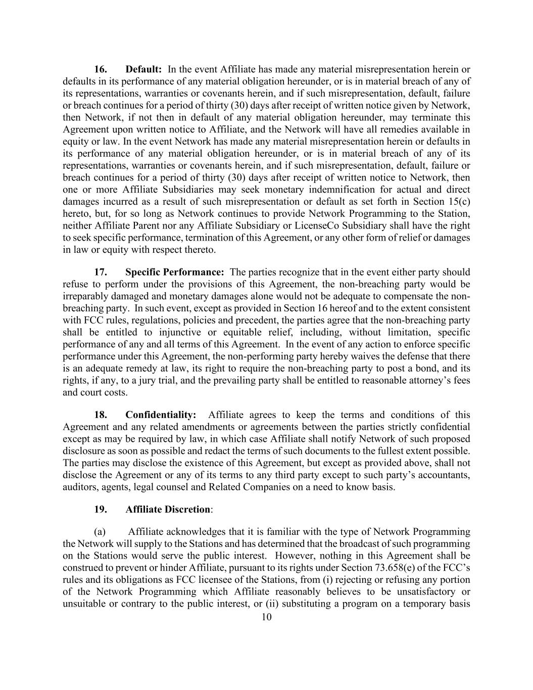 10 16. Default: In the event Affiliate has made any material misrepresentation herein or defaults in its performance of any material obligation hereunder, or is in material breach of any of its representations, warranties or covenants herein, and if such misrepresentation, default, failure or breach continues for a period of thirty (30) days after receipt of written notice given by Network, then Network, if not then in default of any material obligation hereunder, may terminate this Agreement upon written notice to Affiliate, and the Network will have all remedies available in equity or law. In the event Network has made any material misrepresentation herein or defaults in its performance of any material obligation hereunder, or is in material breach of any of its representations, warranties or covenants herein, and if such misrepresentation, default, failure or breach continues for a period of thirty (30) days after receipt of written notice to Network, then one or more Affiliate Subsidiaries may seek monetary indemnification for actual and direct damages incurred as a result of such misrepresentation or default as set forth in Section 15(c) hereto, but, for so long as Network continues to provide Network Programming to the Station, neither Affiliate Parent nor any Affiliate Subsidiary or LicenseCo Subsidiary shall have the right to seek specific performance, termination of this Agreement, or any other form of relief or damages in law or equity with respect thereto. 17. Specific Performance: The parties recognize that in the event either party should refuse to perform under the provisions of this Agreement, the non-breaching party would be irreparably damaged and monetary damages alone would not be adequate to compensate the non- breaching party. In such event, except as provided in Section 16 hereof and to the extent consistent with FCC rules, regulations, policies and precedent, the parties agree that the non-breaching party shall be entitled to injunctive or equitable relief, including, without limitation, specific performance of any and all terms of this Agreement. In the event of any action to enforce specific performance under this Agreement, the non-performing party hereby waives the defense that there is an adequate remedy at law, its right to require the non-breaching party to post a bond, and its rights, if any, to a jury trial, and the prevailing party shall be entitled to reasonable attorney’s fees and court costs. 18. Confidentiality: Affiliate agrees to keep the terms and conditions of this Agreement and any related amendments or agreements between the parties strictly confidential except as may be required by law, in which case Affiliate shall notify Network of such proposed disclosure as soon as possible and redact the terms of such documents to the fullest extent possible. The parties may disclose the existence of this Agreement, but except as provided above, shall not disclose the Agreement or any of its terms to any third party except to such party’s accountants, auditors, agents, legal counsel and Related Companies on a need to know basis. 19. Affiliate Discretion: (a) Affiliate acknowledges that it is familiar with the type of Network Programming the Network will supply to the Stations and has determined that the broadcast of such programming on the Stations would serve the public interest. However, nothing in this Agreement shall be construed to prevent or hinder Affiliate, pursuant to its rights under Section 73.658(e) of the FCC’s rules and its obligations as FCC licensee of the Stations, from (i) rejecting or refusing any portion of the Network Programming which Affiliate reasonably believes to be unsatisfactory or unsuitable or contrary to the public interest, or (ii) substituting a program on a temporary basis