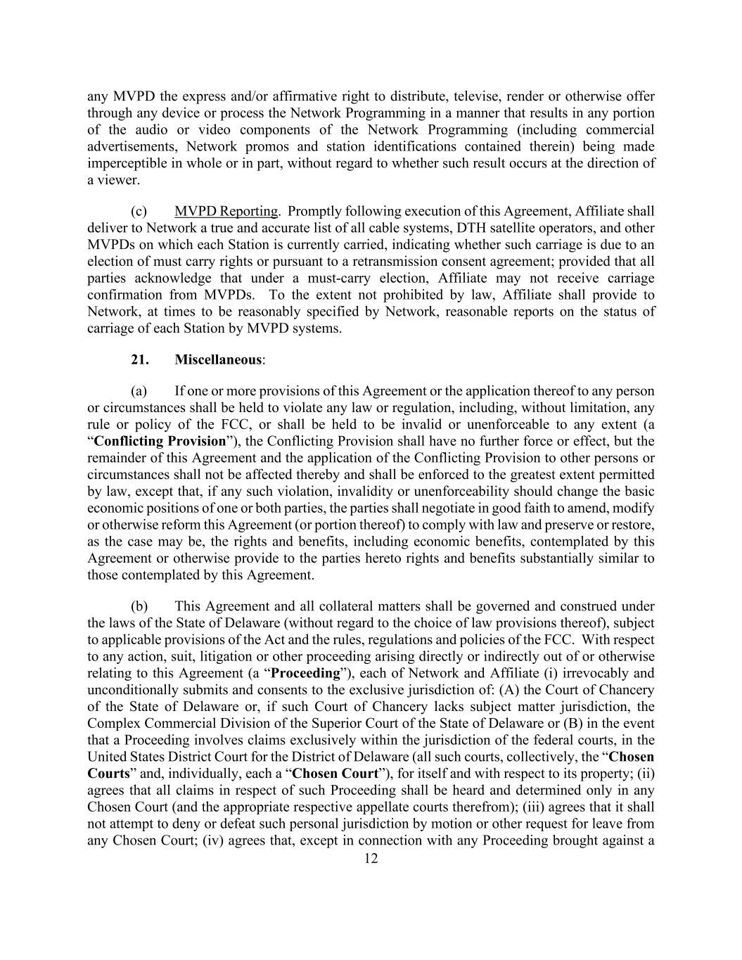12 any MVPD the express and/or affirmative right to distribute, televise, render or otherwise offer through any device or process the Network Programming in a manner that results in any portion of the audio or video components of the Network Programming (including commercial advertisements, Network promos and station identifications contained therein) being made imperceptible in whole or in part, without regard to whether such result occurs at the direction of a viewer. (c) MVPD Reporting. Promptly following execution of this Agreement, Affiliate shall deliver to Network a true and accurate list of all cable systems, DTH satellite operators, and other MVPDs on which each Station is currently carried, indicating whether such carriage is due to an election of must carry rights or pursuant to a retransmission consent agreement; provided that all parties acknowledge that under a must-carry election, Affiliate may not receive carriage confirmation from MVPDs. To the extent not prohibited by law, Affiliate shall provide to Network, at times to be reasonably specified by Network, reasonable reports on the status of carriage of each Station by MVPD systems. 21. Miscellaneous: (a) If one or more provisions of this Agreement or the application thereof to any person or circumstances shall be held to violate any law or regulation, including, without limitation, any rule or policy of the FCC, or shall be held to be invalid or unenforceable to any extent (a “Conflicting Provision”), the Conflicting Provision shall have no further force or effect, but the remainder of this Agreement and the application of the Conflicting Provision to other persons or circumstances shall not be affected thereby and shall be enforced to the greatest extent permitted by law, except that, if any such violation, invalidity or unenforceability should change the basic economic positions of one or both parties, the parties shall negotiate in good faith to amend, modify or otherwise reform this Agreement (or portion thereof) to comply with law and preserve or restore, as the case may be, the rights and benefits, including economic benefits, contemplated by this Agreement or otherwise provide to the parties hereto rights and benefits substantially similar to those contemplated by this Agreement. (b) This Agreement and all collateral matters shall be governed and construed under the laws of the State of Delaware (without regard to the choice of law provisions thereof), subject to applicable provisions of the Act and the rules, regulations and policies of the FCC. With respect to any action, suit, litigation or other proceeding arising directly or indirectly out of or otherwise relating to this Agreement (a “Proceeding”), each of Network and Affiliate (i) irrevocably and unconditionally submits and consents to the exclusive jurisdiction of: (A) the Court of Chancery of the State of Delaware or, if such Court of Chancery lacks subject matter jurisdiction, the Complex Commercial Division of the Superior Court of the State of Delaware or (B) in the event that a Proceeding involves claims exclusively within the jurisdiction of the federal courts, in the United States District Court for the District of Delaware (all such courts, collectively, the “Chosen Courts” and, individually, each a “Chosen Court”), for itself and with respect to its property; (ii) agrees that all claims in respect of such Proceeding shall be heard and determined only in any Chosen Court (and the appropriate respective appellate courts therefrom); (iii) agrees that it shall not attempt to deny or defeat such personal jurisdiction by motion or other request for leave from any Chosen Court; (iv) agrees that, except in connection with any Proceeding brought against a