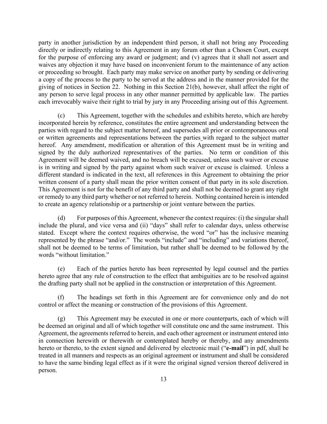 13 party in another jurisdiction by an independent third person, it shall not bring any Proceeding directly or indirectly relating to this Agreement in any forum other than a Chosen Court, except for the purpose of enforcing any award or judgment; and (v) agrees that it shall not assert and waives any objection it may have based on inconvenient forum to the maintenance of any action or proceeding so brought. Each party may make service on another party by sending or delivering a copy of the process to the party to be served at the address and in the manner provided for the giving of notices in Section 22. Nothing in this Section 21(b), however, shall affect the right of any person to serve legal process in any other manner permitted by applicable law. The parties each irrevocably waive their right to trial by jury in any Proceeding arising out of this Agreement. (c) This Agreement, together with the schedules and exhibits hereto, which are hereby incorporated herein by reference, constitutes the entire agreement and understanding between the parties with regard to the subject matter hereof, and supersedes all prior or contemporaneous oral or written agreements and representations between the parties with regard to the subject matter hereof. Any amendment, modification or alteration of this Agreement must be in writing and signed by the duly authorized representatives of the parties. No term or condition of this Agreement will be deemed waived, and no breach will be excused, unless such waiver or excuse is in writing and signed by the party against whom such waiver or excuse is claimed. Unless a different standard is indicated in the text, all references in this Agreement to obtaining the prior written consent of a party shall mean the prior written consent of that party in its sole discretion. This Agreement is not for the benefit of any third party and shall not be deemed to grant any right or remedy to any third party whether or not referred to herein. Nothing contained herein is intended to create an agency relationship or a partnership or joint venture between the parties. (d) For purposes of this Agreement, whenever the context requires: (i) the singular shall include the plural, and vice versa and (ii) “days” shall refer to calendar days, unless otherwise stated. Except where the context requires otherwise, the word “or” has the inclusive meaning represented by the phrase “and/or.” The words “include” and “including” and variations thereof, shall not be deemed to be terms of limitation, but rather shall be deemed to be followed by the words “without limitation.” (e) Each of the parties hereto has been represented by legal counsel and the parties hereto agree that any rule of construction to the effect that ambiguities are to be resolved against the drafting party shall not be applied in the construction or interpretation of this Agreement. (f) The headings set forth in this Agreement are for convenience only and do not control or affect the meaning or construction of the provisions of this Agreement. (g) This Agreement may be executed in one or more counterparts, each of which will be deemed an original and all of which together will constitute one and the same instrument. This Agreement, the agreements referred to herein, and each other agreement or instrument entered into in connection herewith or therewith or contemplated hereby or thereby, and any amendments hereto or thereto, to the extent signed and delivered by electronic mail (“e-mail”) in pdf, shall be treated in all manners and respects as an original agreement or instrument and shall be considered to have the same binding legal effect as if it were the original signed version thereof delivered in person.