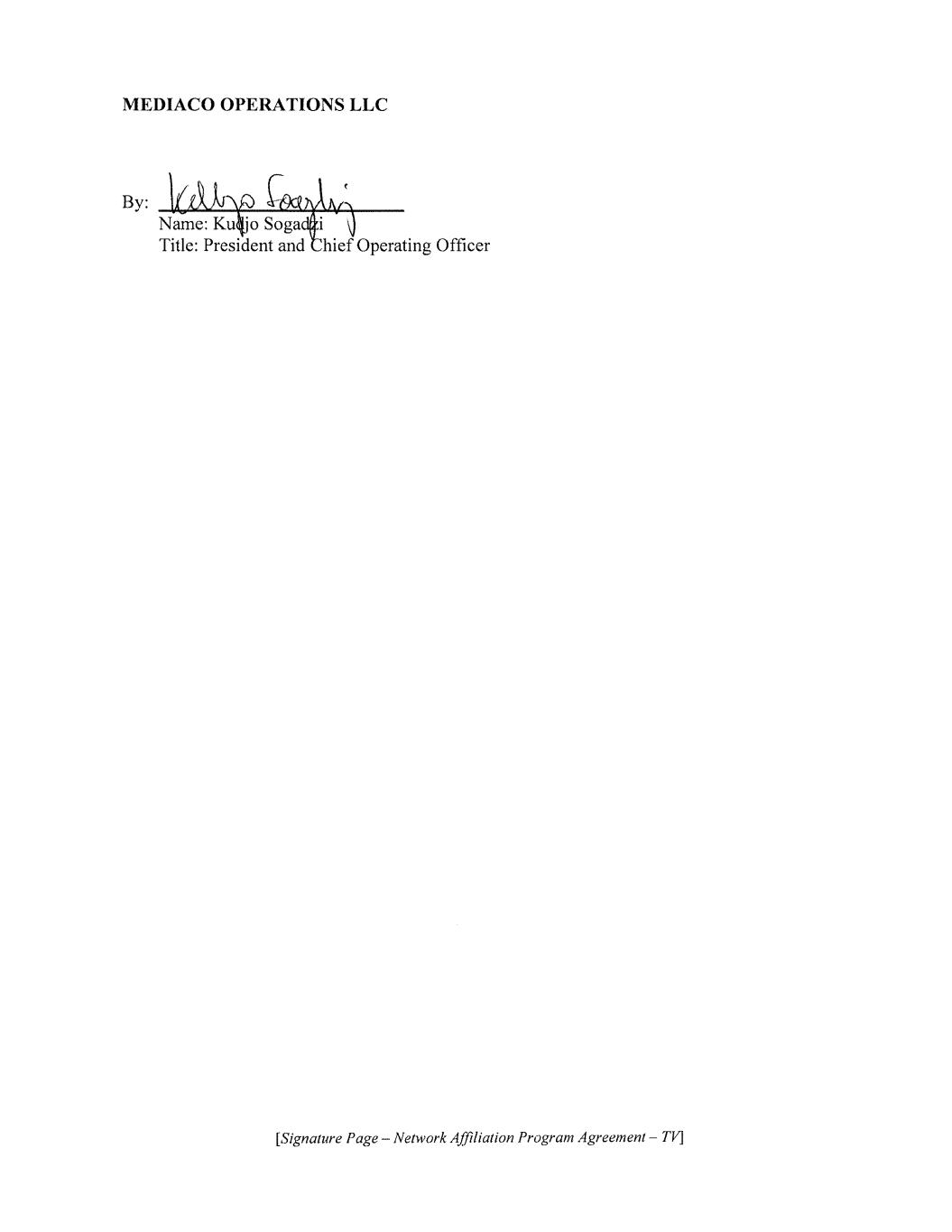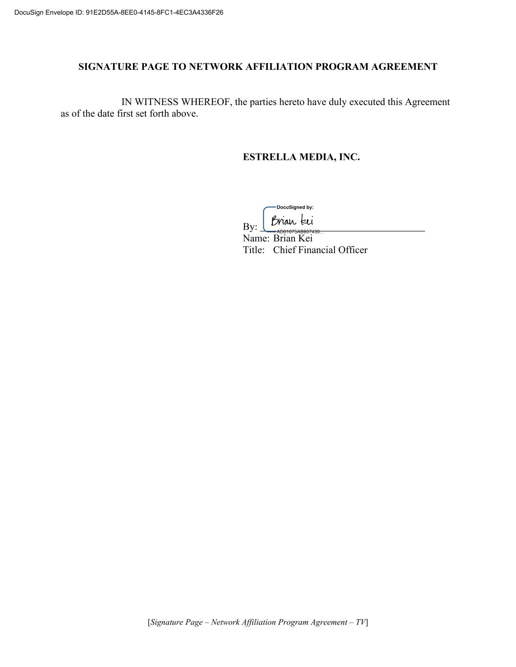 [Signature Page – Network Affiliation Program Agreement – TV] SIGNATURE PAGE TO NETWORK AFFILIATION PROGRAM AGREEMENT IN WITNESS WHEREOF, the parties hereto have duly executed this Agreement as of the date first set forth above. ESTRELLA MEDIA, INC. By: Name: Brian Kei Title: Chief Financial Officer DocuSign Envelope ID: 91E2D55A-8EE0-4145-8FC1-4EC3A4336F26
