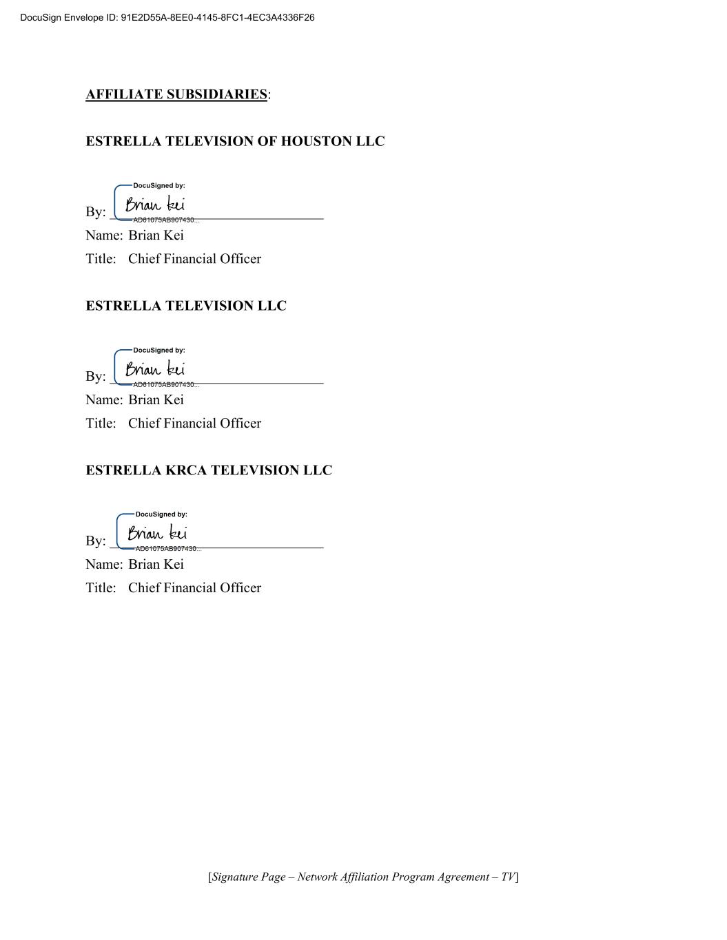 [Signature Page – Network Affiliation Program Agreement – TV] AFFILIATE SUBSIDIARIES: ESTRELLA TELEVISION OF HOUSTON LLC By: ______________________________ Name: Brian Kei Title: Chief Financial Officer ESTRELLA TELEVISION LLC By: ______________________________ Name: Brian Kei Title: Chief Financial Officer ESTRELLA KRCA TELEVISION LLC By: ______________________________ Name: Brian Kei Title: Chief Financial Officer DocuSign Envelope ID: 91E2D55A-8EE0-4145-8FC1-4EC3A4336F26