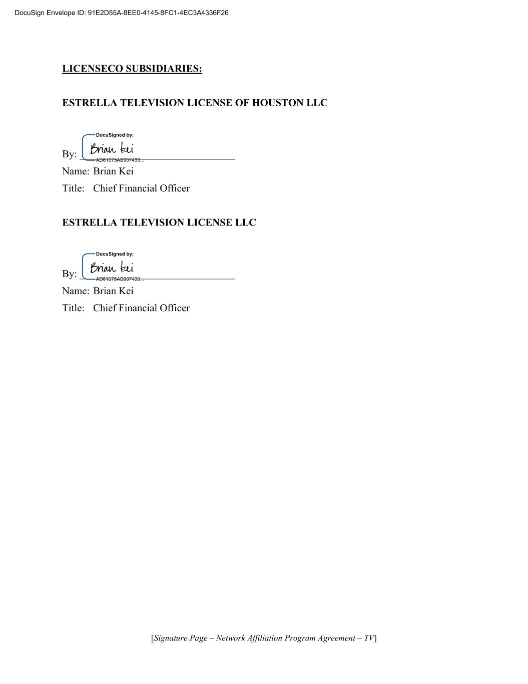[Signature Page – Network Affiliation Program Agreement – TV] LICENSECO SUBSIDIARIES: ESTRELLA TELEVISION LICENSE OF HOUSTON LLC By: ______________________________ Name: Brian Kei Title: Chief Financial Officer ESTRELLA TELEVISION LICENSE LLC By: ______________________________ Name: Brian Kei Title: Chief Financial Officer DocuSign Envelope ID: 91E2D55A-8EE0-4145-8FC1-4EC3A4336F26