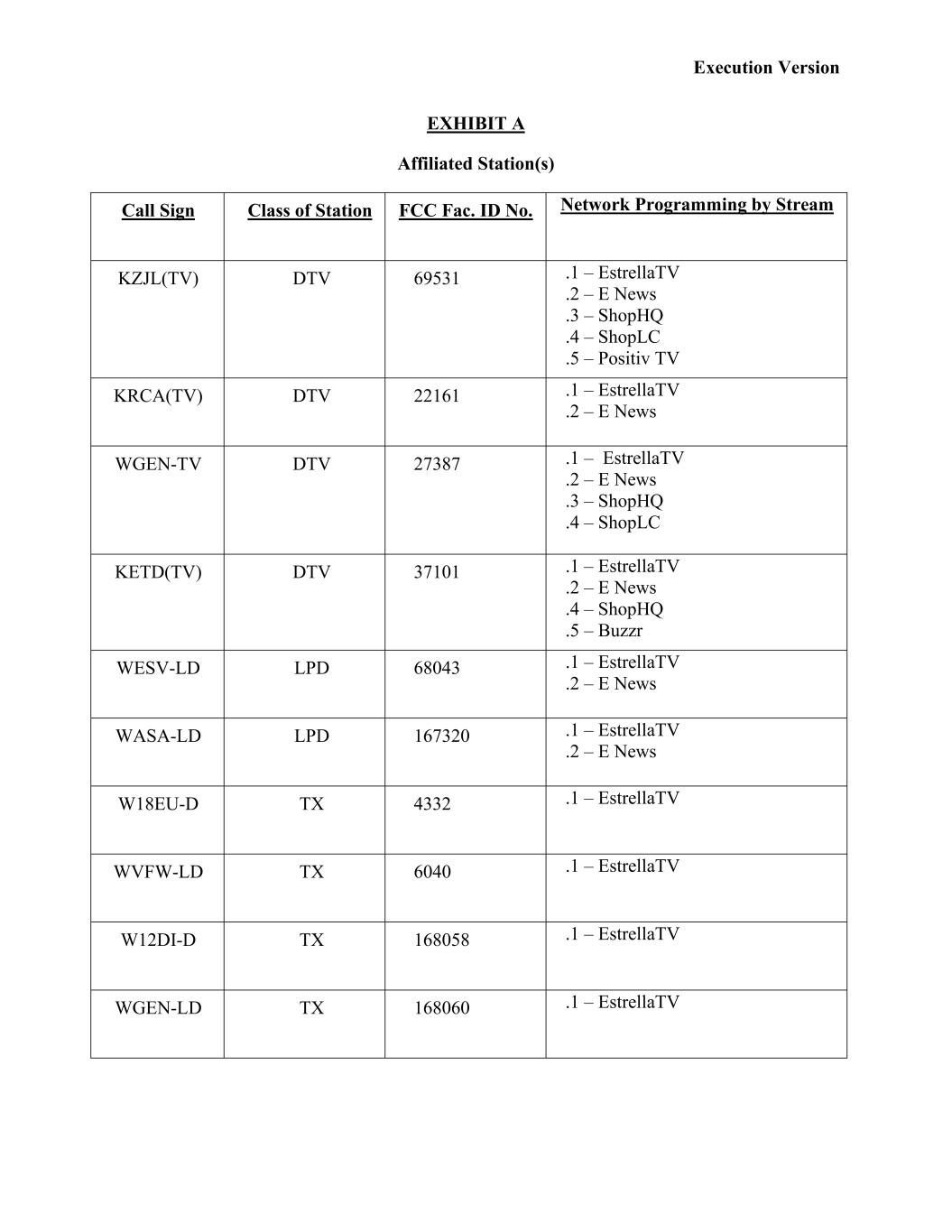 Execution Version EXHIBIT A Affiliated Station(s) Call Sign Class of Station FCC Fac. ID No. Network Programming by Stream KZJL(TV) DTV 69531 .1 – EstrellaTV .2 – E News .3 – ShopHQ .4 – ShopLC .5 – Positiv TV KRCA(TV) DTV 22161 .1 – EstrellaTV .2 – E News WGEN-TV DTV 27387 .1 – EstrellaTV .2 – E News .3 – ShopHQ .4 – ShopLC KETD(TV) DTV 37101 .1 – EstrellaTV .2 – E News .4 – ShopHQ .5 – Buzzr WESV-LD LPD 68043 .1 – EstrellaTV .2 – E News WASA-LD LPD 167320 .1 – EstrellaTV .2 – E News W18EU-D TX 4332 .1 – EstrellaTV WVFW-LD TX 6040 .1 – EstrellaTV W12DI-D TX 168058 .1 – EstrellaTV WGEN-LD TX 168060 .1 – EstrellaTV