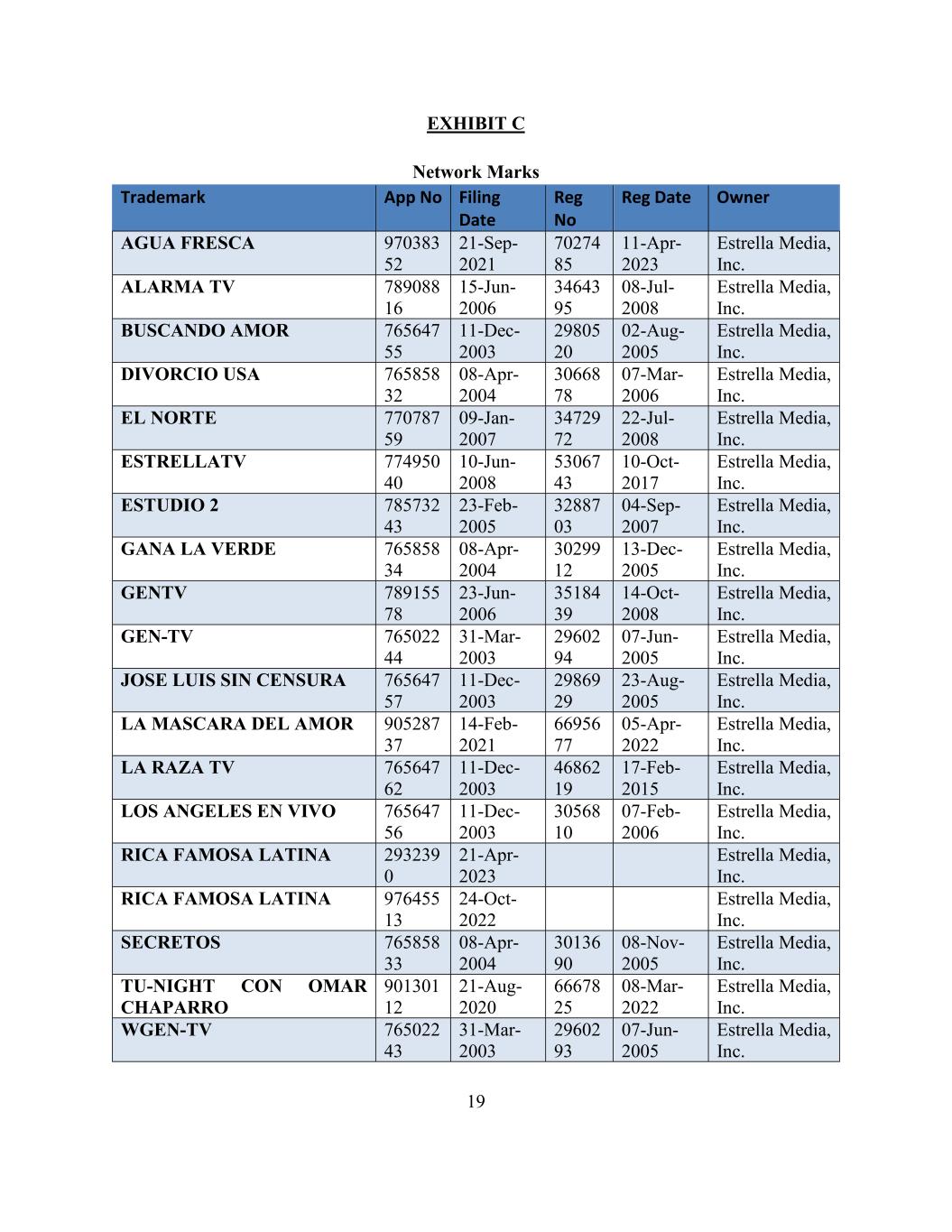 19 EXHIBIT C Network Marks Trademark App No Filing Date Reg No Reg Date Owner AGUA FRESCA 970383 52 21-Sep- 2021 70274 85 11-Apr- 2023 Estrella Media, Inc. ALARMA TV 789088 16 15-Jun- 2006 34643 95 08-Jul- 2008 Estrella Media, Inc. BUSCANDO AMOR 765647 55 11-Dec- 2003 29805 20 02-Aug- 2005 Estrella Media, Inc. DIVORCIO USA 765858 32 08-Apr- 2004 30668 78 07-Mar- 2006 Estrella Media, Inc. EL NORTE 770787 59 09-Jan- 2007 34729 72 22-Jul- 2008 Estrella Media, Inc. ESTRELLATV 774950 40 10-Jun- 2008 53067 43 10-Oct- 2017 Estrella Media, Inc. ESTUDIO 2 785732 43 23-Feb- 2005 32887 03 04-Sep- 2007 Estrella Media, Inc. GANA LA VERDE 765858 34 08-Apr- 2004 30299 12 13-Dec- 2005 Estrella Media, Inc. GENTV 789155 78 23-Jun- 2006 35184 39 14-Oct- 2008 Estrella Media, Inc. GEN-TV 765022 44 31-Mar- 2003 29602 94 07-Jun- 2005 Estrella Media, Inc. JOSE LUIS SIN CENSURA 765647 57 11-Dec- 2003 29869 29 23-Aug- 2005 Estrella Media, Inc. LA MASCARA DEL AMOR 905287 37 14-Feb- 2021 66956 77 05-Apr- 2022 Estrella Media, Inc. LA RAZA TV 765647 62 11-Dec- 2003 46862 19 17-Feb- 2015 Estrella Media, Inc. LOS ANGELES EN VIVO 765647 56 11-Dec- 2003 30568 10 07-Feb- 2006 Estrella Media, Inc. RICA FAMOSA LATINA 293239 0 21-Apr- 2023 Estrella Media, Inc. RICA FAMOSA LATINA 976455 13 24-Oct- 2022 Estrella Media, Inc. SECRETOS 765858 33 08-Apr- 2004 30136 90 08-Nov- 2005 Estrella Media, Inc. TU-NIGHT CON OMAR CHAPARRO 901301 12 21-Aug- 2020 66678 25 08-Mar- 2022 Estrella Media, Inc. WGEN-TV 765022 43 31-Mar- 2003 29602 93 07-Jun- 2005 Estrella Media, Inc.