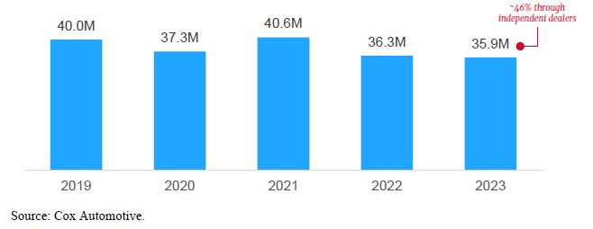 Used Car Sales. The market for used car sales in the United States is significant, comprising approximately 62% of U.S. car sales in 2023. Used car retail sales typically occur through franchised new car dealerships that sell used cars or independent used car dealerships. We operate in the Integrated Auto Sales and Finance segment of the independent used car sales and finance market. Integrated Auto Sales and Finance dealers sell and finance used cars to individuals who often have limited credit histories or past credit problems. Integrated Auto Sales and Finance dealers typically offer their customers certain advantages over more traditional financing sources, such as less restrictive underwriting guidelines, flexible payment terms (including scheduling payments on a weekly or bi-weekly basis to coincide with a customer’s payday), and the ability to make payments in person, an important feature to individuals who may not have a checking account. For the year ended December 31, 2023, there were nearly 35.9 million overall used-car sales, approximately 46% of which were facilitated through independent used car dealerships.