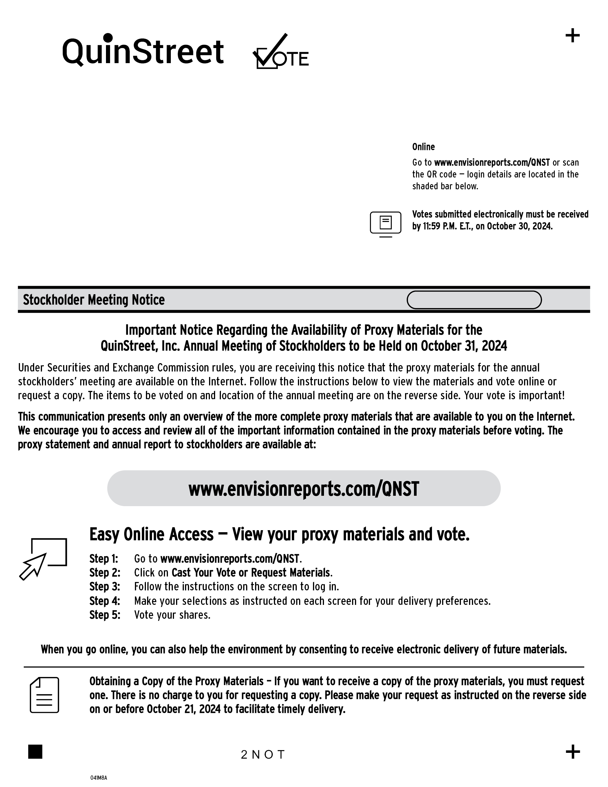 Quin Street VoTE Online Go to www.envisionreports.com/QNST or scan the QR code — login details are located in the shaded bar below. Votes submitted electronically must be received by 11:59 P.M. E.T., on October 30, 2024. Stockholder Meeting Notice Important Notice Regarding the Availability of Proxy Materials for the QuinStreet, Inc. Annual Meeting of Stockholders to be Held on October 31, 2024 Under Securities and Exchange Commission rules, you are receiving this notice that the proxy materials for the annual stockholders’ meeting are available on the Internet. Follow the instructions below to view the materials and vote online or request a copy. The items to be voted on and location of the annual meeting are on the reverse side. Your vote is important! This communication presents only an overview of the more complete proxy materials that are available to you on the Internet. We encourage you to access and review all of the important information contained in the proxy materials before voting. The proxy statement and annual report to stockholders are available at: www.envisionreports.com/QNST Easy Online Access — View your proxy materials and vote. Step 1: Go to www.envisionreports.com/QNST. Step 2: Click on Cast Your Vote or Request Materials. Step 3: Follow the instructions on the screen to log in. Step 4: Make your selections as instructed on each screen for your delivery preferences. Step 5: Vote your shares. When you go online, you can also help the environment by consenting to receive electronic delivery of future materials. Obtaining a Copy of the Proxy Materials – If you want to receive a copy of the proxy materials, you must request one. There is no charge to you for requesting a copy. Please make your request as instructed on the reverse side on or before October 21, 2024 to facilitate timely delivery.