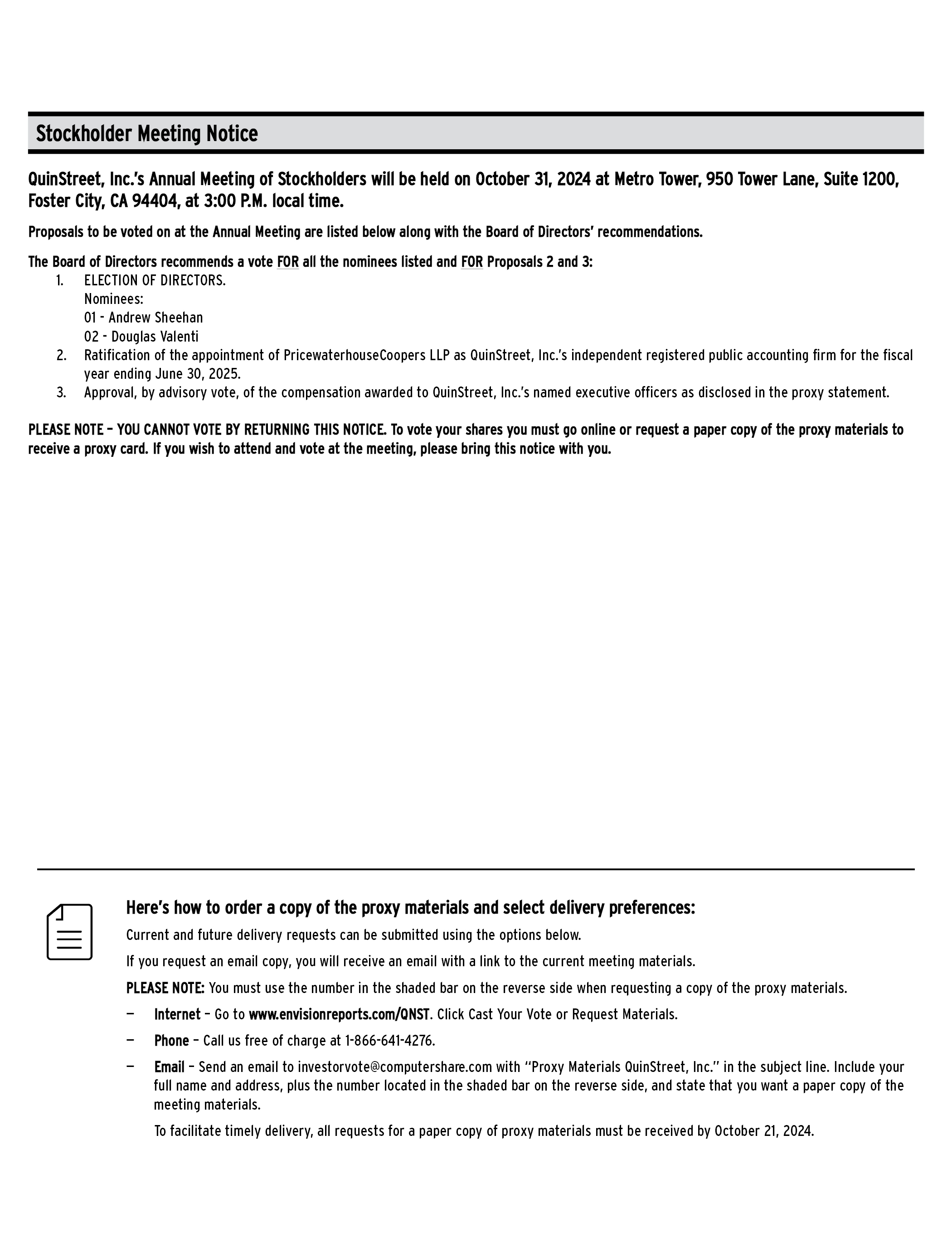 Stockholder Meeting Notice QuinStreet, Inc.’s Annual Meeting of Stockholders will be held on October 31, 2024 at Metro Tower, 950 Tower Lane, Suite 1200, Foster City, CA 94404, at 3:00 P.M. local time. Proposals to be voted on at the Annual Meeting are listed below along with the Board of Directors’ recommendations. The Board of Directors recommends a vote FOR all the nominees listed and FOR Proposals 2 and 3: 1. ELECTION OF DIRECTORS. Nominees: 01 - Andrew Sheehan 02 - Douglas Valenti 2. Ratification of the appointment of PricewaterhouseCoopers LLP as QuinStreet, Inc.’s independent registered public accounting firm for the fiscal year ending June 30, 2025. 3. Approval, by advisory vote, of the compensation awarded to QuinStreet, Inc.’s named executive officers as disclosed in the proxy statement. PLEASE NOTE – YOU CANNOT VOTE BY RETURNING THIS NOTICE. To vote your shares you must go online or request a paper copy of the proxy materials to receive a proxy card. If you wish to attend and vote at the meeting, please bring this notice with you. Here’s how to order a copy of the proxy materials and select delivery preferences: Current and future delivery requests can be submitted using the options below. If you request an email copy, you will receive an email with a link to the current meeting materials. PLEASE NOTE: You must use the number in the shaded bar on the reverse side when requesting a copy of the proxy materials. — Internet – Go to www.envisionreports.com/QNST. Click Cast Your Vote or Request Materials. — Phone – Call us free of charge at 1-866-641-4276. — Email – Send an email to investorvote@computershare.com with “Proxy Materials QuinStreet, Inc.” in the subject line. Include your full name and address, plus the number located in the shaded bar on the reverse side, and state that you want a paper copy of the meeting materials. To facilitate timely delivery, all requests for a paper copy of proxy materials must be received by October 21, 2024.