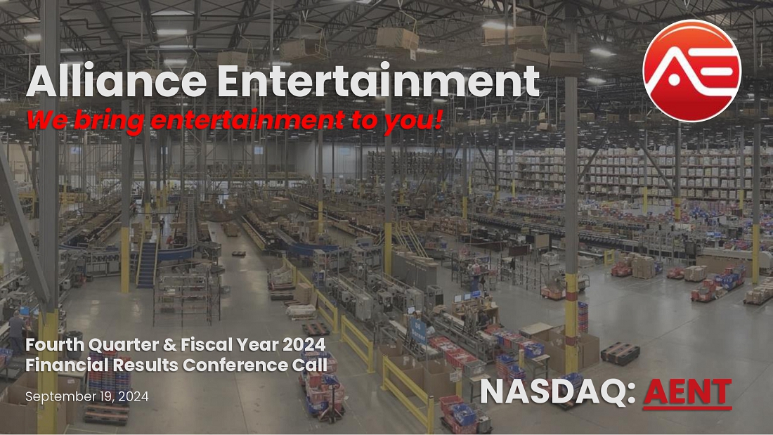 PLANTATION, Fla., September 19, 2024 (GLOBE NEWSWIRE) — Alliance Entertainment Holding Corporation (Nasdaq: AENT), a global distributor and wholesaler specializing in music, movies, video games, electronics, arcades, toys, and collectibles, reported its financial and operational results for the fourth quarter and fiscal year ended June 30, 2024.