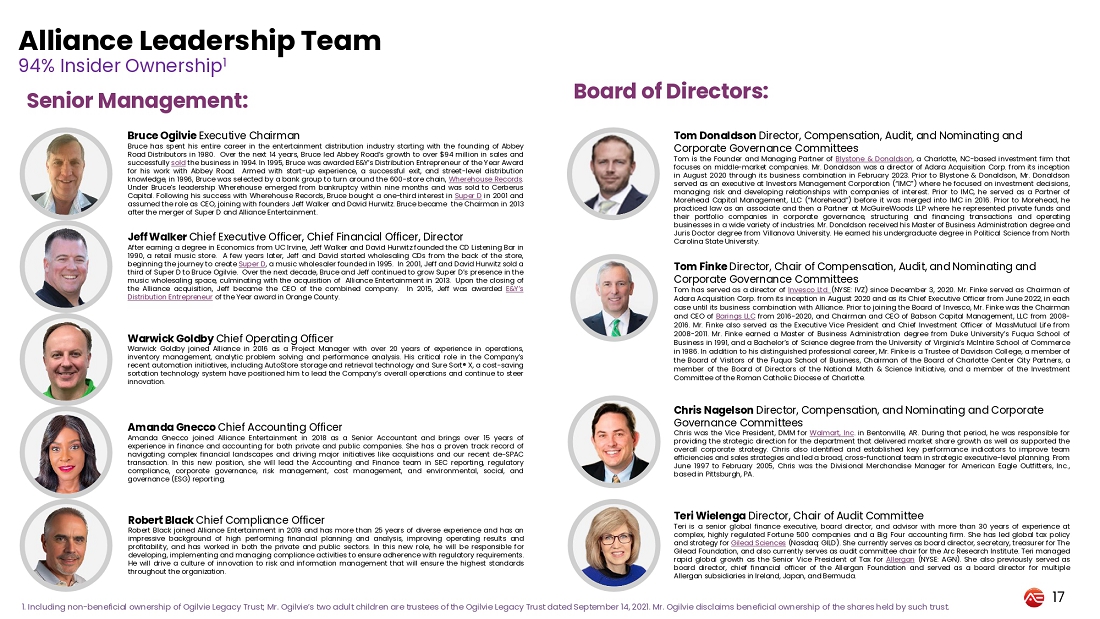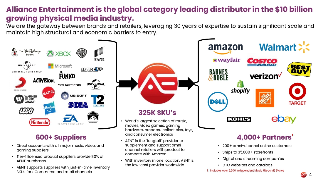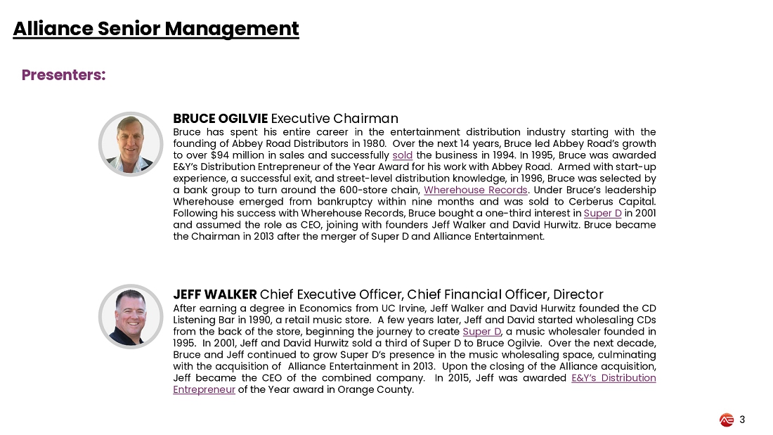 Alliance Entertainment Executive Chairman Bruce Ogilvie and CEO and CFO Jeff Walker will host the conference call, which will be followed by a question-and-answer session. A presentation will accompany the call and can be viewed during the webcast or accessed via the investor relations section of the Company’s website here.