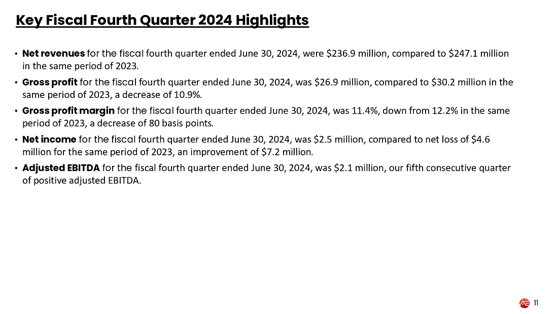 | ● | Gross profit margin for the fiscal year ended June 30, 2024, was 11.7%, up from 9.0% in fiscal year 2023, an increase of 270 basis points. | |