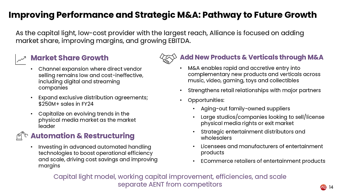 “With a disciplined approach to reducing expenses, lowering debt, and optimizing inventory management, we are confident in our ability to continue improving EBITDA and inventory turns in the year ahead. Demand for physical music, particularly vinyl and CD sales, remains strong, and we are excited about major upcoming releases and opportunities in this space. As we continue executing our strategy, we believe Alliance Entertainment is operating from a strong foundation that positions us to effectively capitalize on new opportunities and deliver sustained value to both our customers and shareholders,” concluded Walker.
