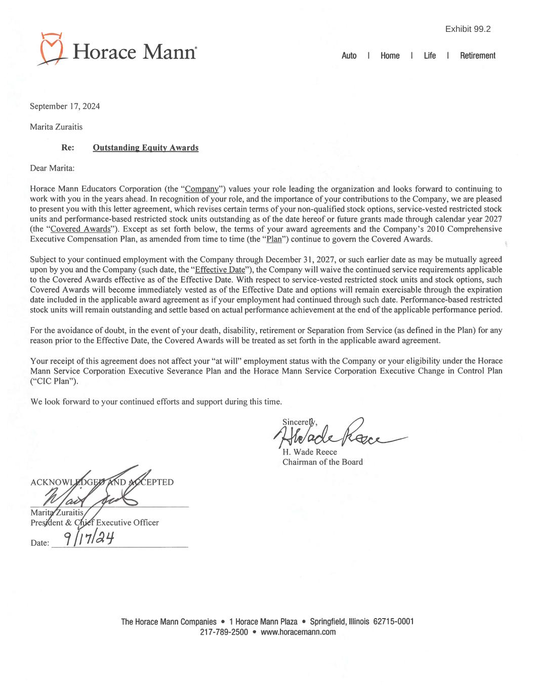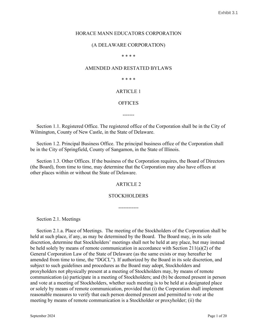 September 2024 Page 1 of 20 HORACE MANN EDUCATORS CORPORATION (A DELAWARE CORPORATION) * * * * AMENDED AND RESTATED BYLAWS * * * * ARTICLE 1 OFFICES ------- Section 1.1. Registered Office. The registered office of the Corporation shall be in the City of Wilmington, County of New Castle, in the State of Delaware. Section 1.2. Principal Business Office. The principal business office of the Corporation shall be in the City of Springfield, County of Sangamon, in the State of Illinois. Section 1.3. Other Offices. If the business of the Corporation requires, the Board of Directors (the Board), from time to time, may determine that the Corporation may also have offices at other places within or without the State of Delaware. ARTICLE 2 STOCKHOLDERS ------------ Section 2.1. Meetings Section 2.1.a. Place of Meetings. The meeting of the Stockholders of the Corporation shall be held at such place, if any, as may be determined by the Board. The Board may, in its sole discretion, determine that Stockholders’ meetings shall not be held at any place, but may instead be held solely by means of remote communication in accordance with Section 211(a)(2) of the General Corporation Law of the State of Delaware (as the same exists or may hereafter be amended from time to time, the “DGCL”). If authorized by the Board in its sole discretion, and subject to such guidelines and procedures as the Board may adopt, Stockholders and proxyholders not physically present at a meeting of Stockholders may, by means of remote communication (a) participate in a meeting of Stockholders; and (b) be deemed present in person and vote at a meeting of Stockholders, whether such meeting is to be held at a designated place or solely by means of remote communication, provided that (i) the Corporation shall implement reasonable measures to verify that each person deemed present and permitted to vote at the meeting by means of remote communication is a Stockholder or proxyholder; (ii) the