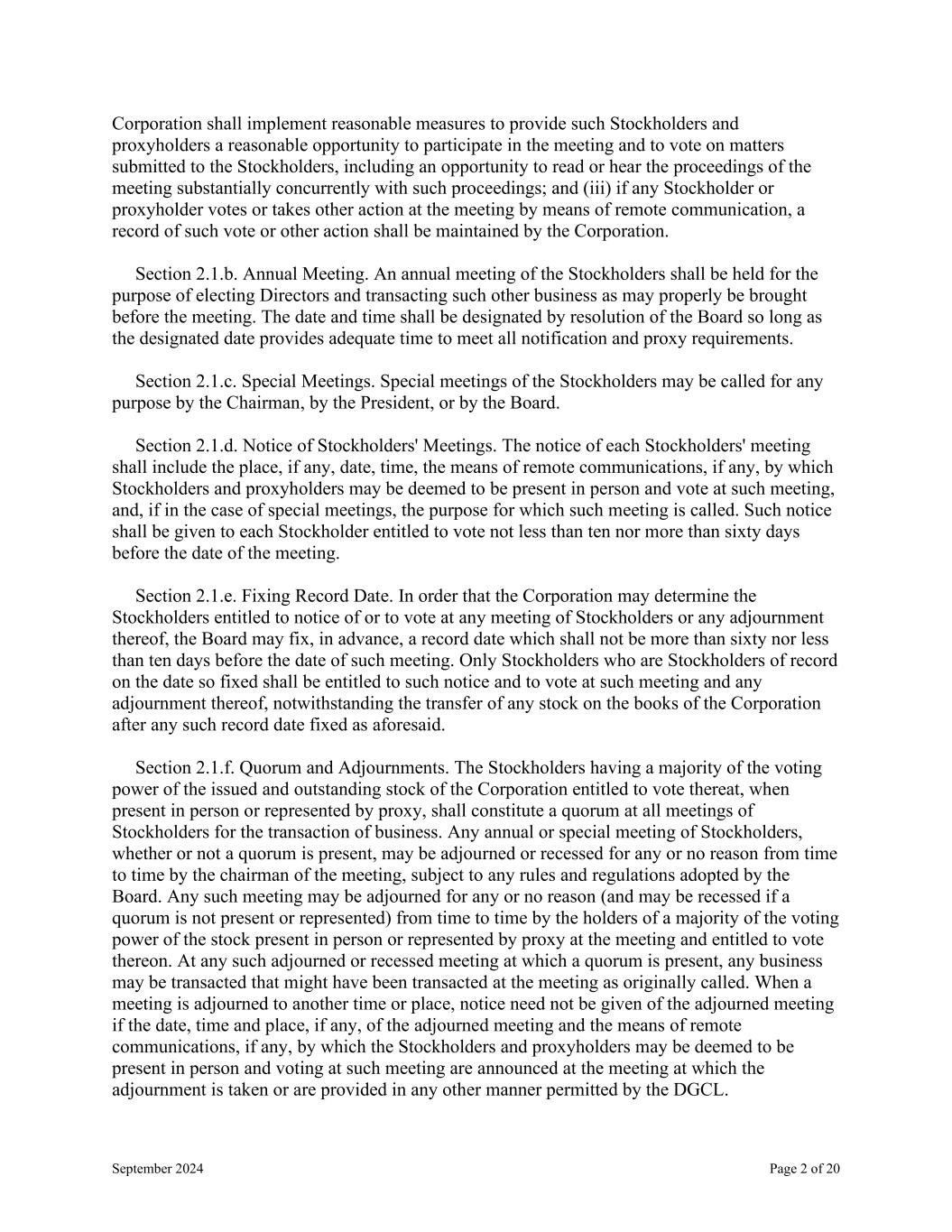 September 2024 Page 2 of 20 Corporation shall implement reasonable measures to provide such Stockholders and proxyholders a reasonable opportunity to participate in the meeting and to vote on matters submitted to the Stockholders, including an opportunity to read or hear the proceedings of the meeting substantially concurrently with such proceedings; and (iii) if any Stockholder or proxyholder votes or takes other action at the meeting by means of remote communication, a record of such vote or other action shall be maintained by the Corporation. Section 2.1.b. Annual Meeting. An annual meeting of the Stockholders shall be held for the purpose of electing Directors and transacting such other business as may properly be brought before the meeting. The date and time shall be designated by resolution of the Board so long as the designated date provides adequate time to meet all notification and proxy requirements. Section 2.1.c. Special Meetings. Special meetings of the Stockholders may be called for any purpose by the Chairman, by the President, or by the Board. Section 2.1.d. Notice of Stockholders' Meetings. The notice of each Stockholders' meeting shall include the place, if any, date, time, the means of remote communications, if any, by which Stockholders and proxyholders may be deemed to be present in person and vote at such meeting, and, if in the case of special meetings, the purpose for which such meeting is called. Such notice shall be given to each Stockholder entitled to vote not less than ten nor more than sixty days before the date of the meeting. Section 2.1.e. Fixing Record Date. In order that the Corporation may determine the Stockholders entitled to notice of or to vote at any meeting of Stockholders or any adjournment thereof, the Board may fix, in advance, a record date which shall not be more than sixty nor less than ten days before the date of such meeting. Only Stockholders who are Stockholders of record on the date so fixed shall be entitled to such notice and to vote at such meeting and any adjournment thereof, notwithstanding the transfer of any stock on the books of the Corporation after any such record date fixed as aforesaid. Section 2.1.f. Quorum and Adjournments. The Stockholders having a majority of the voting power of the issued and outstanding stock of the Corporation entitled to vote thereat, when present in person or represented by proxy, shall constitute a quorum at all meetings of Stockholders for the transaction of business. Any annual or special meeting of Stockholders, whether or not a quorum is present, may be adjourned or recessed for any or no reason from time to time by the chairman of the meeting, subject to any rules and regulations adopted by the Board. Any such meeting may be adjourned for any or no reason (and may be recessed if a quorum is not present or represented) from time to time by the holders of a majority of the voting power of the stock present in person or represented by proxy at the meeting and entitled to vote thereon. At any such adjourned or recessed meeting at which a quorum is present, any business may be transacted that might have been transacted at the meeting as originally called. When a meeting is adjourned to another time or place, notice need not be given of the adjourned meeting if the date, time and place, if any, of the adjourned meeting and the means of remote communications, if any, by which the Stockholders and proxyholders may be deemed to be present in person and voting at such meeting are announced at the meeting at which the adjournment is taken or are provided in any other manner permitted by the DGCL.