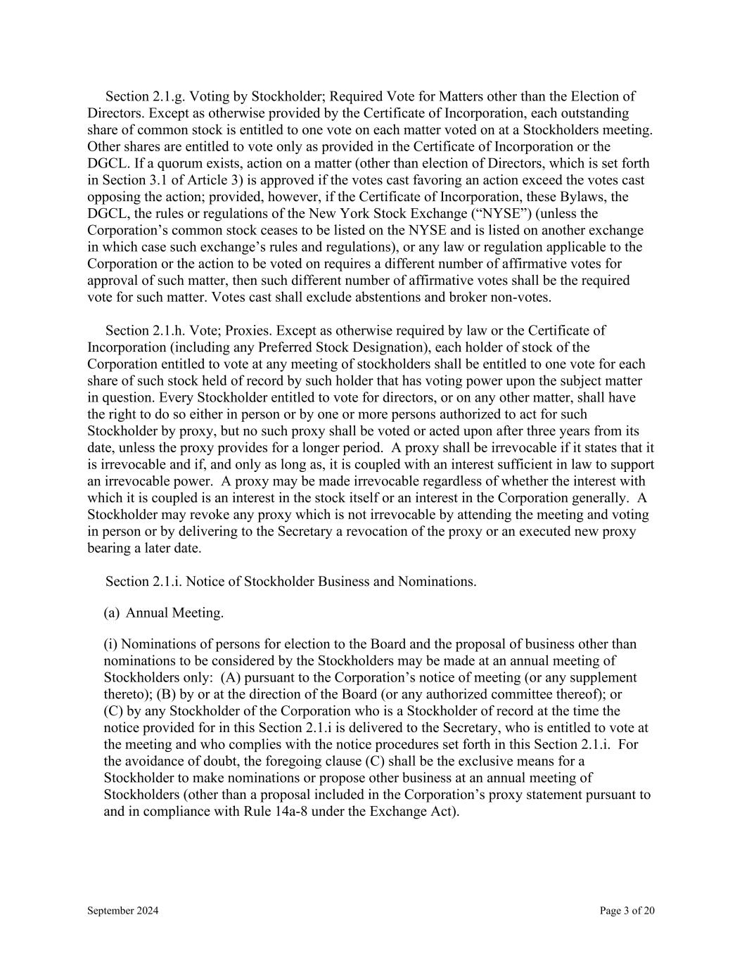 September 2024 Page 3 of 20 Section 2.1.g. Voting by Stockholder; Required Vote for Matters other than the Election of Directors. Except as otherwise provided by the Certificate of Incorporation, each outstanding share of common stock is entitled to one vote on each matter voted on at a Stockholders meeting. Other shares are entitled to vote only as provided in the Certificate of Incorporation or the DGCL. If a quorum exists, action on a matter (other than election of Directors, which is set forth in Section 3.1 of Article 3) is approved if the votes cast favoring an action exceed the votes cast opposing the action; provided, however, if the Certificate of Incorporation, these Bylaws, the DGCL, the rules or regulations of the New York Stock Exchange (“NYSE”) (unless the Corporation’s common stock ceases to be listed on the NYSE and is listed on another exchange in which case such exchange’s rules and regulations), or any law or regulation applicable to the Corporation or the action to be voted on requires a different number of affirmative votes for approval of such matter, then such different number of affirmative votes shall be the required vote for such matter. Votes cast shall exclude abstentions and broker non-votes. Section 2.1.h. Vote; Proxies. Except as otherwise required by law or the Certificate of Incorporation (including any Preferred Stock Designation), each holder of stock of the Corporation entitled to vote at any meeting of stockholders shall be entitled to one vote for each share of such stock held of record by such holder that has voting power upon the subject matter in question. Every Stockholder entitled to vote for directors, or on any other matter, shall have the right to do so either in person or by one or more persons authorized to act for such Stockholder by proxy, but no such proxy shall be voted or acted upon after three years from its date, unless the proxy provides for a longer period. A proxy shall be irrevocable if it states that it is irrevocable and if, and only as long as, it is coupled with an interest sufficient in law to support an irrevocable power. A proxy may be made irrevocable regardless of whether the interest with which it is coupled is an interest in the stock itself or an interest in the Corporation generally. A Stockholder may revoke any proxy which is not irrevocable by attending the meeting and voting in person or by delivering to the Secretary a revocation of the proxy or an executed new proxy bearing a later date. Section 2.1.i. Notice of Stockholder Business and Nominations. (a) Annual Meeting. (i) Nominations of persons for election to the Board and the proposal of business other than nominations to be considered by the Stockholders may be made at an annual meeting of Stockholders only: (A) pursuant to the Corporation’s notice of meeting (or any supplement thereto); (B) by or at the direction of the Board (or any authorized committee thereof); or (C) by any Stockholder of the Corporation who is a Stockholder of record at the time the notice provided for in this Section 2.1.i is delivered to the Secretary, who is entitled to vote at the meeting and who complies with the notice procedures set forth in this Section 2.1.i. For the avoidance of doubt, the foregoing clause (C) shall be the exclusive means for a Stockholder to make nominations or propose other business at an annual meeting of Stockholders (other than a proposal included in the Corporation’s proxy statement pursuant to and in compliance with Rule 14a-8 under the Exchange Act).