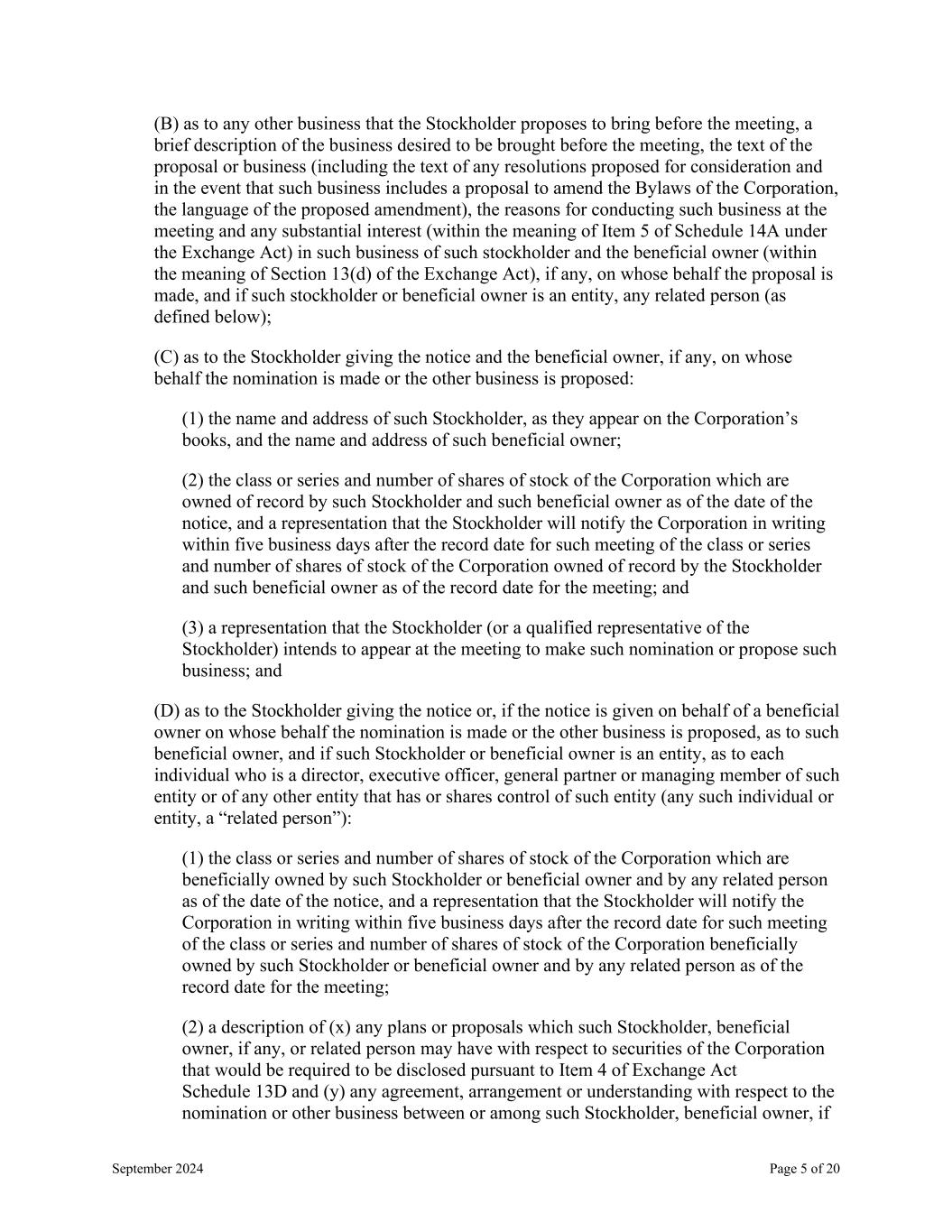 September 2024 Page 5 of 20 (B) as to any other business that the Stockholder proposes to bring before the meeting, a brief description of the business desired to be brought before the meeting, the text of the proposal or business (including the text of any resolutions proposed for consideration and in the event that such business includes a proposal to amend the Bylaws of the Corporation, the language of the proposed amendment), the reasons for conducting such business at the meeting and any substantial interest (within the meaning of Item 5 of Schedule 14A under the Exchange Act) in such business of such stockholder and the beneficial owner (within the meaning of Section 13(d) of the Exchange Act), if any, on whose behalf the proposal is made, and if such stockholder or beneficial owner is an entity, any related person (as defined below); (C) as to the Stockholder giving the notice and the beneficial owner, if any, on whose behalf the nomination is made or the other business is proposed: (1) the name and address of such Stockholder, as they appear on the Corporation’s books, and the name and address of such beneficial owner; (2) the class or series and number of shares of stock of the Corporation which are owned of record by such Stockholder and such beneficial owner as of the date of the notice, and a representation that the Stockholder will notify the Corporation in writing within five business days after the record date for such meeting of the class or series and number of shares of stock of the Corporation owned of record by the Stockholder and such beneficial owner as of the record date for the meeting; and (3) a representation that the Stockholder (or a qualified representative of the Stockholder) intends to appear at the meeting to make such nomination or propose such business; and (D) as to the Stockholder giving the notice or, if the notice is given on behalf of a beneficial owner on whose behalf the nomination is made or the other business is proposed, as to such beneficial owner, and if such Stockholder or beneficial owner is an entity, as to each individual who is a director, executive officer, general partner or managing member of such entity or of any other entity that has or shares control of such entity (any such individual or entity, a “related person”): (1) the class or series and number of shares of stock of the Corporation which are beneficially owned by such Stockholder or beneficial owner and by any related person as of the date of the notice, and a representation that the Stockholder will notify the Corporation in writing within five business days after the record date for such meeting of the class or series and number of shares of stock of the Corporation beneficially owned by such Stockholder or beneficial owner and by any related person as of the record date for the meeting; (2) a description of (x) any plans or proposals which such Stockholder, beneficial owner, if any, or related person may have with respect to securities of the Corporation that would be required to be disclosed pursuant to Item 4 of Exchange Act Schedule 13D and (y) any agreement, arrangement or understanding with respect to the nomination or other business between or among such Stockholder, beneficial owner, if