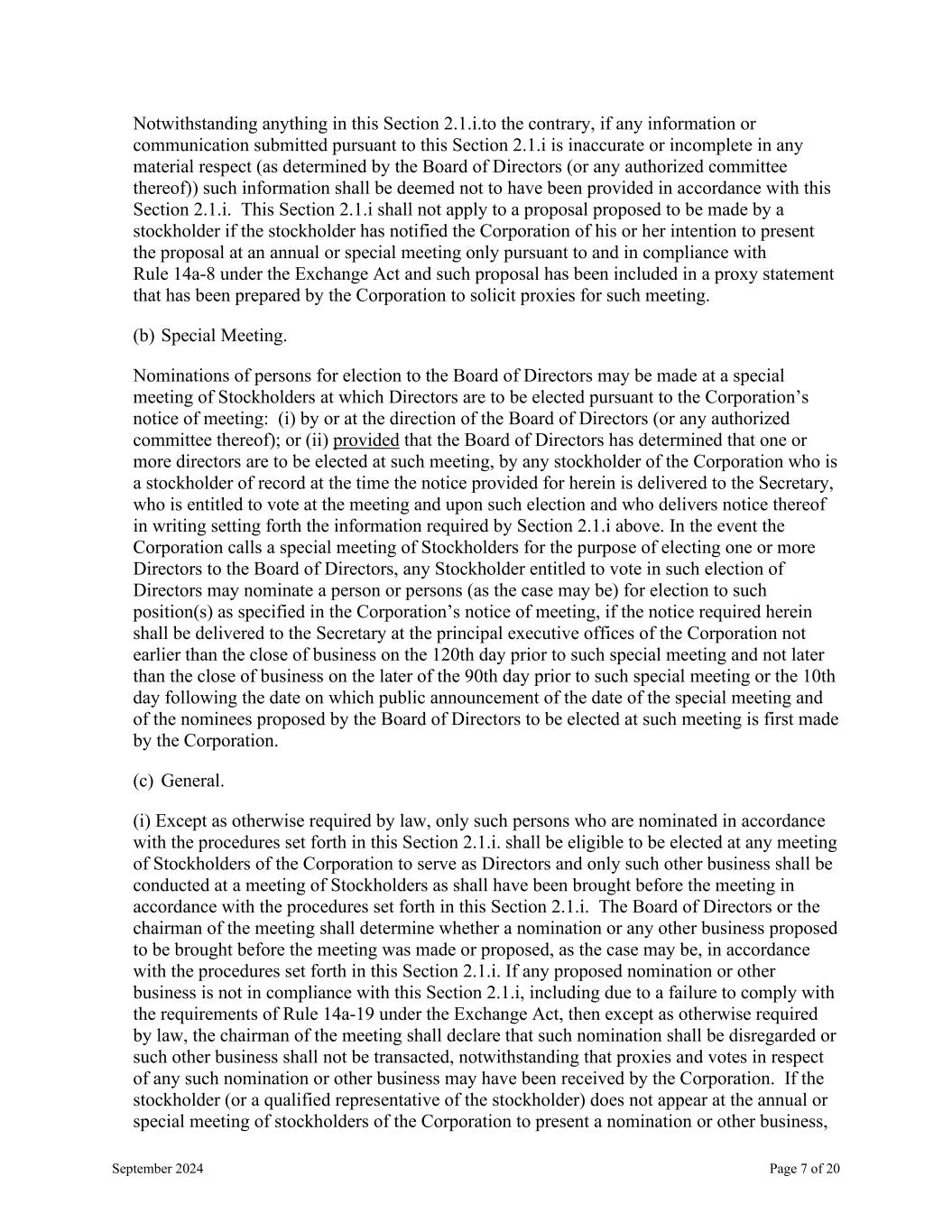 September 2024 Page 7 of 20 Notwithstanding anything in this Section 2.1.i.to the contrary, if any information or communication submitted pursuant to this Section 2.1.i is inaccurate or incomplete in any material respect (as determined by the Board of Directors (or any authorized committee thereof)) such information shall be deemed not to have been provided in accordance with this Section 2.1.i. This Section 2.1.i shall not apply to a proposal proposed to be made by a stockholder if the stockholder has notified the Corporation of his or her intention to present the proposal at an annual or special meeting only pursuant to and in compliance with Rule 14a-8 under the Exchange Act and such proposal has been included in a proxy statement that has been prepared by the Corporation to solicit proxies for such meeting. (b) Special Meeting. Nominations of persons for election to the Board of Directors may be made at a special meeting of Stockholders at which Directors are to be elected pursuant to the Corporation’s notice of meeting: (i) by or at the direction of the Board of Directors (or any authorized committee thereof); or (ii) provided that the Board of Directors has determined that one or more directors are to be elected at such meeting, by any stockholder of the Corporation who is a stockholder of record at the time the notice provided for herein is delivered to the Secretary, who is entitled to vote at the meeting and upon such election and who delivers notice thereof in writing setting forth the information required by Section 2.1.i above. In the event the Corporation calls a special meeting of Stockholders for the purpose of electing one or more Directors to the Board of Directors, any Stockholder entitled to vote in such election of Directors may nominate a person or persons (as the case may be) for election to such position(s) as specified in the Corporation’s notice of meeting, if the notice required herein shall be delivered to the Secretary at the principal executive offices of the Corporation not earlier than the close of business on the 120th day prior to such special meeting and not later than the close of business on the later of the 90th day prior to such special meeting or the 10th day following the date on which public announcement of the date of the special meeting and of the nominees proposed by the Board of Directors to be elected at such meeting is first made by the Corporation. (c) General. (i) Except as otherwise required by law, only such persons who are nominated in accordance with the procedures set forth in this Section 2.1.i. shall be eligible to be elected at any meeting of Stockholders of the Corporation to serve as Directors and only such other business shall be conducted at a meeting of Stockholders as shall have been brought before the meeting in accordance with the procedures set forth in this Section 2.1.i. The Board of Directors or the chairman of the meeting shall determine whether a nomination or any other business proposed to be brought before the meeting was made or proposed, as the case may be, in accordance with the procedures set forth in this Section 2.1.i. If any proposed nomination or other business is not in compliance with this Section 2.1.i, including due to a failure to comply with the requirements of Rule 14a-19 under the Exchange Act, then except as otherwise required by law, the chairman of the meeting shall declare that such nomination shall be disregarded or such other business shall not be transacted, notwithstanding that proxies and votes in respect of any such nomination or other business may have been received by the Corporation. If the stockholder (or a qualified representative of the stockholder) does not appear at the annual or special meeting of stockholders of the Corporation to present a nomination or other business,