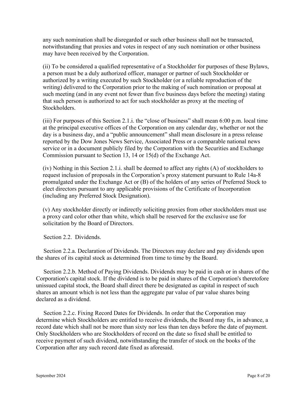 September 2024 Page 8 of 20 any such nomination shall be disregarded or such other business shall not be transacted, notwithstanding that proxies and votes in respect of any such nomination or other business may have been received by the Corporation. (ii) To be considered a qualified representative of a Stockholder for purposes of these Bylaws, a person must be a duly authorized officer, manager or partner of such Stockholder or authorized by a writing executed by such Stockholder (or a reliable reproduction of the writing) delivered to the Corporation prior to the making of such nomination or proposal at such meeting (and in any event not fewer than five business days before the meeting) stating that such person is authorized to act for such stockholder as proxy at the meeting of Stockholders. (iii) For purposes of this Section 2.1.i. the “close of business” shall mean 6:00 p.m. local time at the principal executive offices of the Corporation on any calendar day, whether or not the day is a business day, and a “public announcement” shall mean disclosure in a press release reported by the Dow Jones News Service, Associated Press or a comparable national news service or in a document publicly filed by the Corporation with the Securities and Exchange Commission pursuant to Section 13, 14 or 15(d) of the Exchange Act. (iv) Nothing in this Section 2.1.i. shall be deemed to affect any rights (A) of stockholders to request inclusion of proposals in the Corporation’s proxy statement pursuant to Rule 14a-8 promulgated under the Exchange Act or (B) of the holders of any series of Preferred Stock to elect directors pursuant to any applicable provisions of the Certificate of Incorporation (including any Preferred Stock Designation). (v) Any stockholder directly or indirectly soliciting proxies from other stockholders must use a proxy card color other than white, which shall be reserved for the exclusive use for solicitation by the Board of Directors. Section 2.2. Dividends. Section 2.2.a. Declaration of Dividends. The Directors may declare and pay dividends upon the shares of its capital stock as determined from time to time by the Board. Section 2.2.b. Method of Paying Dividends. Dividends may be paid in cash or in shares of the Corporation's capital stock. If the dividend is to be paid in shares of the Corporation's theretofore unissued capital stock, the Board shall direct there be designated as capital in respect of such shares an amount which is not less than the aggregate par value of par value shares being declared as a dividend. Section 2.2.c. Fixing Record Dates for Dividends. In order that the Corporation may determine which Stockholders are entitled to receive dividends, the Board may fix, in advance, a record date which shall not be more than sixty nor less than ten days before the date of payment. Only Stockholders who are Stockholders of record on the date so fixed shall be entitled to receive payment of such dividend, notwithstanding the transfer of stock on the books of the Corporation after any such record date fixed as aforesaid.