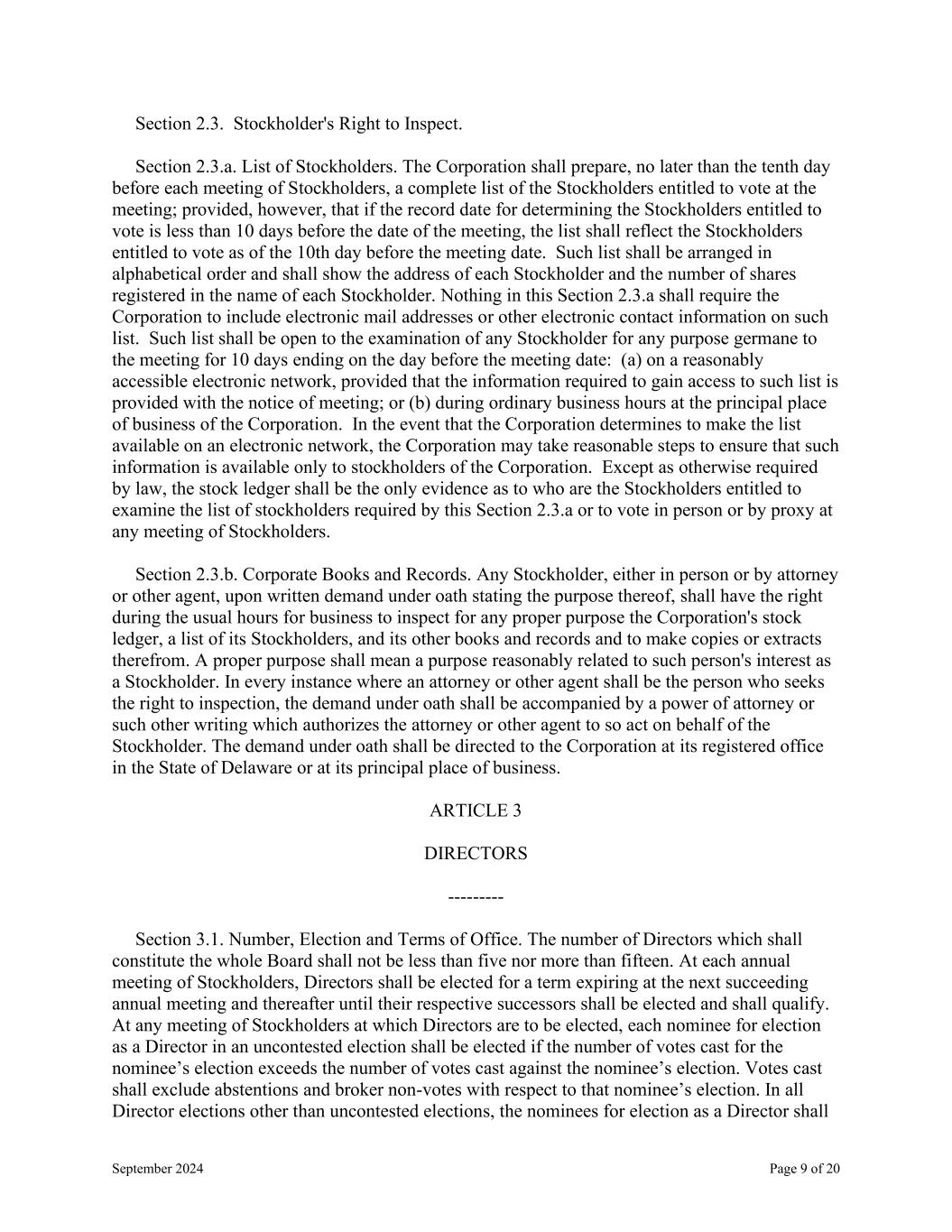 September 2024 Page 9 of 20 Section 2.3. Stockholder's Right to Inspect. Section 2.3.a. List of Stockholders. The Corporation shall prepare, no later than the tenth day before each meeting of Stockholders, a complete list of the Stockholders entitled to vote at the meeting; provided, however, that if the record date for determining the Stockholders entitled to vote is less than 10 days before the date of the meeting, the list shall reflect the Stockholders entitled to vote as of the 10th day before the meeting date. Such list shall be arranged in alphabetical order and shall show the address of each Stockholder and the number of shares registered in the name of each Stockholder. Nothing in this Section 2.3.a shall require the Corporation to include electronic mail addresses or other electronic contact information on such list. Such list shall be open to the examination of any Stockholder for any purpose germane to the meeting for 10 days ending on the day before the meeting date: (a) on a reasonably accessible electronic network, provided that the information required to gain access to such list is provided with the notice of meeting; or (b) during ordinary business hours at the principal place of business of the Corporation. In the event that the Corporation determines to make the list available on an electronic network, the Corporation may take reasonable steps to ensure that such information is available only to stockholders of the Corporation. Except as otherwise required by law, the stock ledger shall be the only evidence as to who are the Stockholders entitled to examine the list of stockholders required by this Section 2.3.a or to vote in person or by proxy at any meeting of Stockholders. Section 2.3.b. Corporate Books and Records. Any Stockholder, either in person or by attorney or other agent, upon written demand under oath stating the purpose thereof, shall have the right during the usual hours for business to inspect for any proper purpose the Corporation's stock ledger, a list of its Stockholders, and its other books and records and to make copies or extracts therefrom. A proper purpose shall mean a purpose reasonably related to such person's interest as a Stockholder. In every instance where an attorney or other agent shall be the person who seeks the right to inspection, the demand under oath shall be accompanied by a power of attorney or such other writing which authorizes the attorney or other agent to so act on behalf of the Stockholder. The demand under oath shall be directed to the Corporation at its registered office in the State of Delaware or at its principal place of business. ARTICLE 3 DIRECTORS --------- Section 3.1. Number, Election and Terms of Office. The number of Directors which shall constitute the whole Board shall not be less than five nor more than fifteen. At each annual meeting of Stockholders, Directors shall be elected for a term expiring at the next succeeding annual meeting and thereafter until their respective successors shall be elected and shall qualify. At any meeting of Stockholders at which Directors are to be elected, each nominee for election as a Director in an uncontested election shall be elected if the number of votes cast for the nominee’s election exceeds the number of votes cast against the nominee’s election. Votes cast shall exclude abstentions and broker non-votes with respect to that nominee’s election. In all Director elections other than uncontested elections, the nominees for election as a Director shall