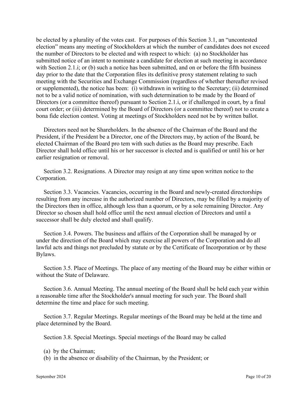 September 2024 Page 10 of 20 be elected by a plurality of the votes cast. For purposes of this Section 3.1, an “uncontested election” means any meeting of Stockholders at which the number of candidates does not exceed the number of Directors to be elected and with respect to which: (a) no Stockholder has submitted notice of an intent to nominate a candidate for election at such meeting in accordance with Section 2.1.i; or (b) such a notice has been submitted, and on or before the fifth business day prior to the date that the Corporation files its definitive proxy statement relating to such meeting with the Securities and Exchange Commission (regardless of whether thereafter revised or supplemented), the notice has been: (i) withdrawn in writing to the Secretary; (ii) determined not to be a valid notice of nomination, with such determination to be made by the Board of Directors (or a committee thereof) pursuant to Section 2.1.i, or if challenged in court, by a final court order; or (iii) determined by the Board of Directors (or a committee thereof) not to create a bona fide election contest. Voting at meetings of Stockholders need not be by written ballot. Directors need not be Shareholders. In the absence of the Chairman of the Board and the President, if the President be a Director, one of the Directors may, by action of the Board, be elected Chairman of the Board pro tem with such duties as the Board may prescribe. Each Director shall hold office until his or her successor is elected and is qualified or until his or her earlier resignation or removal. Section 3.2. Resignations. A Director may resign at any time upon written notice to the Corporation. Section 3.3. Vacancies. Vacancies, occurring in the Board and newly-created directorships resulting from any increase in the authorized number of Directors, may be filled by a majority of the Directors then in office, although less than a quorum, or by a sole remaining Director. Any Director so chosen shall hold office until the next annual election of Directors and until a successor shall be duly elected and shall qualify. Section 3.4. Powers. The business and affairs of the Corporation shall be managed by or under the direction of the Board which may exercise all powers of the Corporation and do all lawful acts and things not precluded by statute or by the Certificate of Incorporation or by these Bylaws. Section 3.5. Place of Meetings. The place of any meeting of the Board may be either within or without the State of Delaware. Section 3.6. Annual Meeting. The annual meeting of the Board shall be held each year within a reasonable time after the Stockholder's annual meeting for such year. The Board shall determine the time and place for such meeting. Section 3.7. Regular Meetings. Regular meetings of the Board may be held at the time and place determined by the Board. Section 3.8. Special Meetings. Special meetings of the Board may be called (a) by the Chairman; (b) in the absence or disability of the Chairman, by the President; or