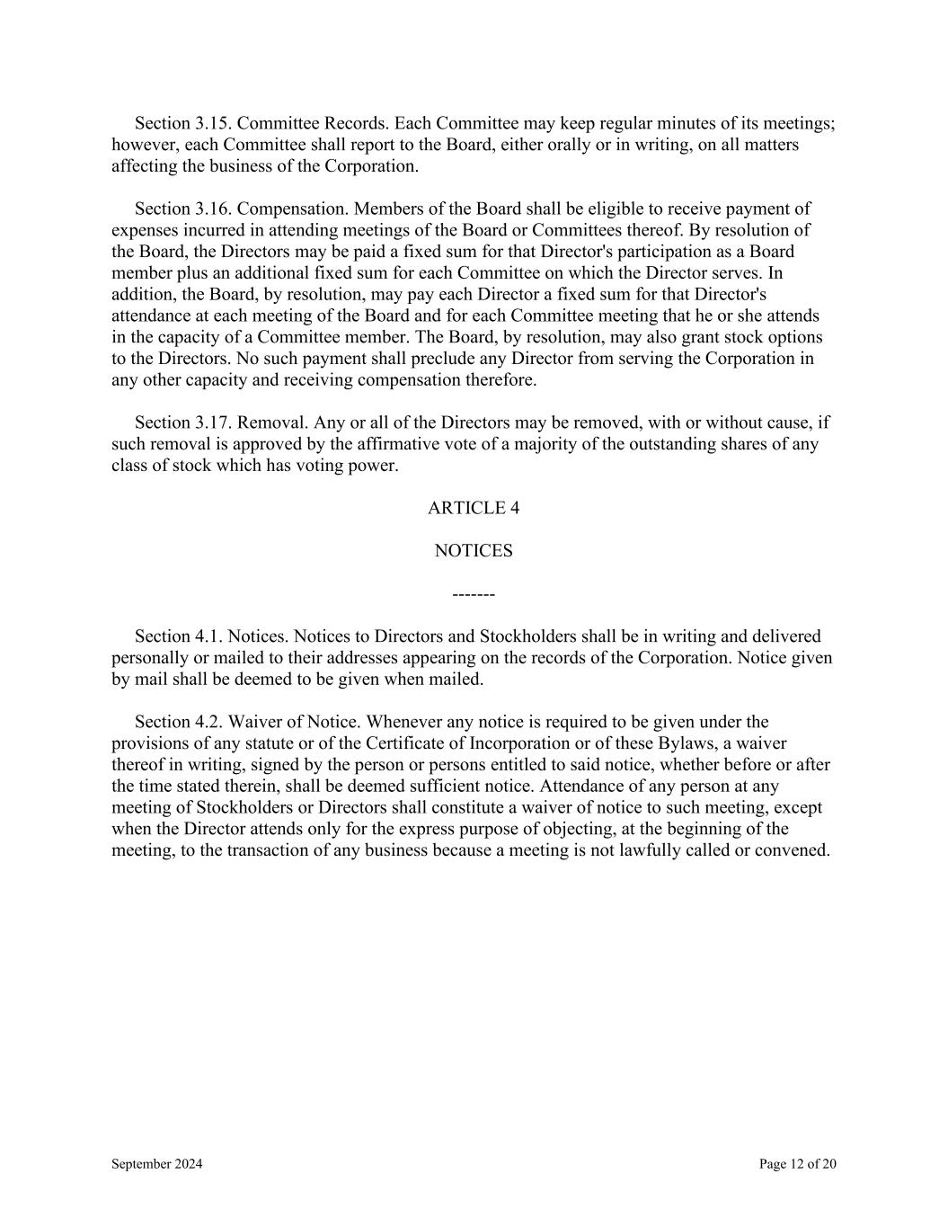 September 2024 Page 12 of 20 Section 3.15. Committee Records. Each Committee may keep regular minutes of its meetings; however, each Committee shall report to the Board, either orally or in writing, on all matters affecting the business of the Corporation. Section 3.16. Compensation. Members of the Board shall be eligible to receive payment of expenses incurred in attending meetings of the Board or Committees thereof. By resolution of the Board, the Directors may be paid a fixed sum for that Director's participation as a Board member plus an additional fixed sum for each Committee on which the Director serves. In addition, the Board, by resolution, may pay each Director a fixed sum for that Director's attendance at each meeting of the Board and for each Committee meeting that he or she attends in the capacity of a Committee member. The Board, by resolution, may also grant stock options to the Directors. No such payment shall preclude any Director from serving the Corporation in any other capacity and receiving compensation therefore. Section 3.17. Removal. Any or all of the Directors may be removed, with or without cause, if such removal is approved by the affirmative vote of a majority of the outstanding shares of any class of stock which has voting power. ARTICLE 4 NOTICES ------- Section 4.1. Notices. Notices to Directors and Stockholders shall be in writing and delivered personally or mailed to their addresses appearing on the records of the Corporation. Notice given by mail shall be deemed to be given when mailed. Section 4.2. Waiver of Notice. Whenever any notice is required to be given under the provisions of any statute or of the Certificate of Incorporation or of these Bylaws, a waiver thereof in writing, signed by the person or persons entitled to said notice, whether before or after the time stated therein, shall be deemed sufficient notice. Attendance of any person at any meeting of Stockholders or Directors shall constitute a waiver of notice to such meeting, except when the Director attends only for the express purpose of objecting, at the beginning of the meeting, to the transaction of any business because a meeting is not lawfully called or convened.
