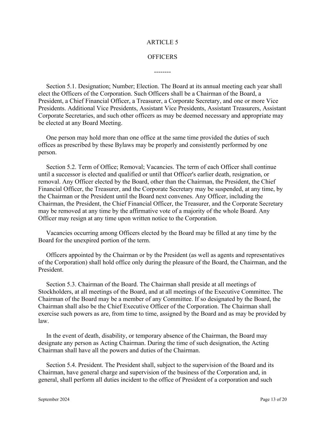 September 2024 Page 13 of 20 ARTICLE 5 OFFICERS -------- Section 5.1. Designation; Number; Election. The Board at its annual meeting each year shall elect the Officers of the Corporation. Such Officers shall be a Chairman of the Board, a President, a Chief Financial Officer, a Treasurer, a Corporate Secretary, and one or more Vice Presidents. Additional Vice Presidents, Assistant Vice Presidents, Assistant Treasurers, Assistant Corporate Secretaries, and such other officers as may be deemed necessary and appropriate may be elected at any Board Meeting. One person may hold more than one office at the same time provided the duties of such offices as prescribed by these Bylaws may be properly and consistently performed by one person. Section 5.2. Term of Office; Removal; Vacancies. The term of each Officer shall continue until a successor is elected and qualified or until that Officer's earlier death, resignation, or removal. Any Officer elected by the Board, other than the Chairman, the President, the Chief Financial Officer, the Treasurer, and the Corporate Secretary may be suspended, at any time, by the Chairman or the President until the Board next convenes. Any Officer, including the Chairman, the President, the Chief Financial Officer, the Treasurer, and the Corporate Secretary may be removed at any time by the affirmative vote of a majority of the whole Board. Any Officer may resign at any time upon written notice to the Corporation. Vacancies occurring among Officers elected by the Board may be filled at any time by the Board for the unexpired portion of the term. Officers appointed by the Chairman or by the President (as well as agents and representatives of the Corporation) shall hold office only during the pleasure of the Board, the Chairman, and the President. Section 5.3. Chairman of the Board. The Chairman shall preside at all meetings of Stockholders, at all meetings of the Board, and at all meetings of the Executive Committee. The Chairman of the Board may be a member of any Committee. If so designated by the Board, the Chairman shall also be the Chief Executive Officer of the Corporation. The Chairman shall exercise such powers as are, from time to time, assigned by the Board and as may be provided by law. In the event of death, disability, or temporary absence of the Chairman, the Board may designate any person as Acting Chairman. During the time of such designation, the Acting Chairman shall have all the powers and duties of the Chairman. Section 5.4. President. The President shall, subject to the supervision of the Board and its Chairman, have general charge and supervision of the business of the Corporation and, in general, shall perform all duties incident to the office of President of a corporation and such