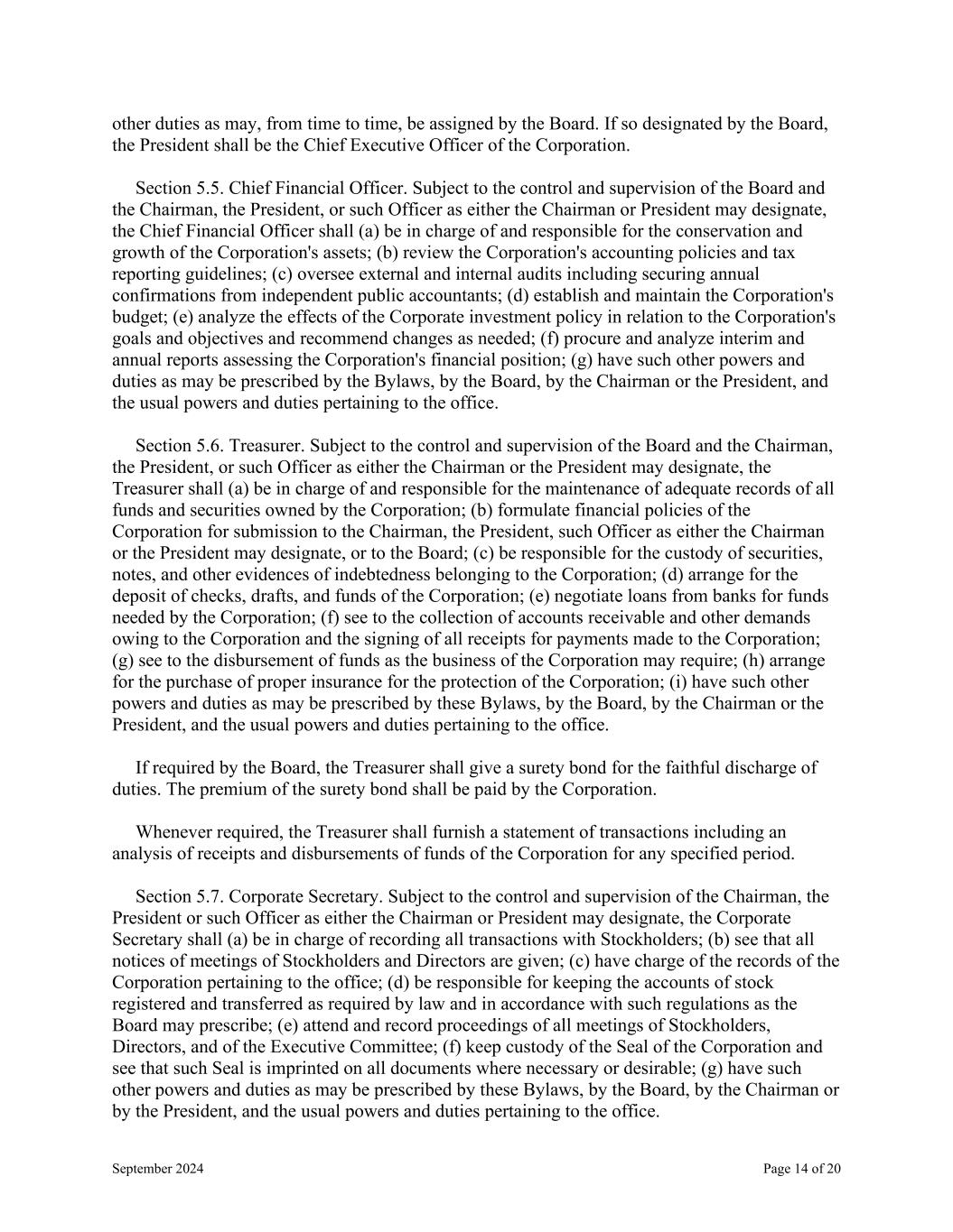 September 2024 Page 14 of 20 other duties as may, from time to time, be assigned by the Board. If so designated by the Board, the President shall be the Chief Executive Officer of the Corporation. Section 5.5. Chief Financial Officer. Subject to the control and supervision of the Board and the Chairman, the President, or such Officer as either the Chairman or President may designate, the Chief Financial Officer shall (a) be in charge of and responsible for the conservation and growth of the Corporation's assets; (b) review the Corporation's accounting policies and tax reporting guidelines; (c) oversee external and internal audits including securing annual confirmations from independent public accountants; (d) establish and maintain the Corporation's budget; (e) analyze the effects of the Corporate investment policy in relation to the Corporation's goals and objectives and recommend changes as needed; (f) procure and analyze interim and annual reports assessing the Corporation's financial position; (g) have such other powers and duties as may be prescribed by the Bylaws, by the Board, by the Chairman or the President, and the usual powers and duties pertaining to the office. Section 5.6. Treasurer. Subject to the control and supervision of the Board and the Chairman, the President, or such Officer as either the Chairman or the President may designate, the Treasurer shall (a) be in charge of and responsible for the maintenance of adequate records of all funds and securities owned by the Corporation; (b) formulate financial policies of the Corporation for submission to the Chairman, the President, such Officer as either the Chairman or the President may designate, or to the Board; (c) be responsible for the custody of securities, notes, and other evidences of indebtedness belonging to the Corporation; (d) arrange for the deposit of checks, drafts, and funds of the Corporation; (e) negotiate loans from banks for funds needed by the Corporation; (f) see to the collection of accounts receivable and other demands owing to the Corporation and the signing of all receipts for payments made to the Corporation; (g) see to the disbursement of funds as the business of the Corporation may require; (h) arrange for the purchase of proper insurance for the protection of the Corporation; (i) have such other powers and duties as may be prescribed by these Bylaws, by the Board, by the Chairman or the President, and the usual powers and duties pertaining to the office. If required by the Board, the Treasurer shall give a surety bond for the faithful discharge of duties. The premium of the surety bond shall be paid by the Corporation. Whenever required, the Treasurer shall furnish a statement of transactions including an analysis of receipts and disbursements of funds of the Corporation for any specified period. Section 5.7. Corporate Secretary. Subject to the control and supervision of the Chairman, the President or such Officer as either the Chairman or President may designate, the Corporate Secretary shall (a) be in charge of recording all transactions with Stockholders; (b) see that all notices of meetings of Stockholders and Directors are given; (c) have charge of the records of the Corporation pertaining to the office; (d) be responsible for keeping the accounts of stock registered and transferred as required by law and in accordance with such regulations as the Board may prescribe; (e) attend and record proceedings of all meetings of Stockholders, Directors, and of the Executive Committee; (f) keep custody of the Seal of the Corporation and see that such Seal is imprinted on all documents where necessary or desirable; (g) have such other powers and duties as may be prescribed by these Bylaws, by the Board, by the Chairman or by the President, and the usual powers and duties pertaining to the office.