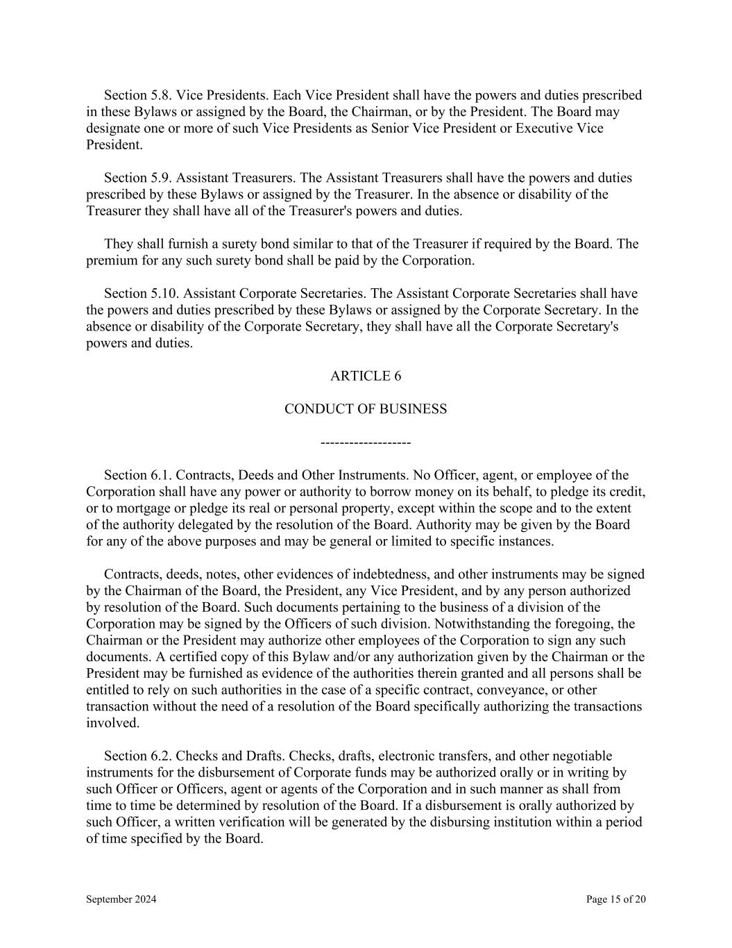 September 2024 Page 15 of 20 Section 5.8. Vice Presidents. Each Vice President shall have the powers and duties prescribed in these Bylaws or assigned by the Board, the Chairman, or by the President. The Board may designate one or more of such Vice Presidents as Senior Vice President or Executive Vice President. Section 5.9. Assistant Treasurers. The Assistant Treasurers shall have the powers and duties prescribed by these Bylaws or assigned by the Treasurer. In the absence or disability of the Treasurer they shall have all of the Treasurer's powers and duties. They shall furnish a surety bond similar to that of the Treasurer if required by the Board. The premium for any such surety bond shall be paid by the Corporation. Section 5.10. Assistant Corporate Secretaries. The Assistant Corporate Secretaries shall have the powers and duties prescribed by these Bylaws or assigned by the Corporate Secretary. In the absence or disability of the Corporate Secretary, they shall have all the Corporate Secretary's powers and duties. ARTICLE 6 CONDUCT OF BUSINESS ------------------- Section 6.1. Contracts, Deeds and Other Instruments. No Officer, agent, or employee of the Corporation shall have any power or authority to borrow money on its behalf, to pledge its credit, or to mortgage or pledge its real or personal property, except within the scope and to the extent of the authority delegated by the resolution of the Board. Authority may be given by the Board for any of the above purposes and may be general or limited to specific instances. Contracts, deeds, notes, other evidences of indebtedness, and other instruments may be signed by the Chairman of the Board, the President, any Vice President, and by any person authorized by resolution of the Board. Such documents pertaining to the business of a division of the Corporation may be signed by the Officers of such division. Notwithstanding the foregoing, the Chairman or the President may authorize other employees of the Corporation to sign any such documents. A certified copy of this Bylaw and/or any authorization given by the Chairman or the President may be furnished as evidence of the authorities therein granted and all persons shall be entitled to rely on such authorities in the case of a specific contract, conveyance, or other transaction without the need of a resolution of the Board specifically authorizing the transactions involved. Section 6.2. Checks and Drafts. Checks, drafts, electronic transfers, and other negotiable instruments for the disbursement of Corporate funds may be authorized orally or in writing by such Officer or Officers, agent or agents of the Corporation and in such manner as shall from time to time be determined by resolution of the Board. If a disbursement is orally authorized by such Officer, a written verification will be generated by the disbursing institution within a period of time specified by the Board.