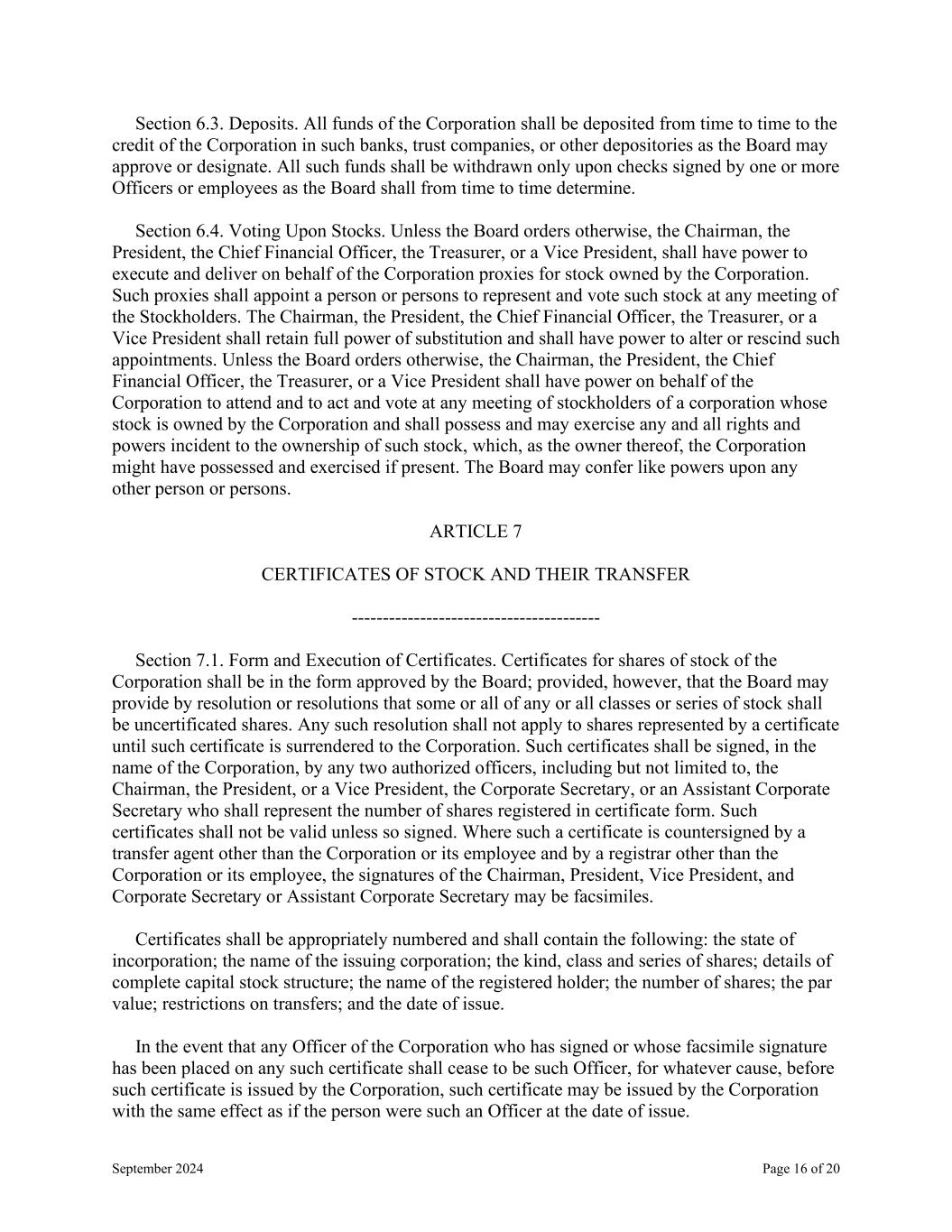 September 2024 Page 16 of 20 Section 6.3. Deposits. All funds of the Corporation shall be deposited from time to time to the credit of the Corporation in such banks, trust companies, or other depositories as the Board may approve or designate. All such funds shall be withdrawn only upon checks signed by one or more Officers or employees as the Board shall from time to time determine. Section 6.4. Voting Upon Stocks. Unless the Board orders otherwise, the Chairman, the President, the Chief Financial Officer, the Treasurer, or a Vice President, shall have power to execute and deliver on behalf of the Corporation proxies for stock owned by the Corporation. Such proxies shall appoint a person or persons to represent and vote such stock at any meeting of the Stockholders. The Chairman, the President, the Chief Financial Officer, the Treasurer, or a Vice President shall retain full power of substitution and shall have power to alter or rescind such appointments. Unless the Board orders otherwise, the Chairman, the President, the Chief Financial Officer, the Treasurer, or a Vice President shall have power on behalf of the Corporation to attend and to act and vote at any meeting of stockholders of a corporation whose stock is owned by the Corporation and shall possess and may exercise any and all rights and powers incident to the ownership of such stock, which, as the owner thereof, the Corporation might have possessed and exercised if present. The Board may confer like powers upon any other person or persons. ARTICLE 7 CERTIFICATES OF STOCK AND THEIR TRANSFER ---------------------------------------- Section 7.1. Form and Execution of Certificates. Certificates for shares of stock of the Corporation shall be in the form approved by the Board; provided, however, that the Board may provide by resolution or resolutions that some or all of any or all classes or series of stock shall be uncertificated shares. Any such resolution shall not apply to shares represented by a certificate until such certificate is surrendered to the Corporation. Such certificates shall be signed, in the name of the Corporation, by any two authorized officers, including but not limited to, the Chairman, the President, or a Vice President, the Corporate Secretary, or an Assistant Corporate Secretary who shall represent the number of shares registered in certificate form. Such certificates shall not be valid unless so signed. Where such a certificate is countersigned by a transfer agent other than the Corporation or its employee and by a registrar other than the Corporation or its employee, the signatures of the Chairman, President, Vice President, and Corporate Secretary or Assistant Corporate Secretary may be facsimiles. Certificates shall be appropriately numbered and shall contain the following: the state of incorporation; the name of the issuing corporation; the kind, class and series of shares; details of complete capital stock structure; the name of the registered holder; the number of shares; the par value; restrictions on transfers; and the date of issue. In the event that any Officer of the Corporation who has signed or whose facsimile signature has been placed on any such certificate shall cease to be such Officer, for whatever cause, before such certificate is issued by the Corporation, such certificate may be issued by the Corporation with the same effect as if the person were such an Officer at the date of issue.