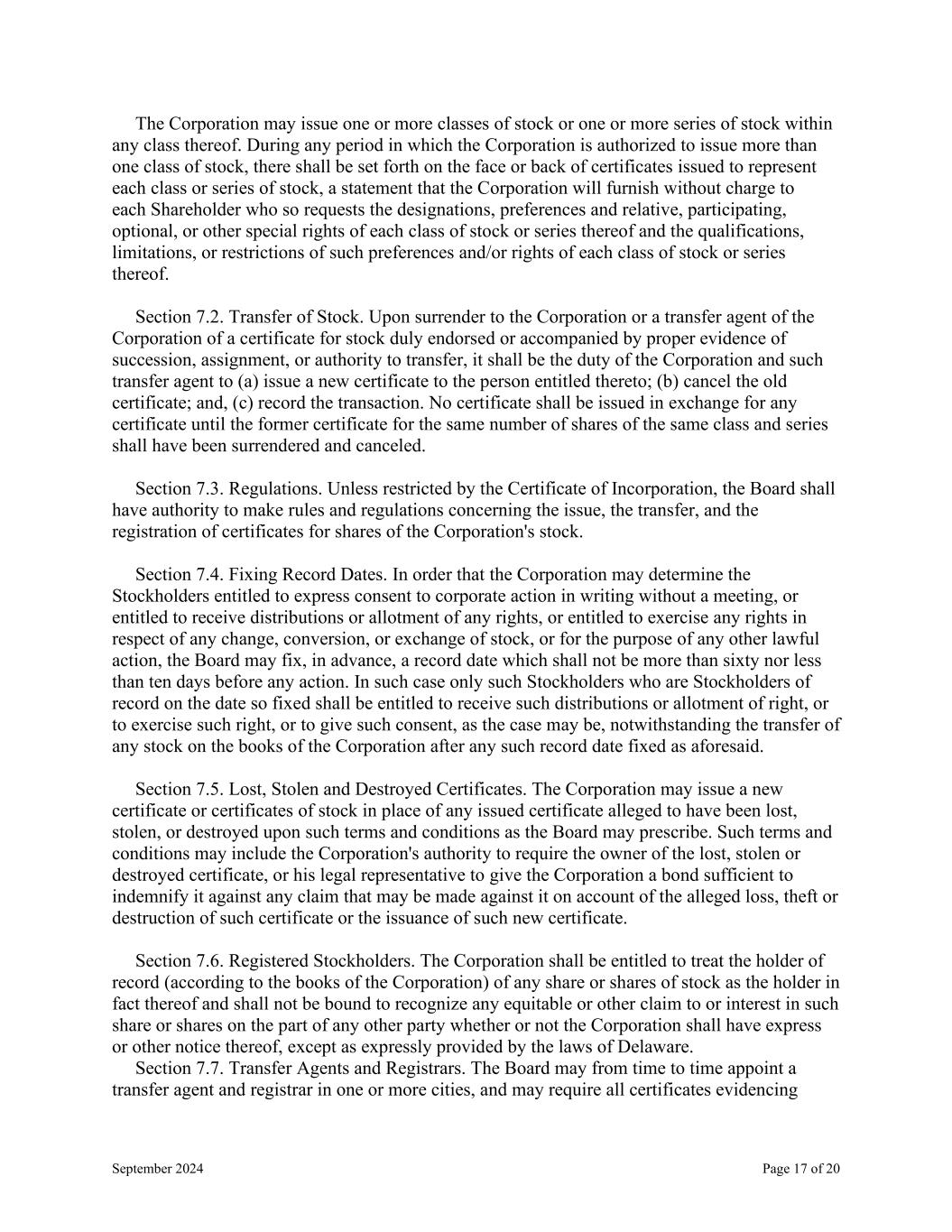 September 2024 Page 17 of 20 The Corporation may issue one or more classes of stock or one or more series of stock within any class thereof. During any period in which the Corporation is authorized to issue more than one class of stock, there shall be set forth on the face or back of certificates issued to represent each class or series of stock, a statement that the Corporation will furnish without charge to each Shareholder who so requests the designations, preferences and relative, participating, optional, or other special rights of each class of stock or series thereof and the qualifications, limitations, or restrictions of such preferences and/or rights of each class of stock or series thereof. Section 7.2. Transfer of Stock. Upon surrender to the Corporation or a transfer agent of the Corporation of a certificate for stock duly endorsed or accompanied by proper evidence of succession, assignment, or authority to transfer, it shall be the duty of the Corporation and such transfer agent to (a) issue a new certificate to the person entitled thereto; (b) cancel the old certificate; and, (c) record the transaction. No certificate shall be issued in exchange for any certificate until the former certificate for the same number of shares of the same class and series shall have been surrendered and canceled. Section 7.3. Regulations. Unless restricted by the Certificate of Incorporation, the Board shall have authority to make rules and regulations concerning the issue, the transfer, and the registration of certificates for shares of the Corporation's stock. Section 7.4. Fixing Record Dates. In order that the Corporation may determine the Stockholders entitled to express consent to corporate action in writing without a meeting, or entitled to receive distributions or allotment of any rights, or entitled to exercise any rights in respect of any change, conversion, or exchange of stock, or for the purpose of any other lawful action, the Board may fix, in advance, a record date which shall not be more than sixty nor less than ten days before any action. In such case only such Stockholders who are Stockholders of record on the date so fixed shall be entitled to receive such distributions or allotment of right, or to exercise such right, or to give such consent, as the case may be, notwithstanding the transfer of any stock on the books of the Corporation after any such record date fixed as aforesaid. Section 7.5. Lost, Stolen and Destroyed Certificates. The Corporation may issue a new certificate or certificates of stock in place of any issued certificate alleged to have been lost, stolen, or destroyed upon such terms and conditions as the Board may prescribe. Such terms and conditions may include the Corporation's authority to require the owner of the lost, stolen or destroyed certificate, or his legal representative to give the Corporation a bond sufficient to indemnify it against any claim that may be made against it on account of the alleged loss, theft or destruction of such certificate or the issuance of such new certificate. Section 7.6. Registered Stockholders. The Corporation shall be entitled to treat the holder of record (according to the books of the Corporation) of any share or shares of stock as the holder in fact thereof and shall not be bound to recognize any equitable or other claim to or interest in such share or shares on the part of any other party whether or not the Corporation shall have express or other notice thereof, except as expressly provided by the laws of Delaware. Section 7.7. Transfer Agents and Registrars. The Board may from time to time appoint a transfer agent and registrar in one or more cities, and may require all certificates evidencing