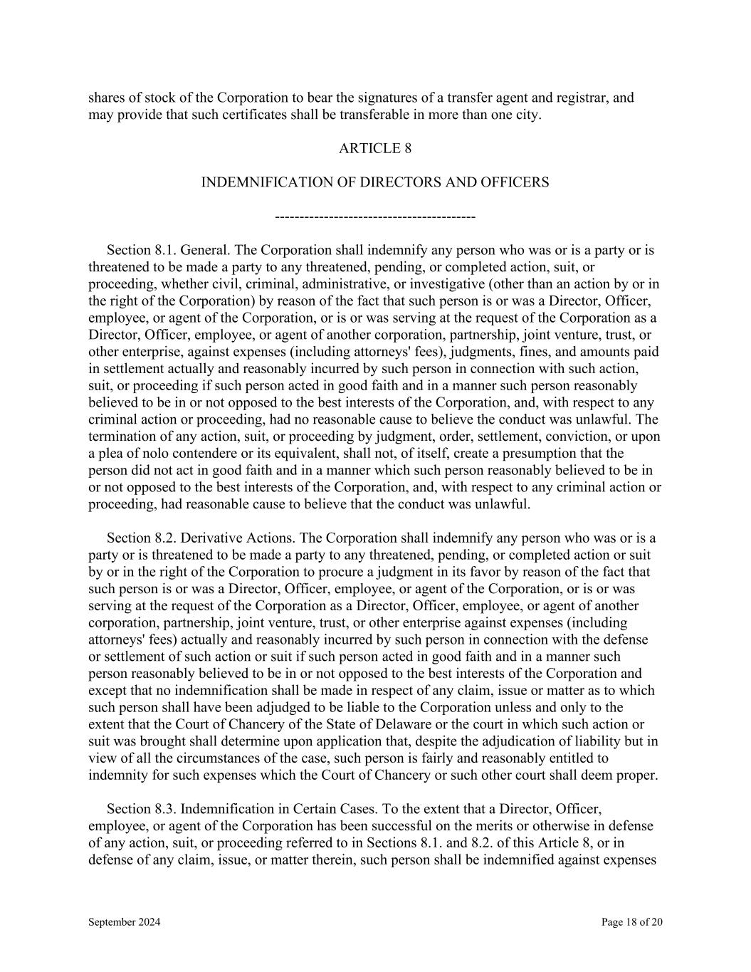 September 2024 Page 18 of 20 shares of stock of the Corporation to bear the signatures of a transfer agent and registrar, and may provide that such certificates shall be transferable in more than one city. ARTICLE 8 INDEMNIFICATION OF DIRECTORS AND OFFICERS ----------------------------------------- Section 8.1. General. The Corporation shall indemnify any person who was or is a party or is threatened to be made a party to any threatened, pending, or completed action, suit, or proceeding, whether civil, criminal, administrative, or investigative (other than an action by or in the right of the Corporation) by reason of the fact that such person is or was a Director, Officer, employee, or agent of the Corporation, or is or was serving at the request of the Corporation as a Director, Officer, employee, or agent of another corporation, partnership, joint venture, trust, or other enterprise, against expenses (including attorneys' fees), judgments, fines, and amounts paid in settlement actually and reasonably incurred by such person in connection with such action, suit, or proceeding if such person acted in good faith and in a manner such person reasonably believed to be in or not opposed to the best interests of the Corporation, and, with respect to any criminal action or proceeding, had no reasonable cause to believe the conduct was unlawful. The termination of any action, suit, or proceeding by judgment, order, settlement, conviction, or upon a plea of nolo contendere or its equivalent, shall not, of itself, create a presumption that the person did not act in good faith and in a manner which such person reasonably believed to be in or not opposed to the best interests of the Corporation, and, with respect to any criminal action or proceeding, had reasonable cause to believe that the conduct was unlawful. Section 8.2. Derivative Actions. The Corporation shall indemnify any person who was or is a party or is threatened to be made a party to any threatened, pending, or completed action or suit by or in the right of the Corporation to procure a judgment in its favor by reason of the fact that such person is or was a Director, Officer, employee, or agent of the Corporation, or is or was serving at the request of the Corporation as a Director, Officer, employee, or agent of another corporation, partnership, joint venture, trust, or other enterprise against expenses (including attorneys' fees) actually and reasonably incurred by such person in connection with the defense or settlement of such action or suit if such person acted in good faith and in a manner such person reasonably believed to be in or not opposed to the best interests of the Corporation and except that no indemnification shall be made in respect of any claim, issue or matter as to which such person shall have been adjudged to be liable to the Corporation unless and only to the extent that the Court of Chancery of the State of Delaware or the court in which such action or suit was brought shall determine upon application that, despite the adjudication of liability but in view of all the circumstances of the case, such person is fairly and reasonably entitled to indemnity for such expenses which the Court of Chancery or such other court shall deem proper. Section 8.3. Indemnification in Certain Cases. To the extent that a Director, Officer, employee, or agent of the Corporation has been successful on the merits or otherwise in defense of any action, suit, or proceeding referred to in Sections 8.1. and 8.2. of this Article 8, or in defense of any claim, issue, or matter therein, such person shall be indemnified against expenses