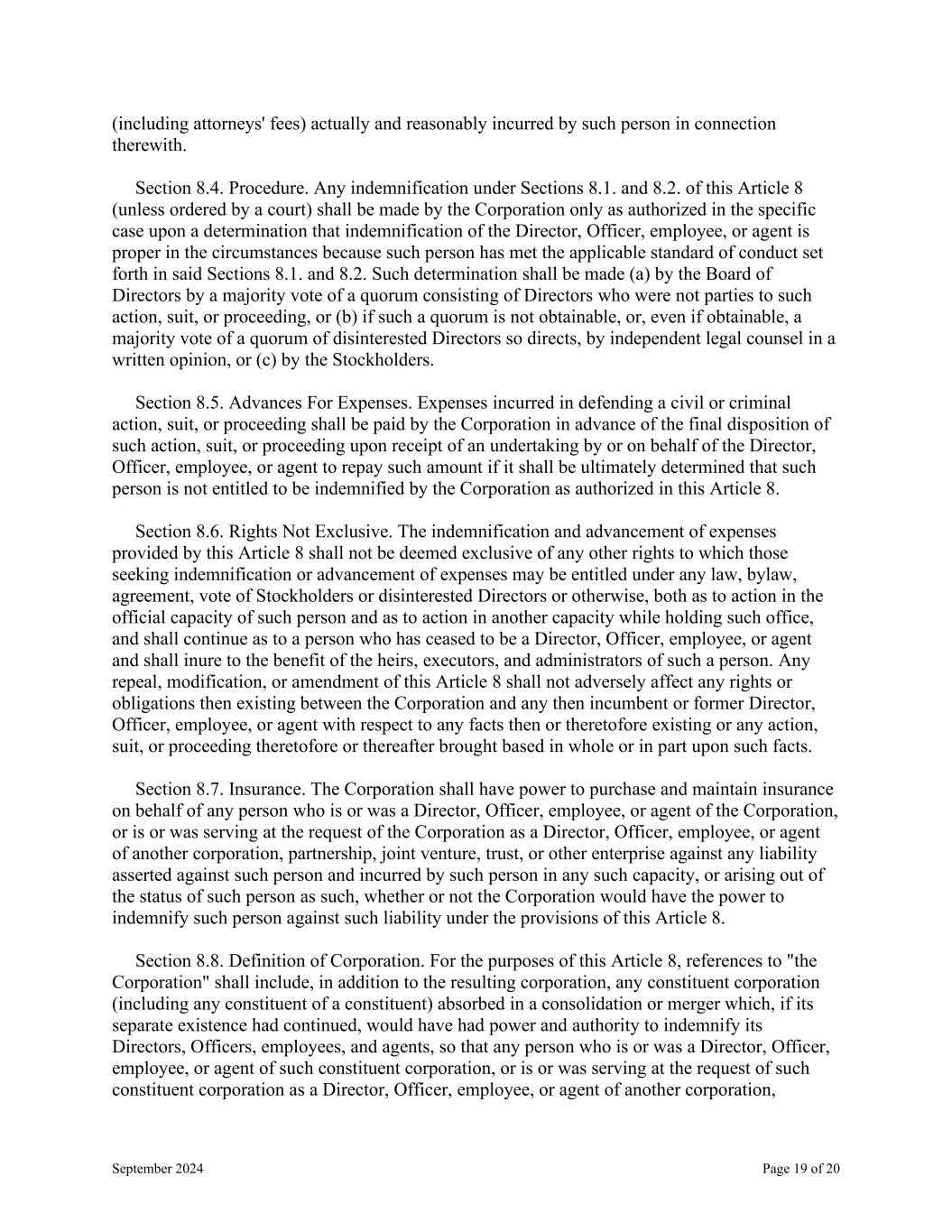 September 2024 Page 19 of 20 (including attorneys' fees) actually and reasonably incurred by such person in connection therewith. Section 8.4. Procedure. Any indemnification under Sections 8.1. and 8.2. of this Article 8 (unless ordered by a court) shall be made by the Corporation only as authorized in the specific case upon a determination that indemnification of the Director, Officer, employee, or agent is proper in the circumstances because such person has met the applicable standard of conduct set forth in said Sections 8.1. and 8.2. Such determination shall be made (a) by the Board of Directors by a majority vote of a quorum consisting of Directors who were not parties to such action, suit, or proceeding, or (b) if such a quorum is not obtainable, or, even if obtainable, a majority vote of a quorum of disinterested Directors so directs, by independent legal counsel in a written opinion, or (c) by the Stockholders. Section 8.5. Advances For Expenses. Expenses incurred in defending a civil or criminal action, suit, or proceeding shall be paid by the Corporation in advance of the final disposition of such action, suit, or proceeding upon receipt of an undertaking by or on behalf of the Director, Officer, employee, or agent to repay such amount if it shall be ultimately determined that such person is not entitled to be indemnified by the Corporation as authorized in this Article 8. Section 8.6. Rights Not Exclusive. The indemnification and advancement of expenses provided by this Article 8 shall not be deemed exclusive of any other rights to which those seeking indemnification or advancement of expenses may be entitled under any law, bylaw, agreement, vote of Stockholders or disinterested Directors or otherwise, both as to action in the official capacity of such person and as to action in another capacity while holding such office, and shall continue as to a person who has ceased to be a Director, Officer, employee, or agent and shall inure to the benefit of the heirs, executors, and administrators of such a person. Any repeal, modification, or amendment of this Article 8 shall not adversely affect any rights or obligations then existing between the Corporation and any then incumbent or former Director, Officer, employee, or agent with respect to any facts then or theretofore existing or any action, suit, or proceeding theretofore or thereafter brought based in whole or in part upon such facts. Section 8.7. Insurance. The Corporation shall have power to purchase and maintain insurance on behalf of any person who is or was a Director, Officer, employee, or agent of the Corporation, or is or was serving at the request of the Corporation as a Director, Officer, employee, or agent of another corporation, partnership, joint venture, trust, or other enterprise against any liability asserted against such person and incurred by such person in any such capacity, or arising out of the status of such person as such, whether or not the Corporation would have the power to indemnify such person against such liability under the provisions of this Article 8. Section 8.8. Definition of Corporation. For the purposes of this Article 8, references to "the Corporation" shall include, in addition to the resulting corporation, any constituent corporation (including any constituent of a constituent) absorbed in a consolidation or merger which, if its separate existence had continued, would have had power and authority to indemnify its Directors, Officers, employees, and agents, so that any person who is or was a Director, Officer, employee, or agent of such constituent corporation, or is or was serving at the request of such constituent corporation as a Director, Officer, employee, or agent of another corporation,