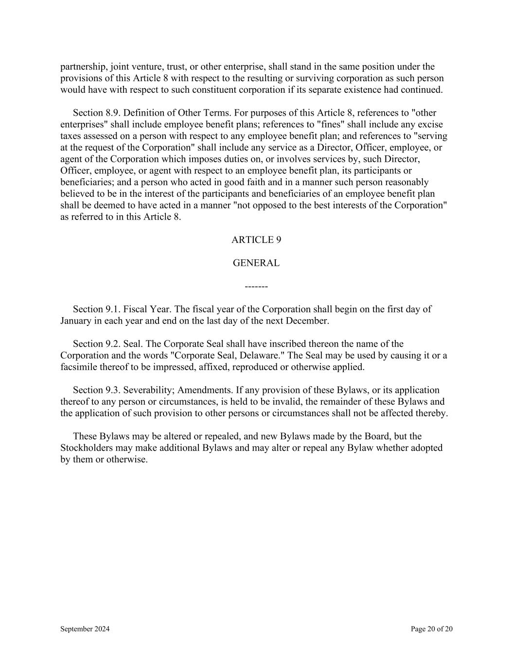 September 2024 Page 20 of 20 partnership, joint venture, trust, or other enterprise, shall stand in the same position under the provisions of this Article 8 with respect to the resulting or surviving corporation as such person would have with respect to such constituent corporation if its separate existence had continued. Section 8.9. Definition of Other Terms. For purposes of this Article 8, references to "other enterprises" shall include employee benefit plans; references to "fines" shall include any excise taxes assessed on a person with respect to any employee benefit plan; and references to "serving at the request of the Corporation" shall include any service as a Director, Officer, employee, or agent of the Corporation which imposes duties on, or involves services by, such Director, Officer, employee, or agent with respect to an employee benefit plan, its participants or beneficiaries; and a person who acted in good faith and in a manner such person reasonably believed to be in the interest of the participants and beneficiaries of an employee benefit plan shall be deemed to have acted in a manner "not opposed to the best interests of the Corporation" as referred to in this Article 8. ARTICLE 9 GENERAL ------- Section 9.1. Fiscal Year. The fiscal year of the Corporation shall begin on the first day of January in each year and end on the last day of the next December. Section 9.2. Seal. The Corporate Seal shall have inscribed thereon the name of the Corporation and the words "Corporate Seal, Delaware." The Seal may be used by causing it or a facsimile thereof to be impressed, affixed, reproduced or otherwise applied. Section 9.3. Severability; Amendments. If any provision of these Bylaws, or its application thereof to any person or circumstances, is held to be invalid, the remainder of these Bylaws and the application of such provision to other persons or circumstances shall not be affected thereby. These Bylaws may be altered or repealed, and new Bylaws made by the Board, but the Stockholders may make additional Bylaws and may alter or repeal any Bylaw whether adopted by them or otherwise.