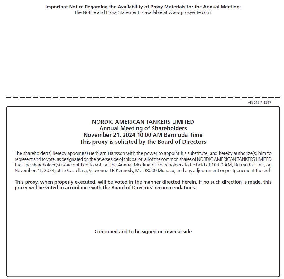 the “Directors”) of Nordic American Tankers Limited, a Bermuda company (the “Company”), for use at the Company’s Annual General Meeting of Shareholders to be held at Le Castellara, 9, avenue J.F Kennedy, 98000 Monaco on November 21, 2024 at 10:00