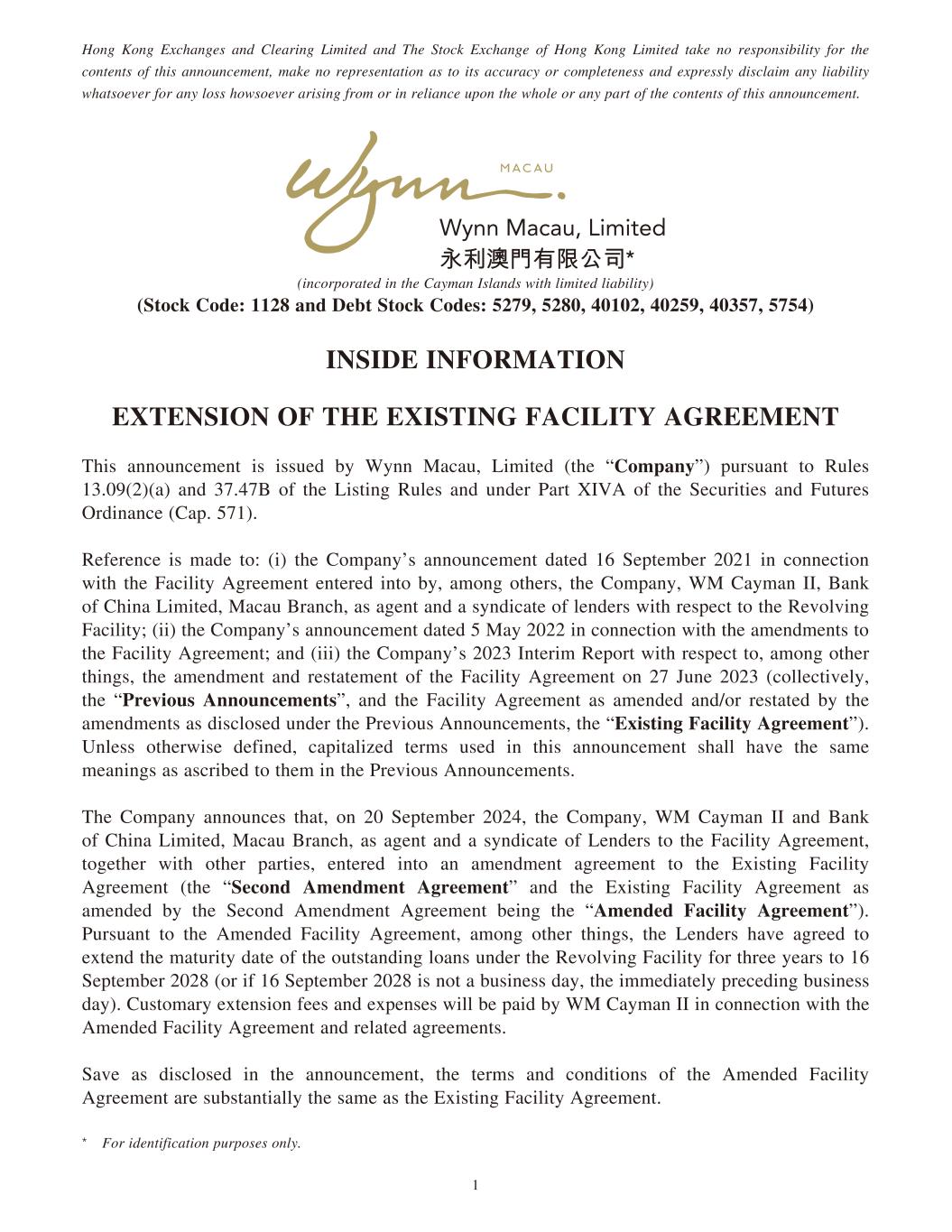 (1)WYNN MACAU, LIMITED, an exempted company incorporated in the Cayman Islands with limited liability with registered office at c/o Maples Corporate Services Limited, PO Box 309, Ugland House, South Church Street, George Town, Grand Cayman KY1-1104, Cayman Islands with registration number 230109 (the "Company");
