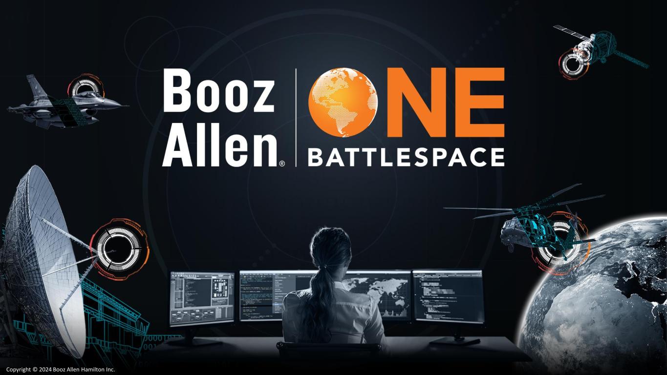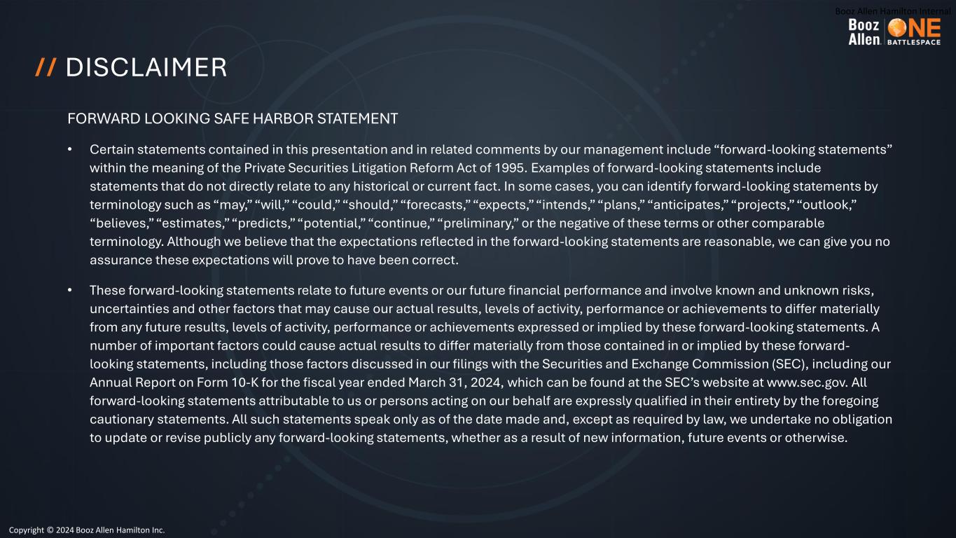 Booz Allen Hamilton Internal // DISCLAIMER FORWARD LOOKING SAFE HARBOR STATEMENT • Certain statements contained in this presentation and in related comments by our management include “forward-looking statements” within the meaning of the Private Securities Litigation Reform Act of 1995. Examples of forward-looking statements include statements that do not directly relate to any historical or current fact. In some cases, you can identify forward-looking statements by terminology such as “may,” “will,” “could,” “should,” “forecasts,” “expects,” “intends,” “plans,” “anticipates,” “projects,” “outlook,” “believes,” “estimates,” “predicts,” “potential,” “continue,” “preliminary,” or the negative of these terms or other comparable terminology. Although we believe that the expectations reflected in the forward-looking statements are reasonable, we can give you no assurance these expectations will prove to have been correct. • These forward-looking statements relate to future events or our future financial performance and involve known and unknown risks, uncertainties and other factors that may cause our actual results, levels of activity, performance or achievements to differ materially from any future results, levels of activity, performance or achievements expressed or implied by these forward-looking statements. A number of important factors could cause actual results to differ materially from those contained in or implied by these forward- looking statements, including those factors discussed in our filings with the Securities and Exchange Commission (SEC), including our Annual Report on Form 10-K for the fiscal year ended March 31, 2024, which can be found at the SEC’s website at www.sec.gov. All forward-looking statements attributable to us or persons acting on our behalf are expressly qualified in their entirety by the foregoing cautionary statements. All such statements speak only as of the date made and, except as required by law, we undertake no obligation to update or revise publicly any forward-looking statements, whether as a result of new information, future events or otherwise. Copyright © 2024 Booz Allen Hamilton Inc. Copyright © 2024 Booz Allen Hamilton Inc.