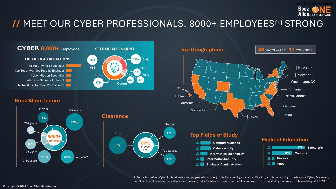 Booz Allen Hamilton Internal Booz Allen Tenure 8000+ employees 39% 1-3 years 4-6 years20% 7-10 years 11% 10+ years 15% <1 year 15% 20+ years 4% Top Fields of Study Computer Science Cybersecurity Information Technology Information Security Business Administration Highest Education Bachelor’s Master’s Doctoral MBA 47% 31% 8,000+ Employees TOP JOB CLASSIFICATIONS CYBER Info Security Risk Specialist Sys Security & Net Security Engineer Cyber Mission Specialist Enterprise Security Architect Network Exploitation Professional SECTOR ALIGNMENT GDS NSS Comm Civil Corp CTO 47% 25% 3% 18% 3% 3% Clearance 65% TS/SCI Top Secret 17% Secret 17% 87% of cyber talent // MEET OUR CYBER PROFESSIONALS. 8000+ EMPLOYEES [1] STRONG Top Geographies California Florida North Carolina Georgia Virginia Texas Washington, DC Maryland New York Colorado Hawaii 49 STATES and DC 13 COUNTRIES Copyright © 2024 Booz Allen Hamilton Inc. 1. Booz Allen defines Cyber Professionals as employees with a cyber job family or holding a cyber certification, and those working in the National Cyber, Everwatch, and Commercial business units (duplicates removed). Education levels, majors, and certifications are as self-reported by employees. Data as of August 1, 2024.