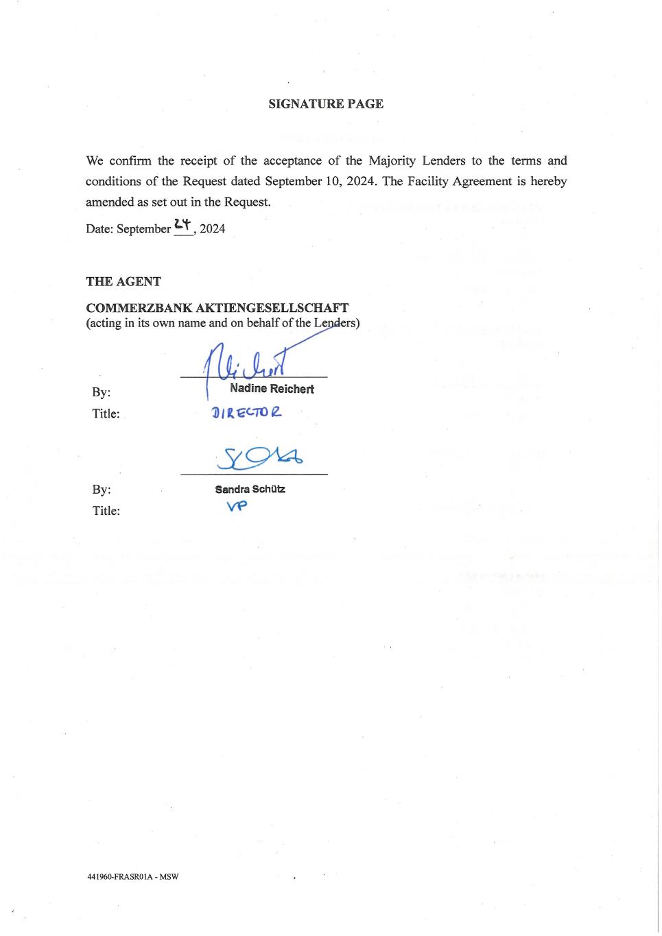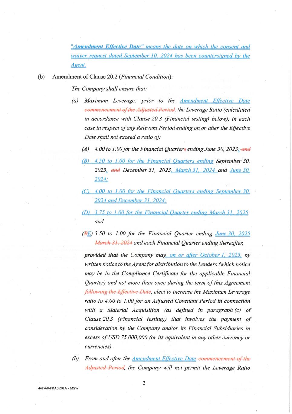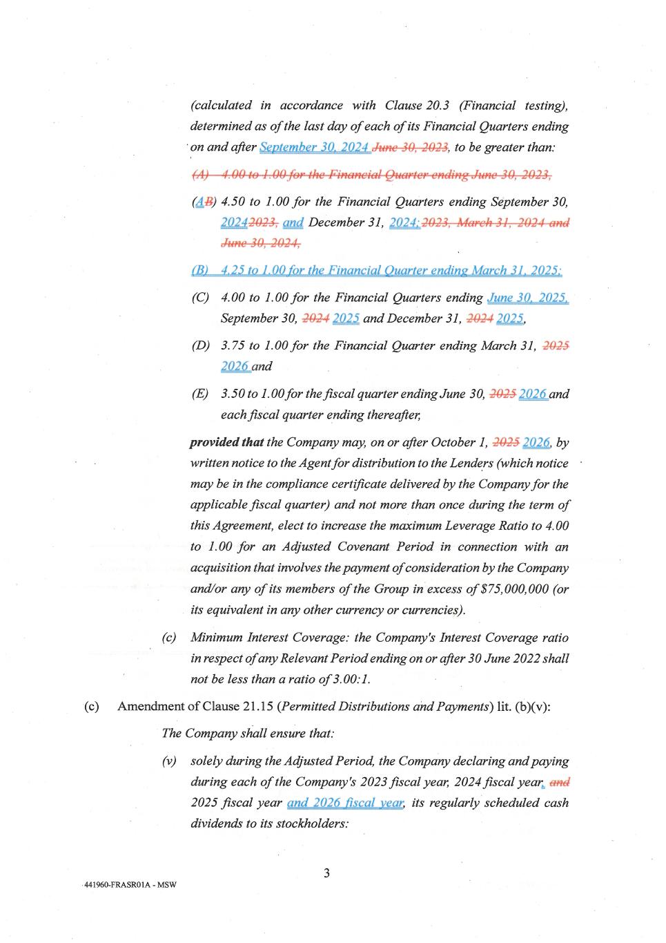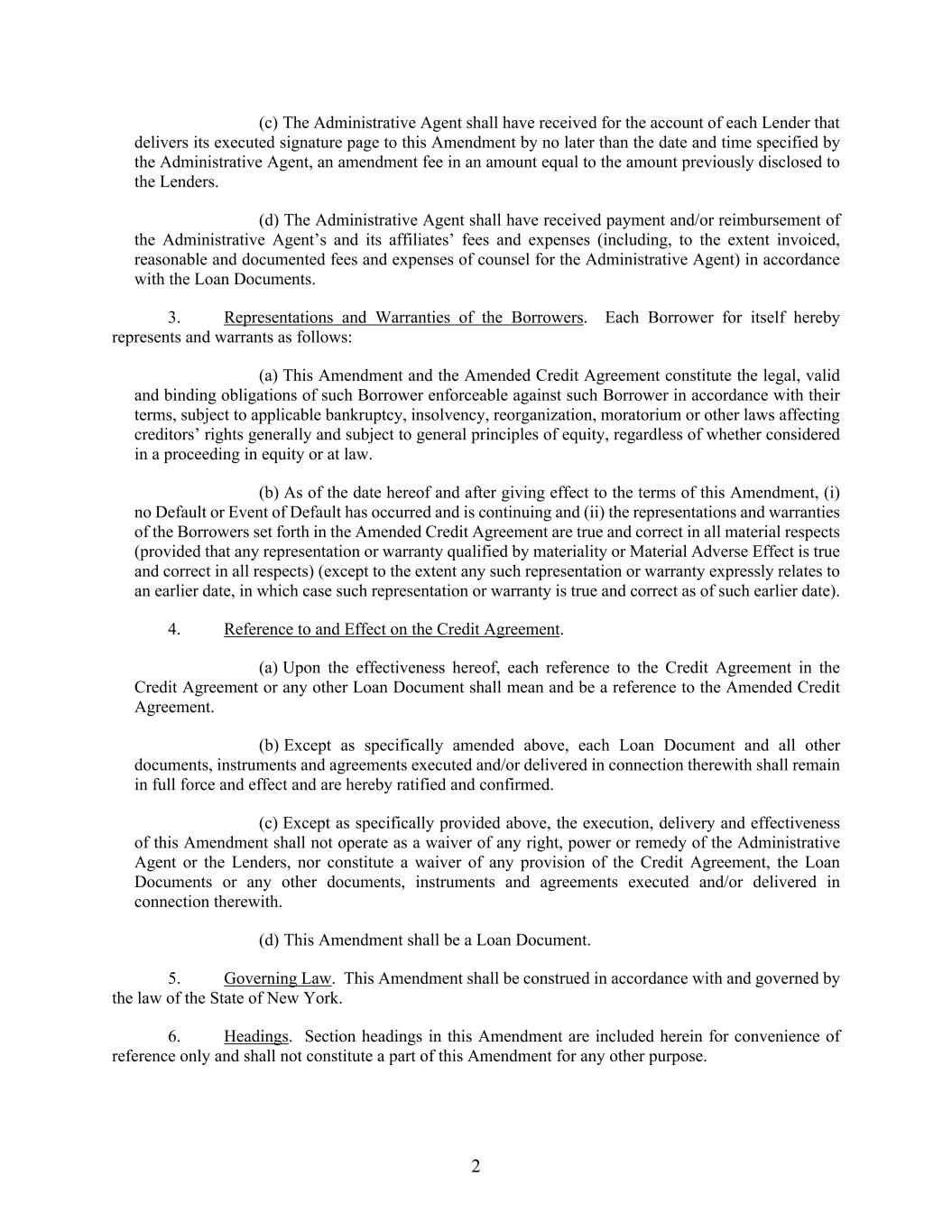 2 (c) The Administrative Agent shall have received for the account of each Lender that delivers its executed signature page to this Amendment by no later than the date and time specified by the Administrative Agent, an amendment fee in an amount equal to the amount previously disclosed to the Lenders. (d) The Administrative Agent shall have received payment and/or reimbursement of the Administrative Agent’s and its affiliates’ fees and expenses (including, to the extent invoiced, reasonable and documented fees and expenses of counsel for the Administrative Agent) in accordance with the Loan Documents. 3. Representations and Warranties of the Borrowers. Each Borrower for itself hereby represents and warrants as follows: (a) This Amendment and the Amended Credit Agreement constitute the legal, valid and binding obligations of such Borrower enforceable against such Borrower in accordance with their terms, subject to applicable bankruptcy, insolvency, reorganization, moratorium or other laws affecting creditors’ rights generally and subject to general principles of equity, regardless of whether considered in a proceeding in equity or at law. (b) As of the date hereof and after giving effect to the terms of this Amendment, (i) no Default or Event of Default has occurred and is continuing and (ii) the representations and warranties of the Borrowers set forth in the Amended Credit Agreement are true and correct in all material respects (provided that any representation or warranty qualified by materiality or Material Adverse Effect is true and correct in all respects) (except to the extent any such representation or warranty expressly relates to an earlier date, in which case such representation or warranty is true and correct as of such earlier date). 4. Reference to and Effect on the Credit Agreement. (a) Upon the effectiveness hereof, each reference to the Credit Agreement in the Credit Agreement or any other Loan Document shall mean and be a reference to the Amended Credit Agreement. (b) Except as specifically amended above, each Loan Document and all other documents, instruments and agreements executed and/or delivered in connection therewith shall remain in full force and effect and are hereby ratified and confirmed. (c) Except as specifically provided above, the execution, delivery and effectiveness of this Amendment shall not operate as a waiver of any right, power or remedy of the Administrative Agent or the Lenders, nor constitute a waiver of any provision of the Credit Agreement, the Loan Documents or any other documents, instruments and agreements executed and/or delivered in connection therewith. (d) This Amendment shall be a Loan Document. 5. Governing Law. This Amendment shall be construed in accordance with and governed by the law of the State of New York. 6. Headings. Section headings in this Amendment are included herein for convenience of reference only and shall not constitute a part of this Amendment for any other purpose.