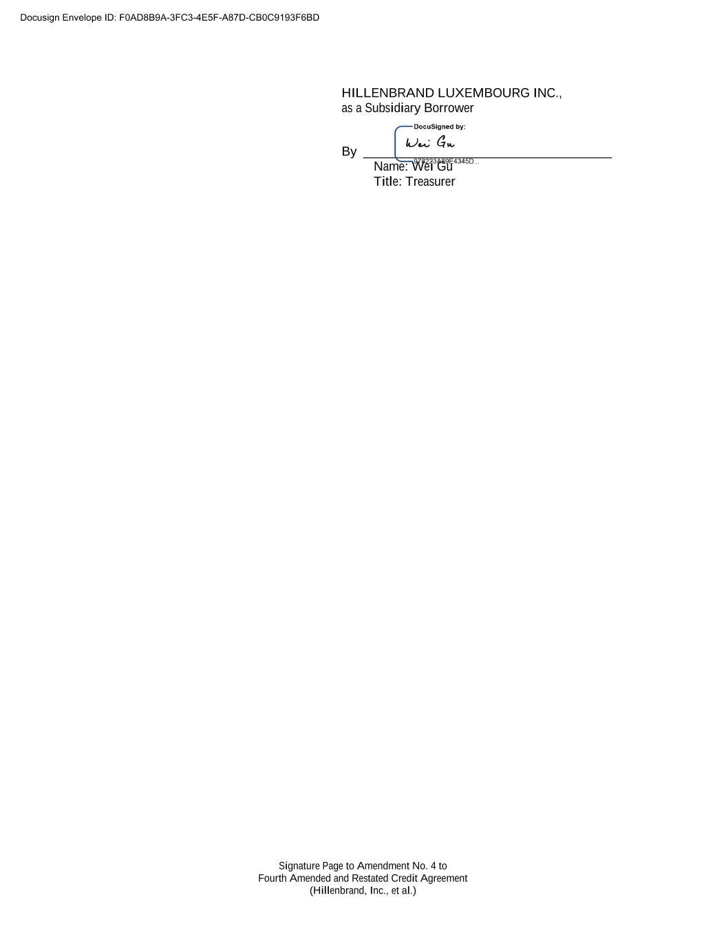 Signature Page to Amendment No. 4 to Fourth Amended and Restated Credit Agreement (Hillenbrand, Inc., et al.) HILLENBRAND LUXEMBOURG INC., as a Subsidiary Borrower By ______________________________________ Name: Wei Gu Title: Treasurer