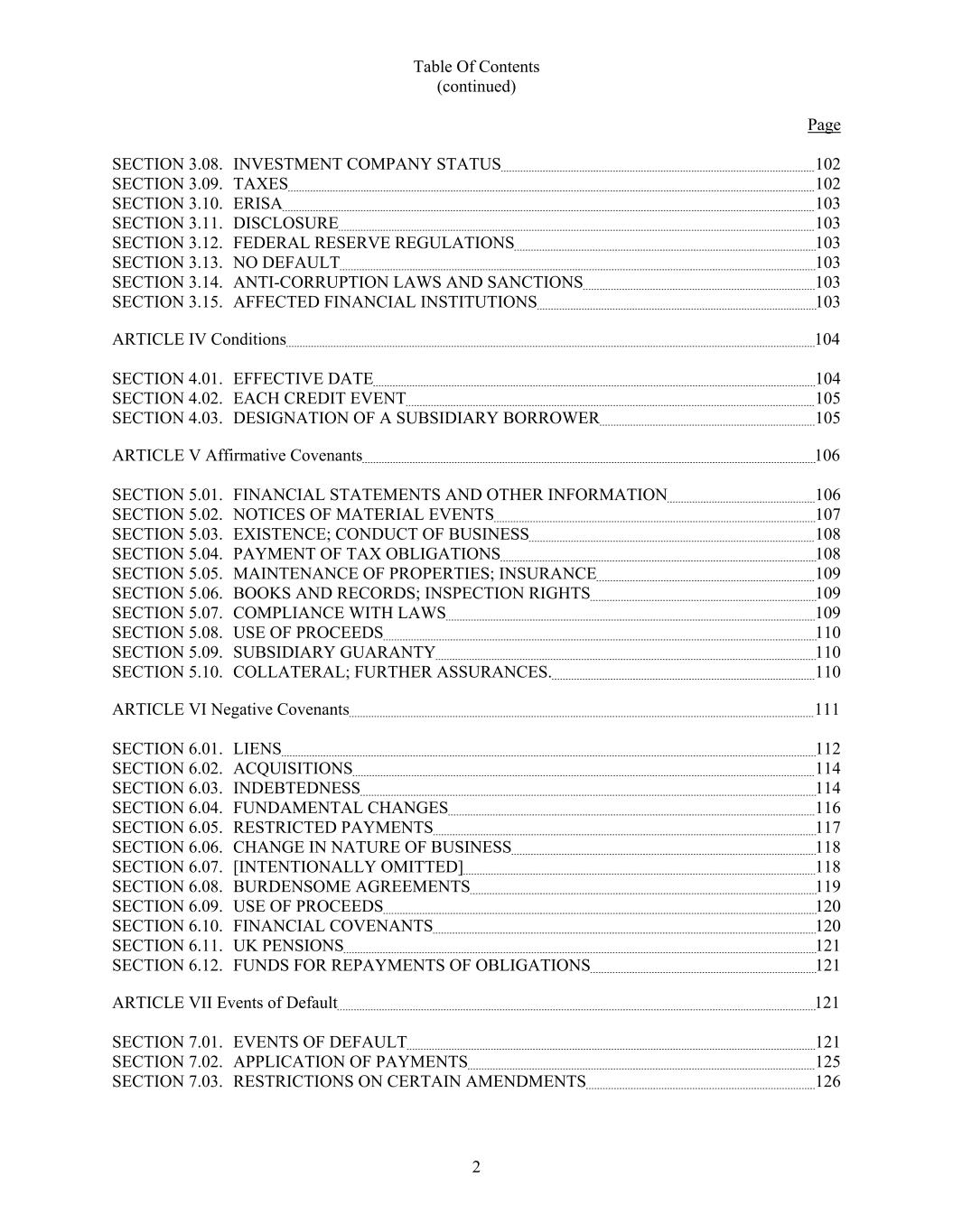 Table Of Contents (continued) Page SECTION 3.08. INVESTMENT COMPANY STATUS 102 SECTION 3.09. TAXES 102 SECTION 3.10. ERISA 103 SECTION 3.11. DISCLOSURE 103 SECTION 3.12. FEDERAL RESERVE REGULATIONS 103 SECTION 3.13. NO DEFAULT 103 SECTION 3.14. ANTI-CORRUPTION LAWS AND SANCTIONS 103 SECTION 3.15. AFFECTED FINANCIAL INSTITUTIONS 103 ARTICLE IV Conditions 104 SECTION 4.01. EFFECTIVE DATE 104 SECTION 4.02. EACH CREDIT EVENT 105 SECTION 4.03. DESIGNATION OF A SUBSIDIARY BORROWER 105 ARTICLE V Affirmative Covenants 106 SECTION 5.01. FINANCIAL STATEMENTS AND OTHER INFORMATION 106 SECTION 5.02. NOTICES OF MATERIAL EVENTS 107 SECTION 5.03. EXISTENCE; CONDUCT OF BUSINESS 108 SECTION 5.04. PAYMENT OF TAX OBLIGATIONS 108 SECTION 5.05. MAINTENANCE OF PROPERTIES; INSURANCE 109 SECTION 5.06. BOOKS AND RECORDS; INSPECTION RIGHTS 109 SECTION 5.07. COMPLIANCE WITH LAWS 109 SECTION 5.08. USE OF PROCEEDS 110 SECTION 5.09. SUBSIDIARY GUARANTY 110 SECTION 5.10. COLLATERAL; FURTHER ASSURANCES. 110 ARTICLE VI Negative Covenants 111 SECTION 6.01. LIENS 112 SECTION 6.02. ACQUISITIONS 114 SECTION 6.03. INDEBTEDNESS 114 SECTION 6.04. FUNDAMENTAL CHANGES 116 SECTION 6.05. RESTRICTED PAYMENTS 117 SECTION 6.06. CHANGE IN NATURE OF BUSINESS 118 SECTION 6.07. [INTENTIONALLY OMITTED] 118 SECTION 6.08. BURDENSOME AGREEMENTS 119 SECTION 6.09. USE OF PROCEEDS 120 SECTION 6.10. FINANCIAL COVENANTS 120 SECTION 6.11. UK PENSIONS 121 SECTION 6.12. FUNDS FOR REPAYMENTS OF OBLIGATIONS 121 ARTICLE VII Events of Default 121 SECTION 7.01. EVENTS OF DEFAULT 121 SECTION 7.02. APPLICATION OF PAYMENTS 125 SECTION 7.03. RESTRICTIONS ON CERTAIN AMENDMENTS 126 2