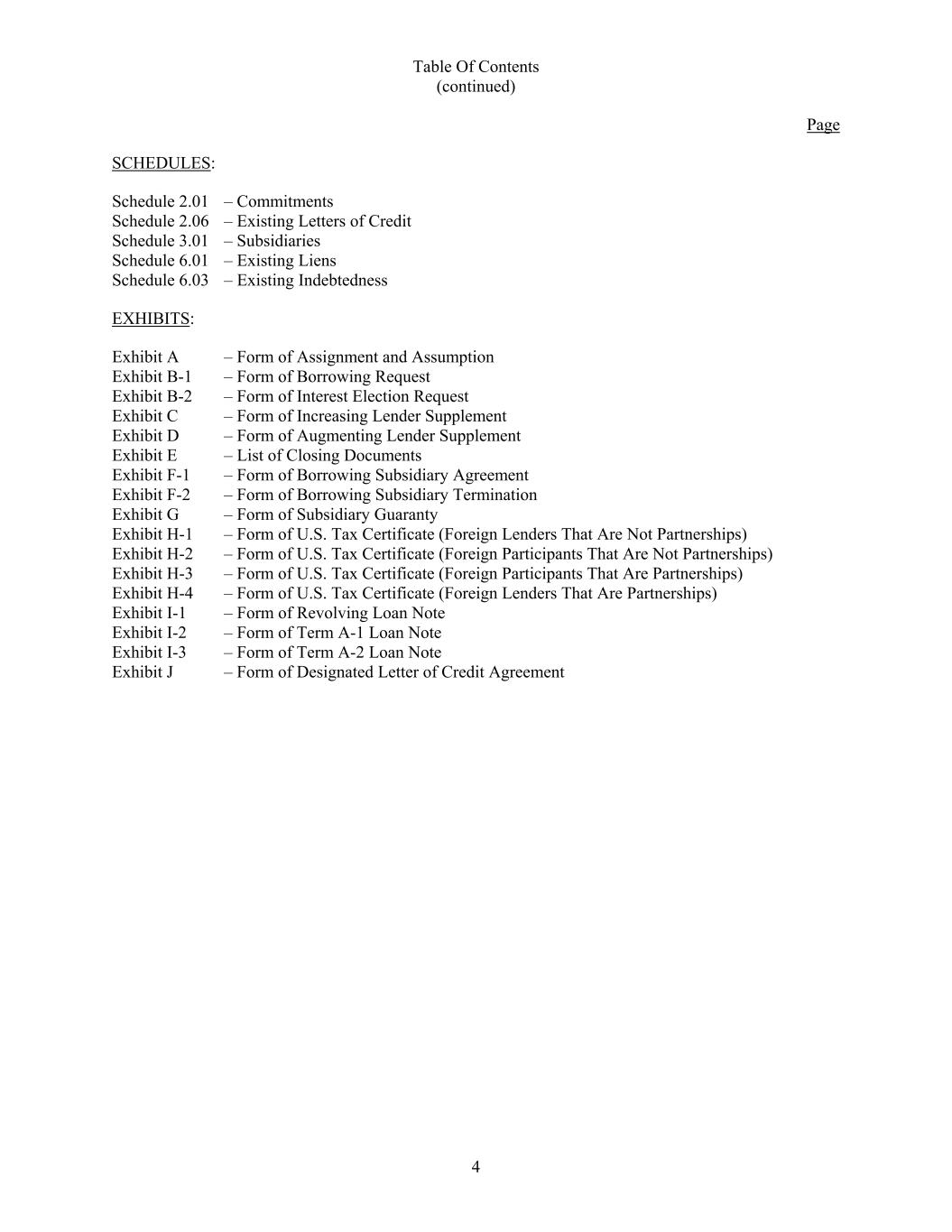 Table Of Contents (continued) Page SCHEDULES: Schedule 2.01 – Commitments Schedule 2.06 – Existing Letters of Credit Schedule 3.01 – Subsidiaries Schedule 6.01 – Existing Liens Schedule 6.03 – Existing Indebtedness EXHIBITS: Exhibit A – Form of Assignment and Assumption Exhibit B-1 – Form of Borrowing Request Exhibit B-2 – Form of Interest Election Request Exhibit C – Form of Increasing Lender Supplement Exhibit D – Form of Augmenting Lender Supplement Exhibit E – List of Closing Documents Exhibit F-1 – Form of Borrowing Subsidiary Agreement Exhibit F-2 – Form of Borrowing Subsidiary Termination Exhibit G – Form of Subsidiary Guaranty Exhibit H-1 – Form of U.S. Tax Certificate (Foreign Lenders That Are Not Partnerships) Exhibit H-2 – Form of U.S. Tax Certificate (Foreign Participants That Are Not Partnerships) Exhibit H-3 – Form of U.S. Tax Certificate (Foreign Participants That Are Partnerships) Exhibit H-4 – Form of U.S. Tax Certificate (Foreign Lenders That Are Partnerships) Exhibit I-1 – Form of Revolving Loan Note Exhibit I-2 – Form of Term A-1 Loan Note Exhibit I-3 – Form of Term A-2 Loan Note Exhibit J – Form of Designated Letter of Credit Agreement 4