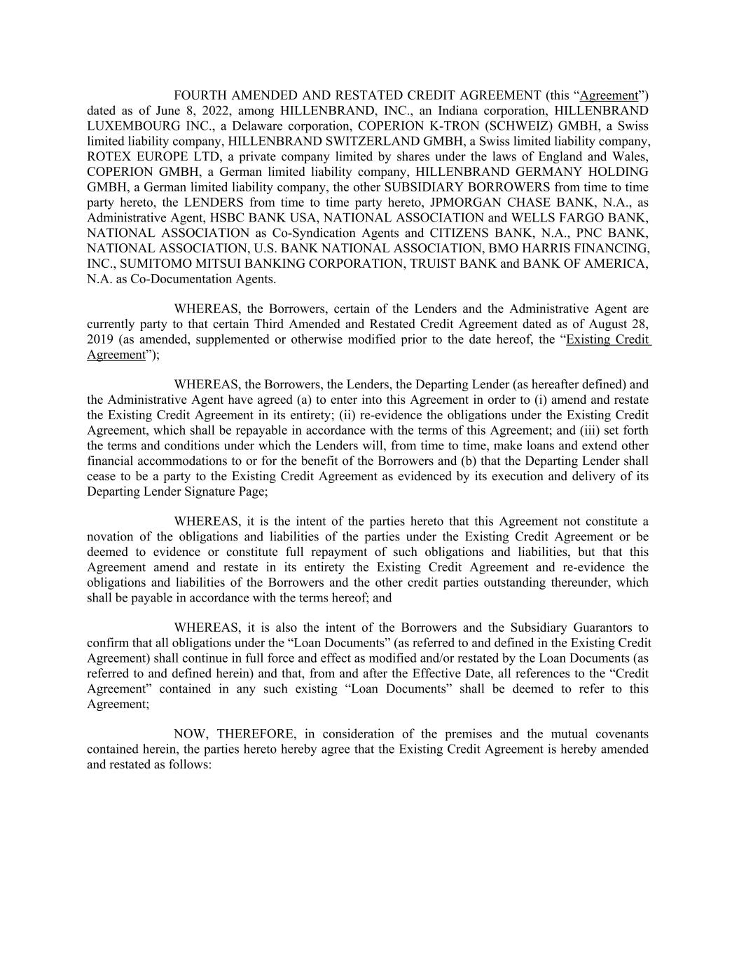 FOURTH AMENDED AND RESTATED CREDIT AGREEMENT (this “Agreement”) dated as of June 8, 2022, among HILLENBRAND, INC., an Indiana corporation, HILLENBRAND LUXEMBOURG INC., a Delaware corporation, COPERION K-TRON (SCHWEIZ) GMBH, a Swiss limited liability company, HILLENBRAND SWITZERLAND GMBH, a Swiss limited liability company, ROTEX EUROPE LTD, a private company limited by shares under the laws of England and Wales, COPERION GMBH, a German limited liability company, HILLENBRAND GERMANY HOLDING GMBH, a German limited liability company, the other SUBSIDIARY BORROWERS from time to time party hereto, the LENDERS from time to time party hereto, JPMORGAN CHASE BANK, N.A., as Administrative Agent, HSBC BANK USA, NATIONAL ASSOCIATION and WELLS FARGO BANK, NATIONAL ASSOCIATION as Co-Syndication Agents and CITIZENS BANK, N.A., PNC BANK, NATIONAL ASSOCIATION, U.S. BANK NATIONAL ASSOCIATION, BMO HARRIS FINANCING, INC., SUMITOMO MITSUI BANKING CORPORATION, TRUIST BANK and BANK OF AMERICA, N.A. as Co-Documentation Agents. WHEREAS, the Borrowers, certain of the Lenders and the Administrative Agent are currently party to that certain Third Amended and Restated Credit Agreement dated as of August 28, 2019 (as amended, supplemented or otherwise modified prior to the date hereof, the “Existing Credit Agreement”); WHEREAS, the Borrowers, the Lenders, the Departing Lender (as hereafter defined) and the Administrative Agent have agreed (a) to enter into this Agreement in order to (i) amend and restate the Existing Credit Agreement in its entirety; (ii) re-evidence the obligations under the Existing Credit Agreement, which shall be repayable in accordance with the terms of this Agreement; and (iii) set forth the terms and conditions under which the Lenders will, from time to time, make loans and extend other financial accommodations to or for the benefit of the Borrowers and (b) that the Departing Lender shall cease to be a party to the Existing Credit Agreement as evidenced by its execution and delivery of its Departing Lender Signature Page; WHEREAS, it is the intent of the parties hereto that this Agreement not constitute a novation of the obligations and liabilities of the parties under the Existing Credit Agreement or be deemed to evidence or constitute full repayment of such obligations and liabilities, but that this Agreement amend and restate in its entirety the Existing Credit Agreement and re-evidence the obligations and liabilities of the Borrowers and the other credit parties outstanding thereunder, which shall be payable in accordance with the terms hereof; and WHEREAS, it is also the intent of the Borrowers and the Subsidiary Guarantors to confirm that all obligations under the “Loan Documents” (as referred to and defined in the Existing Credit Agreement) shall continue in full force and effect as modified and/or restated by the Loan Documents (as referred to and defined herein) and that, from and after the Effective Date, all references to the “Credit Agreement” contained in any such existing “Loan Documents” shall be deemed to refer to this Agreement; NOW, THEREFORE, in consideration of the premises and the mutual covenants contained herein, the parties hereto hereby agree that the Existing Credit Agreement is hereby amended and restated as follows: