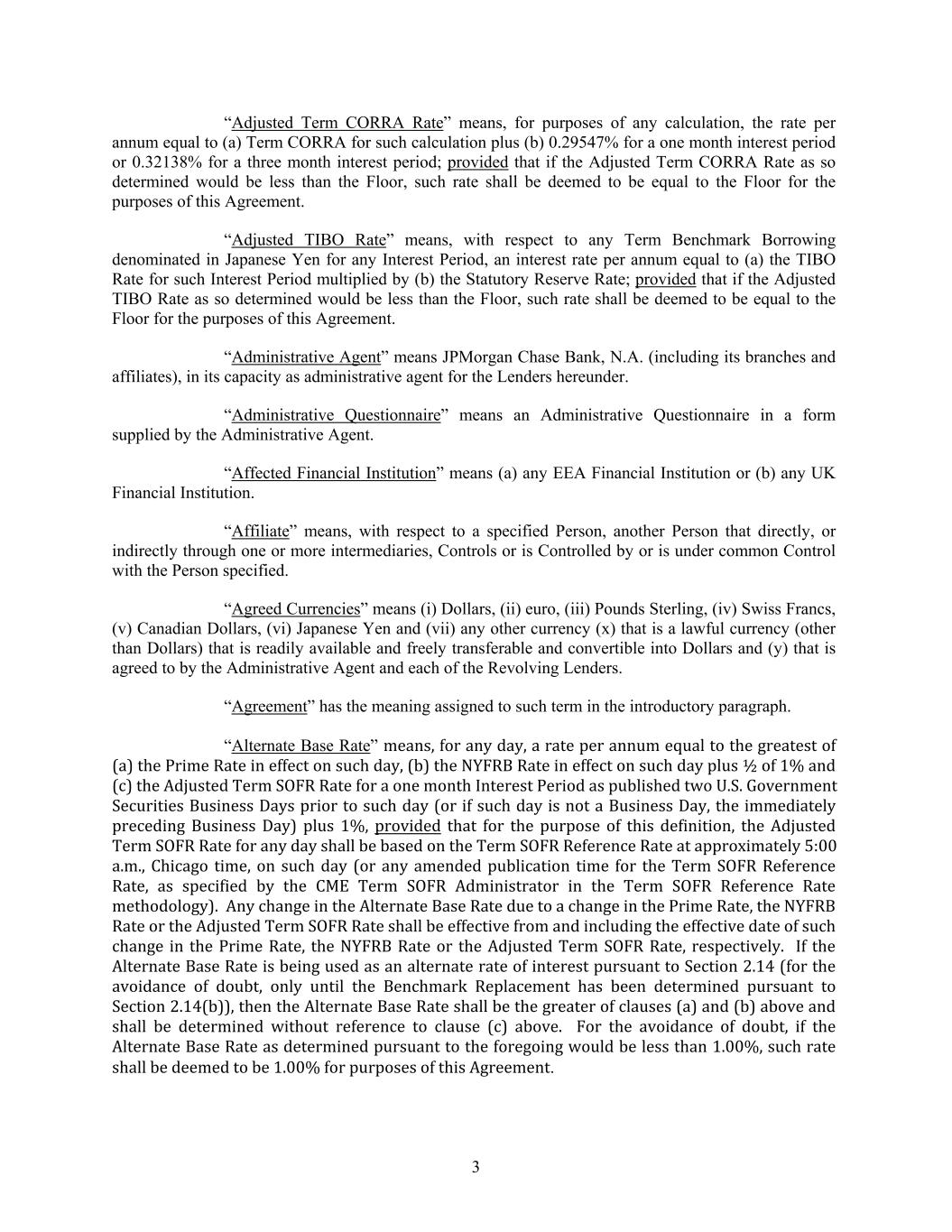 “Adjusted Term CORRA Rate” means, for purposes of any calculation, the rate per annum equal to (a) Term CORRA for such calculation plus (b) 0.29547% for a one month interest period or 0.32138% for a three month interest period; provided that if the Adjusted Term CORRA Rate as so determined would be less than the Floor, such rate shall be deemed to be equal to the Floor for the purposes of this Agreement. “Adjusted TIBO Rate” means, with respect to any Term Benchmark Borrowing denominated in Japanese Yen for any Interest Period, an interest rate per annum equal to (a) the TIBO Rate for such Interest Period multiplied by (b) the Statutory Reserve Rate; provided that if the Adjusted TIBO Rate as so determined would be less than the Floor, such rate shall be deemed to be equal to the Floor for the purposes of this Agreement. “Administrative Agent” means JPMorgan Chase Bank, N.A. (including its branches and affiliates), in its capacity as administrative agent for the Lenders hereunder. “Administrative Questionnaire” means an Administrative Questionnaire in a form supplied by the Administrative Agent. “Affected Financial Institution” means (a) any EEA Financial Institution or (b) any UK Financial Institution. “Affiliate” means, with respect to a specified Person, another Person that directly, or indirectly through one or more intermediaries, Controls or is Controlled by or is under common Control with the Person specified. “Agreed Currencies” means (i) Dollars, (ii) euro, (iii) Pounds Sterling, (iv) Swiss Francs, (v) Canadian Dollars, (vi) Japanese Yen and (vii) any other currency (x) that is a lawful currency (other than Dollars) that is readily available and freely transferable and convertible into Dollars and (y) that is agreed to by the Administrative Agent and each of the Revolving Lenders. “Agreement” has the meaning assigned to such term in the introductory paragraph. “Alternate Base Rate” means, for any day, a rate per annum equal to the greatest of(a) the Prime Rate in effect on such day, (b) the NYFRB Rate in effect on such day plus ½ of 1% and(c) the Adjusted Term SOFR Rate for a one month Interest Period as published two U.S. GovernmentSecurities Business Days prior to such day (or if such day is not a Business Day, the immediatelypreceding Business Day) plus 1%, provided that for the purpose of this definition, the AdjustedTerm SOFR Rate for any day shall be based on the Term SOFR Reference Rate at approximately 5:00a.m., Chicago time, on such day (or any amended publication time for the Term SOFR ReferenceRate, as specified by the CME Term SOFR Administrator in the Term SOFR Reference Ratemethodology). Any change in the Alternate Base Rate due to a change in the Prime Rate, the NYFRBRate or the Adjusted Term SOFR Rate shall be effective from and including the effective date of suchchange in the Prime Rate, the NYFRB Rate or the Adjusted Term SOFR Rate, respectively. If theAlternate Base Rate is being used as an alternate rate of interest pursuant to Section 2.14 (for theavoidance of doubt, only until the Benchmark Replacement has been determined pursuant toSection 2.14(b)), then the Alternate Base Rate shall be the greater of clauses (a) and (b) above andshall be determined without reference to clause (c) above. For the avoidance of doubt, if theAlternate Base Rate as determined pursuant to the foregoing would be less than 1.00%, such rateshall be deemed to be 1.00% for purposes of this Agreement. 3