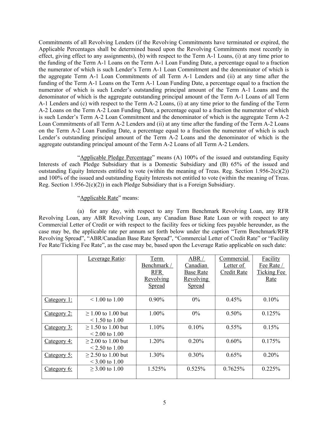 5 0.90% 1.10% 0.10% 0% 0.55% ABR / Canadian Base Rate Revolving Spread 0.15% 0.45% Category 4: 0.10% ≥ 2.00 to 1.00 but < 2.50 to 1.00 Commercial Letter of Credit Rate 1.20% 0.20% 0.60% Category 2: 0.175% Facility Fee Rate / Ticking Fee Rate ≥ 1.00 to 1.00 but < 1.50 to 1.00 Category 5: ≥ 2.50 to 1.00 but < 3.00 to 1.00 1.00% 1.30% 0.30% 0% 0.65% Leverage Ratio: 0.20% 0.50% Category 1: Category 6: 0.125% ≥ 3.00 to 1.00 Commitments of all Revolving Lenders (if the Revolving Commitments have terminated or expired, the Applicable Percentages shall be determined based upon the Revolving Commitments most recently in effect, giving effect to any assignments), (b) with respect to the Term A-1 Loans, (i) at any time prior to the funding of the Term A-1 Loans on the Term A-1 Loan Funding Date, a percentage equal to a fraction the numerator of which is such Lender’s Term A-1 Loan Commitment and the denominator of which is the aggregate Term A-1 Loan Commitments of all Term A-1 Lenders and (ii) at any time after the funding of the Term A-1 Loans on the Term A-1 Loan Funding Date, a percentage equal to a fraction the numerator of which is such Lender’s outstanding principal amount of the Term A-1 Loans and the denominator of which is the aggregate outstanding principal amount of the Term A-1 Loans of all Term A-1 Lenders and (c) with respect to the Term A-2 Loans, (i) at any time prior to the funding of the Term A-2 Loans on the Term A-2 Loan Funding Date, a percentage equal to a fraction the numerator of which is such Lender’s Term A-2 Loan Commitment and the denominator of which is the aggregate Term A-2 Loan Commitments of all Term A-2 Lenders and (ii) at any time after the funding of the Term A-2 Loans on the Term A-2 Loan Funding Date, a percentage equal to a fraction the numerator of which is such Lender’s outstanding principal amount of the Term A-2 Loans and the denominator of which is the aggregate outstanding principal amount of the Term A-2 Loans of all Term A-2 Lenders. “Applicable Pledge Percentage” means (A) 100% of the issued and outstanding Equity Interests of each Pledge Subsidiary that is a Domestic Subsidiary and (B) 65% of the issued and outstanding Equity Interests entitled to vote (within the meaning of Treas. Reg. Section 1.956-2(c)(2)) and 100% of the issued and outstanding Equity Interests not entitled to vote (within the meaning of Treas. Reg. Section 1.956-2(c)(2)) in each Pledge Subsidiary that is a Foreign Subsidiary. “Applicable Rate” means: (a) for any day, with respect to any Term Benchmark Revolving Loan, any RFR Revolving Loan, any ABR Revolving Loan, any Canadian Base Rate Loan or with respect to any Commercial Letter of Credit or with respect to the facility fees or ticking fees payable hereunder, as the case may be, the applicable rate per annum set forth below under the caption “Term Benchmark/RFR Revolving Spread”, “ABR/Canadian Base Rate Spread”, “Commercial Letter of Credit Rate” or “Facility Fee Rate/Ticking Fee Rate”, as the case may be, based upon the Leverage Ratio applicable on such date: 1.525% 0.525% < 1.00 to 1.00 0.7625% Category 3: 0.225% Term Benchmark / RFR Revolving Spread ≥ 1.50 to 1.00 but < 2.00 to 1.00