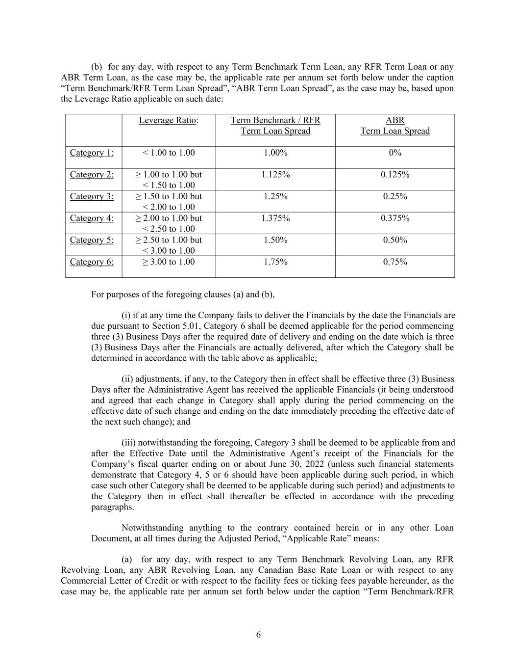 6 ≥ 1.50 to 1.00 but < 2.00 to 1.00 < 1.00 to 1.00 1.25% Leverage Ratio: 0.25% 1.00% (b) for any day, with respect to any Term Benchmark Term Loan, any RFR Term Loan or any ABR Term Loan, as the case may be, the applicable rate per annum set forth below under the caption “Term Benchmark/RFR Term Loan Spread”, “ABR Term Loan Spread”, as the case may be, based upon the Leverage Ratio applicable on such date: Category 4: 0% ≥ 2.00 to 1.00 but < 2.50 to 1.00 Term Benchmark / RFR Term Loan Spread 1.375% 0.375% Category 2: Category 5: ABR Term Loan Spread ≥ 2.50 to 1.00 but < 3.00 to 1.00 ≥ 1.00 to 1.00 but < 1.50 to 1.00 1.50% 0.50% 1.125% Category 6: 0.125% ≥ 3.00 to 1.00 1.75% 0.75% Category 1: For purposes of the foregoing clauses (a) and (b), (i) if at any time the Company fails to deliver the Financials by the date the Financials are due pursuant to Section 5.01, Category 6 shall be deemed applicable for the period commencing three (3) Business Days after the required date of delivery and ending on the date which is three (3) Business Days after the Financials are actually delivered, after which the Category shall be determined in accordance with the table above as applicable; (ii) adjustments, if any, to the Category then in effect shall be effective three (3) Business Days after the Administrative Agent has received the applicable Financials (it being understood and agreed that each change in Category shall apply during the period commencing on the effective date of such change and ending on the date immediately preceding the effective date of the next such change); and (iii) notwithstanding the foregoing, Category 3 shall be deemed to be applicable from and after the Effective Date until the Administrative Agent’s receipt of the Financials for the Company’s fiscal quarter ending on or about June 30, 2022 (unless such financial statements demonstrate that Category 4, 5 or 6 should have been applicable during such period, in which case such other Category shall be deemed to be applicable during such period) and adjustments to the Category then in effect shall thereafter be effected in accordance with the preceding paragraphs. Notwithstanding anything to the contrary contained herein or in any other Loan Document, at all times during the Adjusted Period, “Applicable Rate” means: (a) for any day, with respect to any Term Benchmark Revolving Loan, any RFR Revolving Loan, any ABR Revolving Loan, any Canadian Base Rate Loan or with respect to any Commercial Letter of Credit or with respect to the facility fees or ticking fees payable hereunder, as the case may be, the applicable rate per annum set forth below under the caption “Term Benchmark/RFR Category 3: