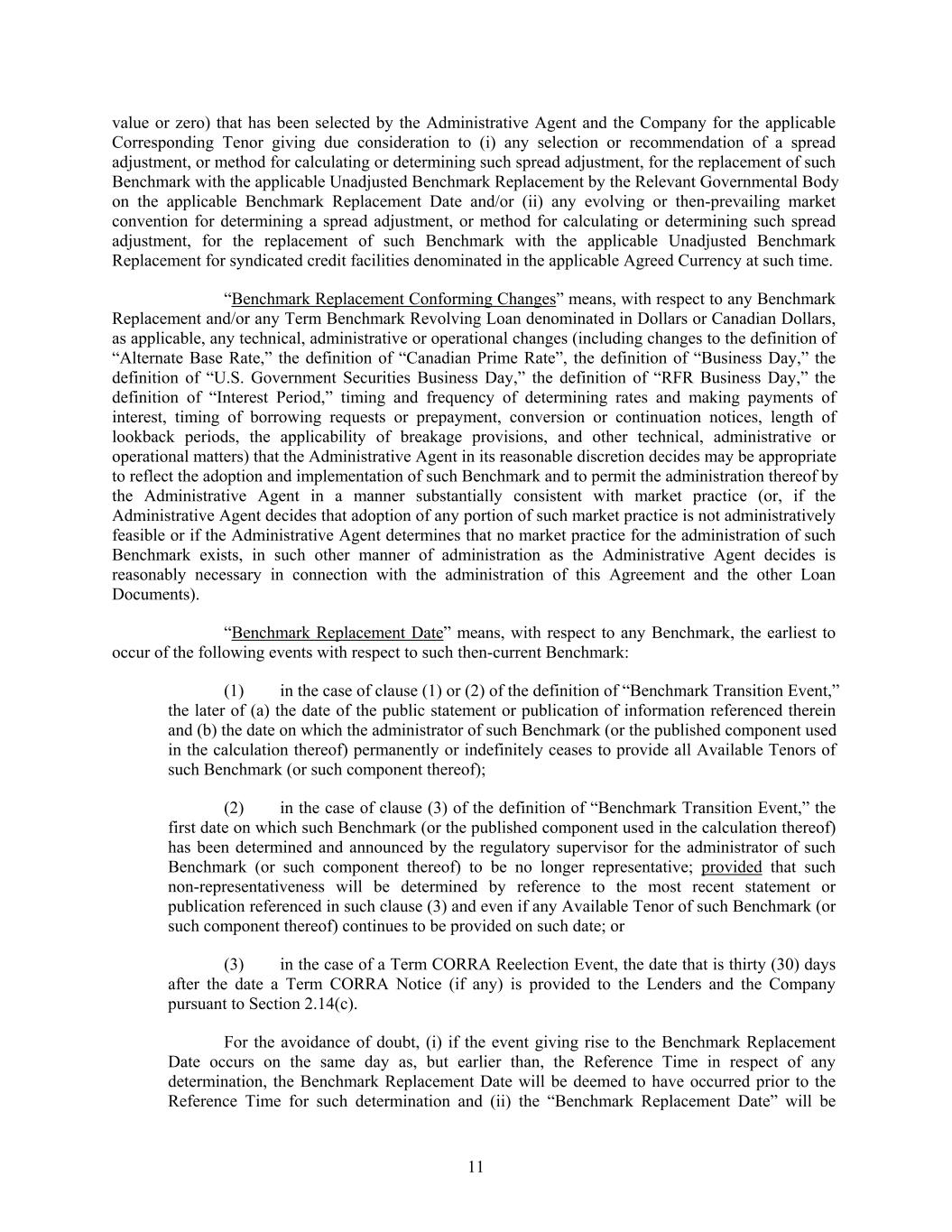 value or zero) that has been selected by the Administrative Agent and the Company for the applicable Corresponding Tenor giving due consideration to (i) any selection or recommendation of a spread adjustment, or method for calculating or determining such spread adjustment, for the replacement of such Benchmark with the applicable Unadjusted Benchmark Replacement by the Relevant Governmental Body on the applicable Benchmark Replacement Date and/or (ii) any evolving or then-prevailing market convention for determining a spread adjustment, or method for calculating or determining such spread adjustment, for the replacement of such Benchmark with the applicable Unadjusted Benchmark Replacement for syndicated credit facilities denominated in the applicable Agreed Currency at such time. “Benchmark Replacement Conforming Changes” means, with respect to any Benchmark Replacement and/or any Term Benchmark Revolving Loan denominated in Dollars or Canadian Dollars, as applicable, any technical, administrative or operational changes (including changes to the definition of “Alternate Base Rate,” the definition of “Canadian Prime Rate”, the definition of “Business Day,” the definition of “U.S. Government Securities Business Day,” the definition of “RFR Business Day,” the definition of “Interest Period,” timing and frequency of determining rates and making payments of interest, timing of borrowing requests or prepayment, conversion or continuation notices, length of lookback periods, the applicability of breakage provisions, and other technical, administrative or operational matters) that the Administrative Agent in its reasonable discretion decides may be appropriate to reflect the adoption and implementation of such Benchmark and to permit the administration thereof by the Administrative Agent in a manner substantially consistent with market practice (or, if the Administrative Agent decides that adoption of any portion of such market practice is not administratively feasible or if the Administrative Agent determines that no market practice for the administration of such Benchmark exists, in such other manner of administration as the Administrative Agent decides is reasonably necessary in connection with the administration of this Agreement and the other Loan Documents). “Benchmark Replacement Date” means, with respect to any Benchmark, the earliest to occur of the following events with respect to such then-current Benchmark: (1) in the case of clause (1) or (2) of the definition of “Benchmark Transition Event,” the later of (a) the date of the public statement or publication of information referenced therein and (b) the date on which the administrator of such Benchmark (or the published component used in the calculation thereof) permanently or indefinitely ceases to provide all Available Tenors of such Benchmark (or such component thereof); (2) in the case of clause (3) of the definition of “Benchmark Transition Event,” the first date on which such Benchmark (or the published component used in the calculation thereof) has been determined and announced by the regulatory supervisor for the administrator of such Benchmark (or such component thereof) to be no longer representative; provided that such non-representativeness will be determined by reference to the most recent statement or publication referenced in such clause (3) and even if any Available Tenor of such Benchmark (or such component thereof) continues to be provided on such date; or (3) in the case of a Term CORRA Reelection Event, the date that is thirty (30) days after the date a Term CORRA Notice (if any) is provided to the Lenders and the Company pursuant to Section 2.14(c). For the avoidance of doubt, (i) if the event giving rise to the Benchmark Replacement Date occurs on the same day as, but earlier than, the Reference Time in respect of any determination, the Benchmark Replacement Date will be deemed to have occurred prior to the Reference Time for such determination and (ii) the “Benchmark Replacement Date” will be 11