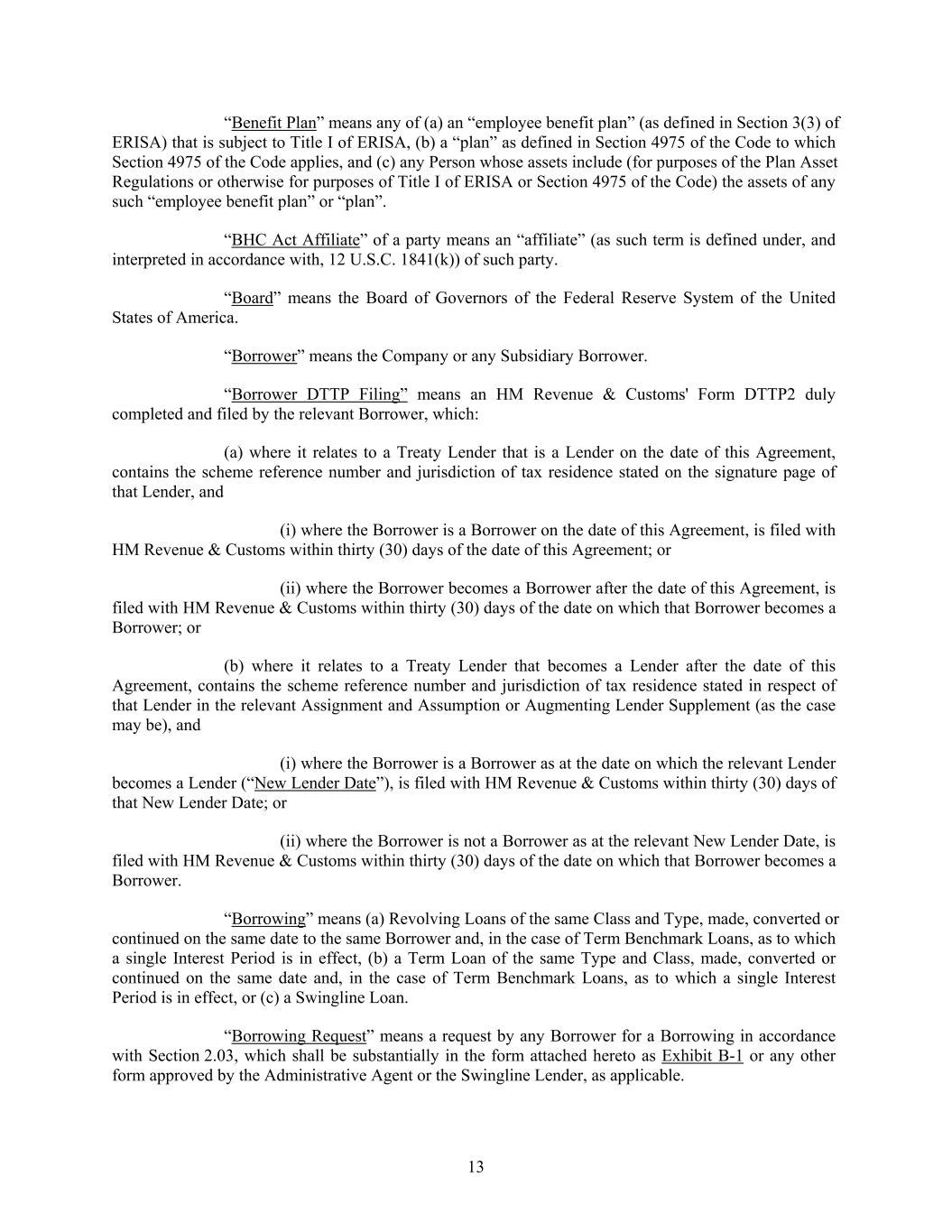 “Benefit Plan” means any of (a) an “employee benefit plan” (as defined in Section 3(3) of ERISA) that is subject to Title I of ERISA, (b) a “plan” as defined in Section 4975 of the Code to which Section 4975 of the Code applies, and (c) any Person whose assets include (for purposes of the Plan Asset Regulations or otherwise for purposes of Title I of ERISA or Section 4975 of the Code) the assets of any such “employee benefit plan” or “plan”. “BHC Act Affiliate” of a party means an “affiliate” (as such term is defined under, and interpreted in accordance with, 12 U.S.C. 1841(k)) of such party. “Board” means the Board of Governors of the Federal Reserve System of the United States of America. “Borrower” means the Company or any Subsidiary Borrower. “Borrower DTTP Filing” means an HM Revenue & Customs' Form DTTP2 duly completed and filed by the relevant Borrower, which: (a) where it relates to a Treaty Lender that is a Lender on the date of this Agreement, contains the scheme reference number and jurisdiction of tax residence stated on the signature page of that Lender, and (i) where the Borrower is a Borrower on the date of this Agreement, is filed with HM Revenue & Customs within thirty (30) days of the date of this Agreement; or (ii) where the Borrower becomes a Borrower after the date of this Agreement, is filed with HM Revenue & Customs within thirty (30) days of the date on which that Borrower becomes a Borrower; or (b) where it relates to a Treaty Lender that becomes a Lender after the date of this Agreement, contains the scheme reference number and jurisdiction of tax residence stated in respect of that Lender in the relevant Assignment and Assumption or Augmenting Lender Supplement (as the case may be), and (i) where the Borrower is a Borrower as at the date on which the relevant Lender becomes a Lender (“New Lender Date”), is filed with HM Revenue & Customs within thirty (30) days of that New Lender Date; or (ii) where the Borrower is not a Borrower as at the relevant New Lender Date, is filed with HM Revenue & Customs within thirty (30) days of the date on which that Borrower becomes a Borrower. “Borrowing” means (a) Revolving Loans of the same Class and Type, made, converted or continued on the same date to the same Borrower and, in the case of Term Benchmark Loans, as to which a single Interest Period is in effect, (b) a Term Loan of the same Type and Class, made, converted or continued on the same date and, in the case of Term Benchmark Loans, as to which a single Interest Period is in effect, or (c) a Swingline Loan. “Borrowing Request” means a request by any Borrower for a Borrowing in accordance with Section 2.03, which shall be substantially in the form attached hereto as Exhibit B-1 or any other form approved by the Administrative Agent or the Swingline Lender, as applicable. 13