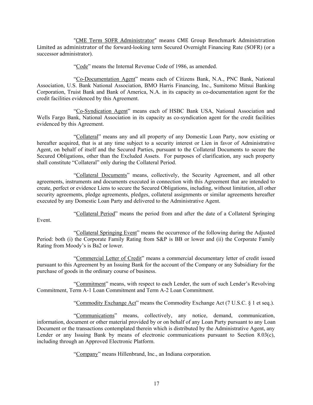 “CME Term SOFR Administrator” means CME Group Benchmark AdministrationLimited as administrator of the forward-looking term Secured Overnight Financing Rate (SOFR) (or a successor administrator). “Code” means the Internal Revenue Code of 1986, as amended. “Co-Documentation Agent” means each of Citizens Bank, N.A., PNC Bank, National Association, U.S. Bank National Association, BMO Harris Financing, Inc., Sumitomo Mitsui Banking Corporation, Truist Bank and Bank of America, N.A. in its capacity as co-documentation agent for the credit facilities evidenced by this Agreement. “Co-Syndication Agent” means each of HSBC Bank USA, National Association and Wells Fargo Bank, National Association in its capacity as co-syndication agent for the credit facilities evidenced by this Agreement. “Collateral” means any and all property of any Domestic Loan Party, now existing or hereafter acquired, that is at any time subject to a security interest or Lien in favor of Administrative Agent, on behalf of itself and the Secured Parties, pursuant to the Collateral Documents to secure the Secured Obligations, other than the Excluded Assets. For purposes of clarification, any such property shall constitute “Collateral” only during the Collateral Period. “Collateral Documents” means, collectively, the Security Agreement, and all other agreements, instruments and documents executed in connection with this Agreement that are intended to create, perfect or evidence Liens to secure the Secured Obligations, including, without limitation, all other security agreements, pledge agreements, pledges, collateral assignments or similar agreements hereafter executed by any Domestic Loan Party and delivered to the Administrative Agent. “Collateral Period” means the period from and after the date of a Collateral Springing Event. “Collateral Springing Event” means the occurrence of the following during the Adjusted Period: both (i) the Corporate Family Rating from S&P is BB or lower and (ii) the Corporate Family Rating from Moody’s is Ba2 or lower. “Commercial Letter of Credit” means a commercial documentary letter of credit issued pursuant to this Agreement by an Issuing Bank for the account of the Company or any Subsidiary for the purchase of goods in the ordinary course of business. “Commitment” means, with respect to each Lender, the sum of such Lender’s Revolving Commitment, Term A-1 Loan Commitment and Term A-2 Loan Commitment. “Commodity Exchange Act” means the Commodity Exchange Act (7 U.S.C. § 1 et seq.). “Communications” means, collectively, any notice, demand, communication, information, document or other material provided by or on behalf of any Loan Party pursuant to any Loan Document or the transactions contemplated therein which is distributed by the Administrative Agent, any Lender or any Issuing Bank by means of electronic communications pursuant to Section 8.03(c), including through an Approved Electronic Platform. “Company” means Hillenbrand, Inc., an Indiana corporation. 17