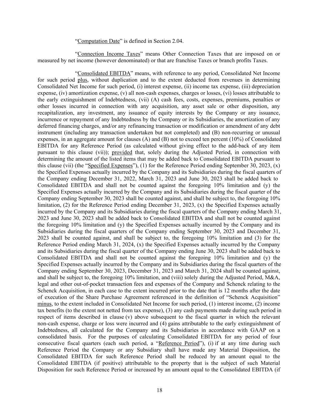 “Computation Date” is defined in Section 2.04. “Connection Income Taxes” means Other Connection Taxes that are imposed on or measured by net income (however denominated) or that are franchise Taxes or branch profits Taxes. “Consolidated EBITDA” means, with reference to any period, Consolidated Net Income for such period plus, without duplication and to the extent deducted from revenues in determining Consolidated Net Income for such period, (i) interest expense, (ii) income tax expense, (iii) depreciation expense, (iv) amortization expense, (v) all non-cash expenses, charges or losses, (vi) losses attributable to the early extinguishment of Indebtedness, (vii) (A) cash fees, costs, expenses, premiums, penalties or other losses incurred in connection with any acquisition, any asset sale or other disposition, any recapitalization, any investment, any issuance of equity interests by the Company or any issuance, incurrence or repayment of any Indebtedness by the Company or its Subsidiaries, the amortization of any deferred financing charges, and/or any refinancing transaction or modification or amendment of any debt instrument (including any transaction undertaken but not completed) and (B) non-recurring or unusual expenses, in an aggregate amount for clauses (A) and (B) not to exceed ten percent (10%) of Consolidated EBITDA for any Reference Period (as calculated without giving effect to the add-back of any item pursuant to this clause (vii)); provided that, solely during the Adjusted Period, in connection with determining the amount of the listed items that may be added back to Consolidated EBITDA pursuant to this clause (vii) (the “Specified Expenses”), (1) for the Reference Period ending September 30, 2023, (x) the Specified Expenses actually incurred by the Company and its Subsidiaries during the fiscal quarters of the Company ending December 31, 2022, March 31, 2023 and June 30, 2023 shall be added back to Consolidated EBITDA and shall not be counted against the foregoing 10% limitation and (y) the Specified Expenses actually incurred by the Company and its Subsidiaries during the fiscal quarter of the Company ending September 30, 2023 shall be counted against, and shall be subject to, the foregoing 10% limitation, (2) for the Reference Period ending December 31, 2023, (x) the Specified Expenses actually incurred by the Company and its Subsidiaries during the fiscal quarters of the Company ending March 31, 2023 and June 30, 2023 shall be added back to Consolidated EBITDA and shall not be counted against the foregoing 10% limitation and (y) the Specified Expenses actually incurred by the Company and its Subsidiaries during the fiscal quarters of the Company ending September 30, 2023 and December 31, 2023 shall be counted against, and shall be subject to, the foregoing 10% limitation and (3) for the Reference Period ending March 31, 2024, (x) the Specified Expenses actually incurred by the Company and its Subsidiaries during the fiscal quarter of the Company ending June 30, 2023 shall be added back to Consolidated EBITDA and shall not be counted against the foregoing 10% limitation and (y) the Specified Expenses actually incurred by the Company and its Subsidiaries during the fiscal quarters of the Company ending September 30, 2023, December 31, 2023 and March 31, 2024 shall be counted against, and shall be subject to, the foregoing 10% limitation, and (viii) solely during the Adjusted Period, M&A, legal and other out-of-pocket transaction fees and expenses of the Company and Schenck relating to the Schenck Acquisition, in each case to the extent incurred prior to the date that is 12 months after the date of execution of the Share Purchase Agreement referenced in the definition of “Schenck Acquisition” minus, to the extent included in Consolidated Net Income for such period, (1) interest income, (2) income tax benefits (to the extent not netted from tax expense), (3) any cash payments made during such period in respect of items described in clause (v) above subsequent to the fiscal quarter in which the relevant non-cash expense, charge or loss were incurred and (4) gains attributable to the early extinguishment of Indebtedness, all calculated for the Company and its Subsidiaries in accordance with GAAP on a consolidated basis. For the purposes of calculating Consolidated EBITDA for any period of four consecutive fiscal quarters (each such period, a “Reference Period”), (i) if at any time during such Reference Period the Company or any Subsidiary shall have made any Material Disposition, the Consolidated EBITDA for such Reference Period shall be reduced by an amount equal to the Consolidated EBITDA (if positive) attributable to the property that is the subject of such Material Disposition for such Reference Period or increased by an amount equal to the Consolidated EBITDA (if 18